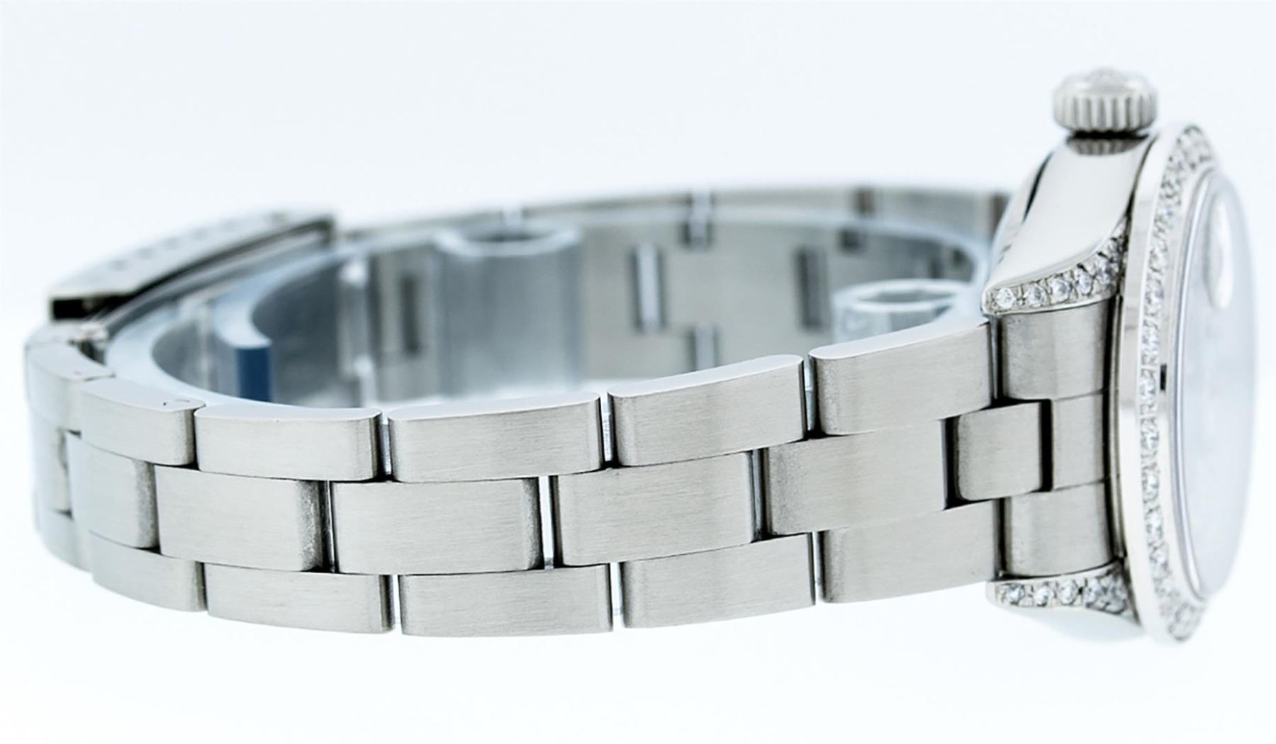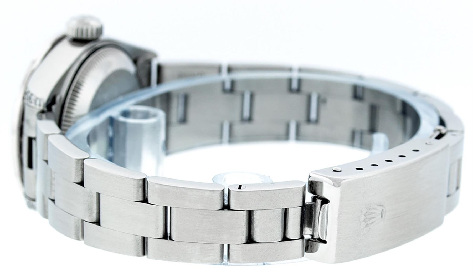 One Quickset Ladies Pre Owned Stainless Steel Rolex Datejust Polished Bright with Satin Finish, Serviced & Electronically Tested, Stainless Steel Case: 26mm, Stainless Steel Crown, Custom Diamond Lugs: 24 Diamonds On Lugs, Clarity: SI-VS, Color: G to H. C