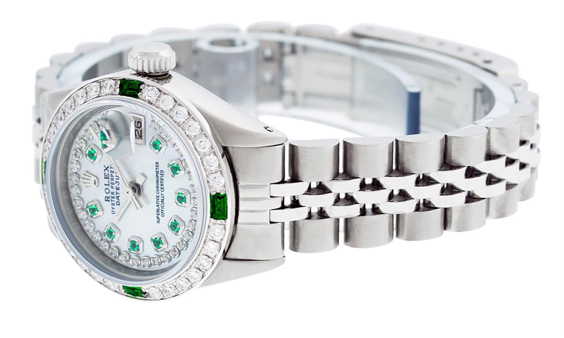 One Ladies Stainless Pre Owned Steel Rolex Datejust Polished Bright with Satin Finish, Serviced & Electronically Tested, Stainless Steel Case: 26mm, Stainless Steel Crown. Custom Bezel: New 18K White Gold Beadset & Emerald Diamond Bezel, Diamond Count: 28 Diamonds + 4 Emeralds. Clarity: SI-VS, Color: G to H. Custom Crystal: New Sapphire With Date Window. Custom Hands: New Luminescent Hands. Rolex Movement: Automatic Winding Movement. Custom Dial: Mother Of Pearl Emerald String Diamond Dial, Stone Count: 10 Diamonds + 33 Diamonds In Dial, G To H In Color, Clarity: SI-VS. Date Window: 3 O'Clock Position Date Display, Model: Datejust. Condition: G-6 Extra Fine. Rolex Bracelet: Stainless Steel Jubilee Band. Bright Polish & Satin Finish. 6.0 Inch Length, Adjustable. Standard Clasp, With Rolex Logo. This Watch Has Been Serviced Time Tested And Is In Excellent Condition It Is Free Of All Scratches And Dents.