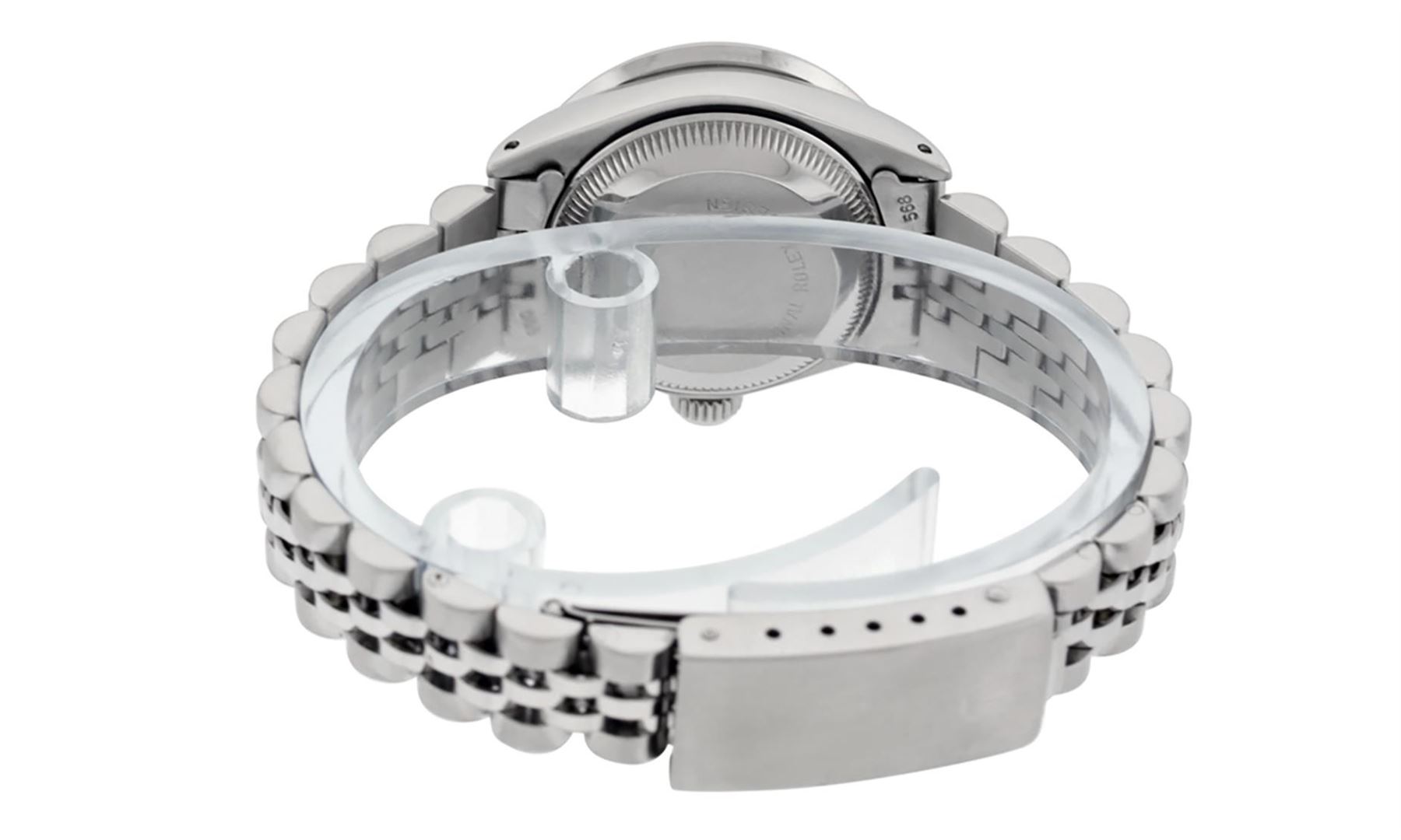Rolex Ladies Stainless Steel Rolex Datejust Polished Bright with Satin Finish, Serviced & Electronically Tested, Stainless Steel Case: 26mm, Stainless Steel Crown, Custom Bezel: New Stainless Steel Beadset Diamond Bezel, Diamond Count: 44 Diamonds Total Weight 1.00 Carat, Clarity: SI-VS, Color: G to H. Custom Crystal: New Synthetic Sapphire Cyclops Lens. Custom Hands: New Luminescent Hands. Movement: Automatic Winding Movement. Custom Dial: Refinished Pink Mother Of Pearl With Diamond Hour Markers, Diamond Count: 10 Diamonds in Dial G To H In Color, Clarity: SI-VS. Date Window: 3 O'Clock Position Date Display, Model: Datejust. Condition: G-6 Extra Fine. Bracelet: Stainless Steel Jubilee Band. Bright Polish & Satin Finish. 6.0 Inch Length, Adjustable. Standard Clasp, With Rolex Logo. This Watch Has Been Serviced Time Tested And Is In Excellent Condition It Is Free Of All Scratches And Dents.