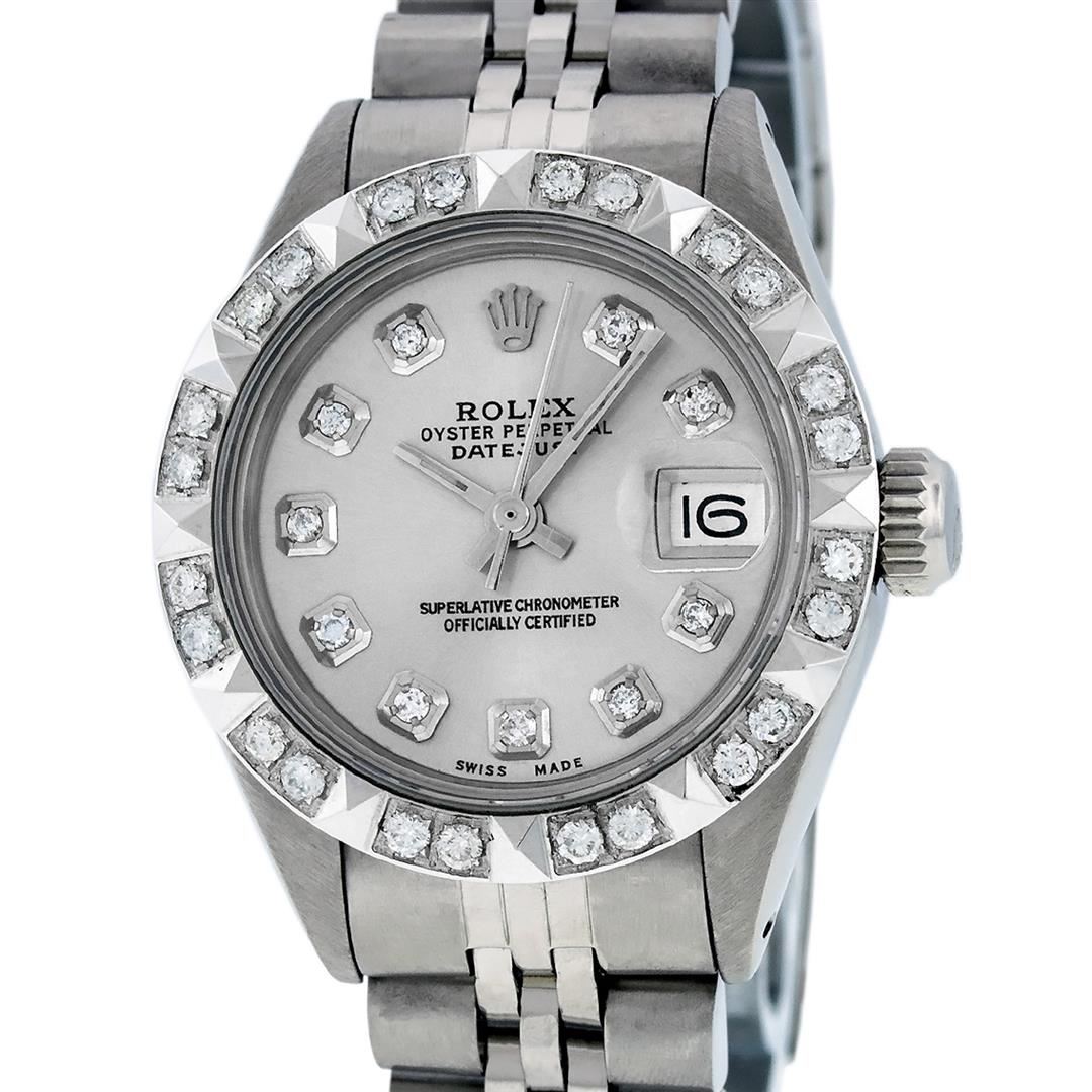 One Ladies Stainless Steel Rolex Datejust Polished Bright with Satin Finish, Serviced & Electronically Tested, Stainless Steel Case: 26mm, Stainless Steel Crown, Custom Bezel: New 18K White Gold Pyramid Diamond Bezel, Diamond Count: 24 Diamonds In Dial. Total Weight .50 Carat, Clarity: SI-VS, Color: G to H. Custom Crystal: New Scratch Resistant Synthetic Sapphire Cyclops Lens. Custom Hands: New Luminescent Hands. Movement: Automatic Winding Movement. Custom Dial: Silver Diamond Dial. Diamond Count: 10 Diamonds In Dial. Clarity: SI-VS, Color: G to H. Date Window: 3 O'Clock Position Date Display, Model: Datejust. Condition: G-6 Extra Fine. Bracelet: Stainless Steel Jubilee Band With Rolex Crown On Buckle. Bright Polish & Satin Finish. Band Length: 6.0 Inch Length, Adjustable. Standard Clasp, With Rolex Logo. This Watch Has Been Serviced Time Tested And Is In Excellent Condition It Is Free Of All Scratches And Dents.