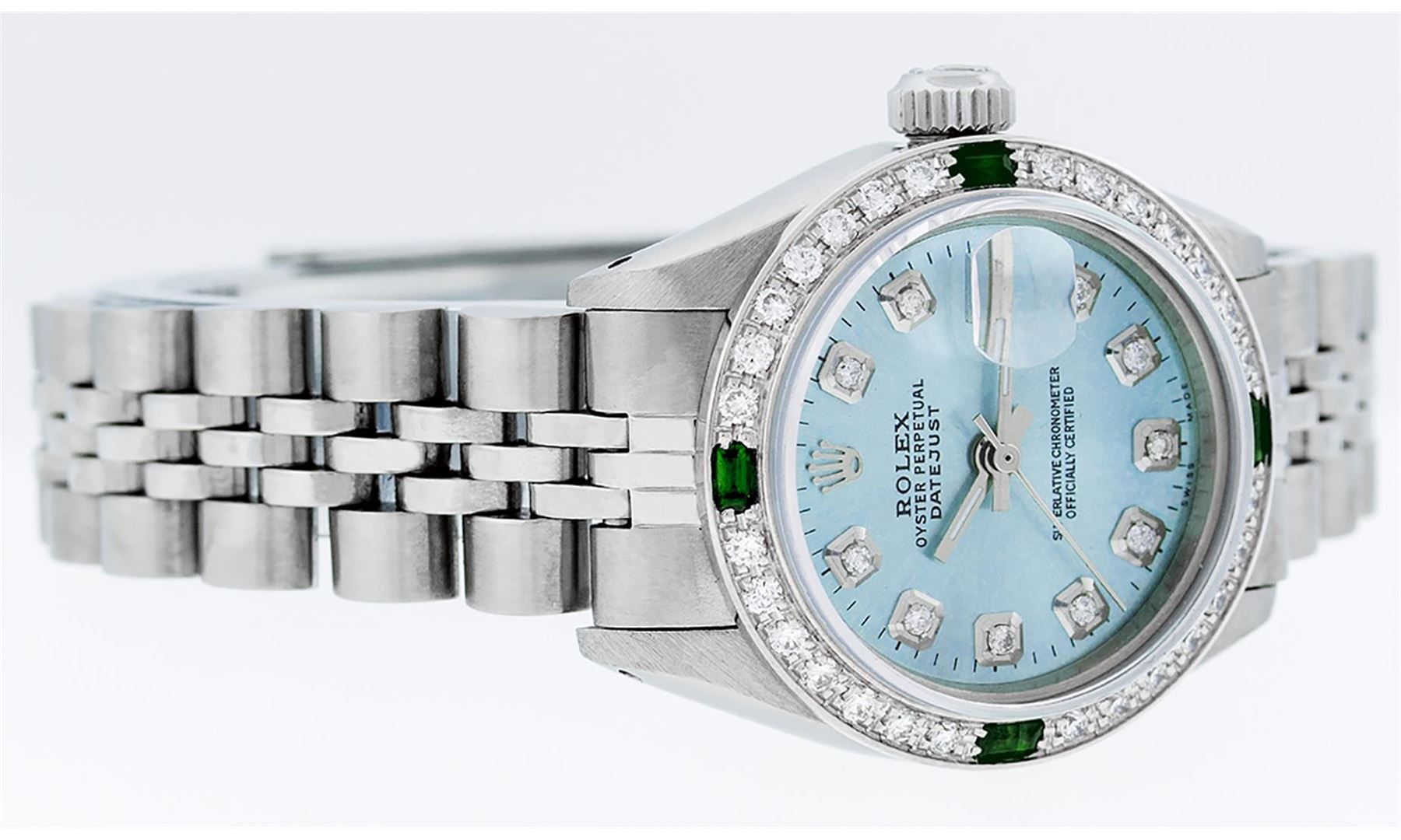 One Ladies Stainless Steel Rolex Datejust Polished Bright with Satin Finish, Serviced & Electronically Tested, Stainless Steel Case: 26mm, Stainless Steel Crown, Custom Bezel: New 18K White Gold Emerald Beadset Diamond Bezel, Diamond + Gem Count: 28 Diamonds + 4 Emeralds. Total Weight .70 Carat, Clarity: SI-VS, Color: G to H. Custom Crystal: New Scratch Resistant Synthetic Sapphire Cyclops Lens. Custom Hands: New Luminescent Hands. Movement: Automatic Winding Movement. Custom Dial: Refinished Sky Blue With Diamond Hour Markers & Dash Tracks, 10 Diamonds in Dial, G To H In Color, Clarity: SI-VS. Date Window: 3 O'Clock Position Date Display, Model: Datejust. Condition: G-6 Extra Fine. Bracelet: Stainless Steel Jubilee Band. Bright Polish & Satin Finish. 6.0 Inch Length, Adjustable. Standard Clasp, With Rolex Logo. This Watch Has Been Serviced Time Tested And Is In Excellent Condition It Is Free Of All Scratches And Dents.