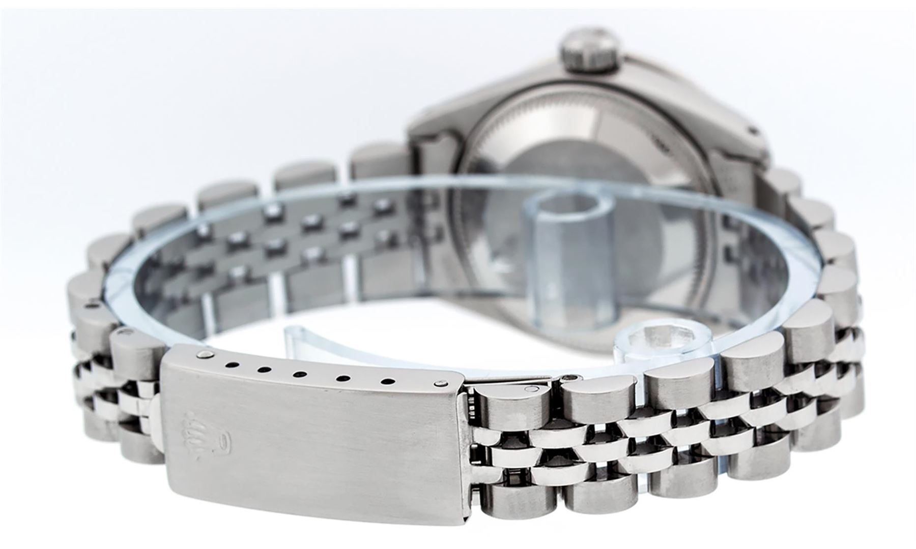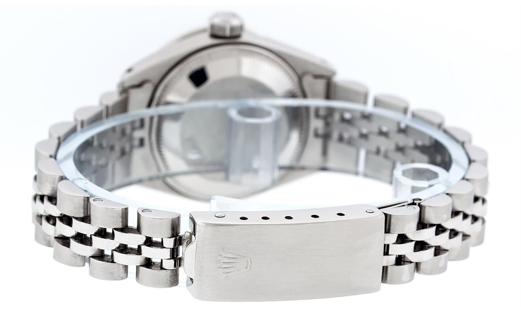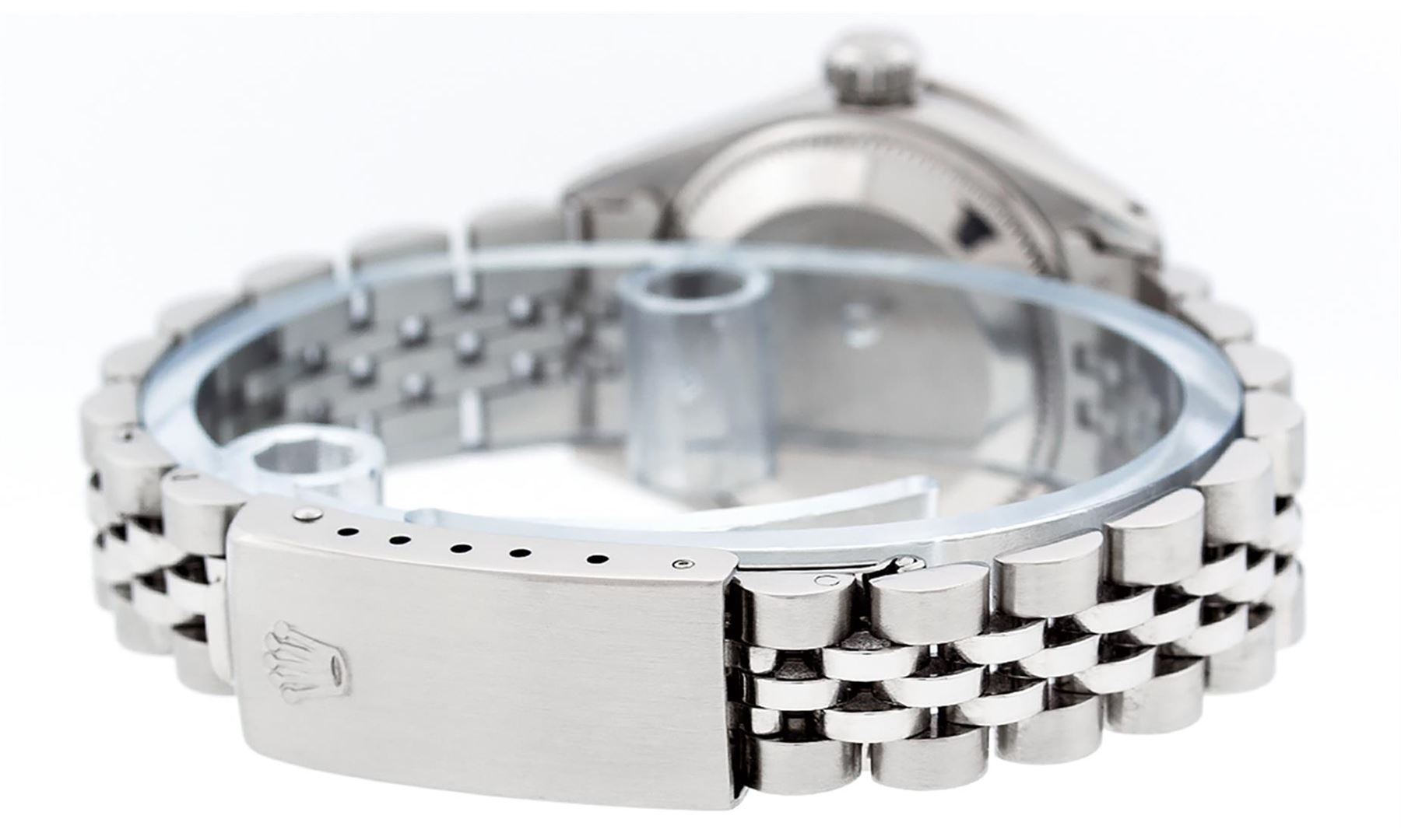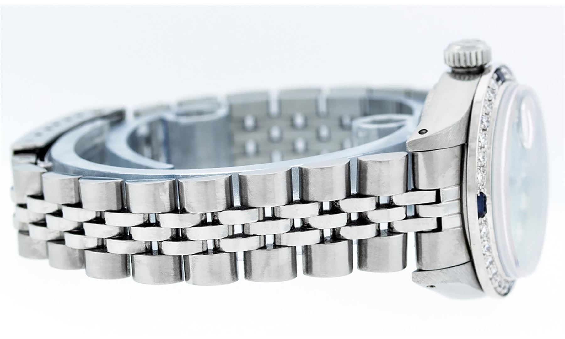 One Ladies Stainless Steel Rolex Datejust Polished Bright with Satin Finish, Serviced & Electronically Tested, Stainless Steel Case: 26mm, Stainless Steel Crown, Custom Bezel: New 18K White Gold Emerald Beadset Diamond Bezel, Diamond + Gem Count: 28 Diamonds + 4 Emeralds. Total Weight .70 Carat, Clarity: SI-VS, Color: G to H. Custom Crystal: New Scratch Resistant Synthetic Sapphire Cyclops Lens. Custom Hands: New Luminescent Hands. Movement: Automatic Winding Movement. Custom Dial: Refinished Sky Blue With Diamond Hour Markers & Dash Tracks, 10 Diamonds in Dial, G To H In Color, Clarity: SI-VS. Date Window: 3 O'Clock Position Date Display, Model: Datejust. Condition: G-6 Extra Fine. Bracelet: Stainless Steel Jubilee Band. Bright Polish & Satin Finish. 6.0 Inch Length, Adjustable. Standard Clasp, With Rolex Logo. This Watch Has Been Serviced Time Tested And Is In Excellent Condition It Is Free Of All Scratches And Dents.