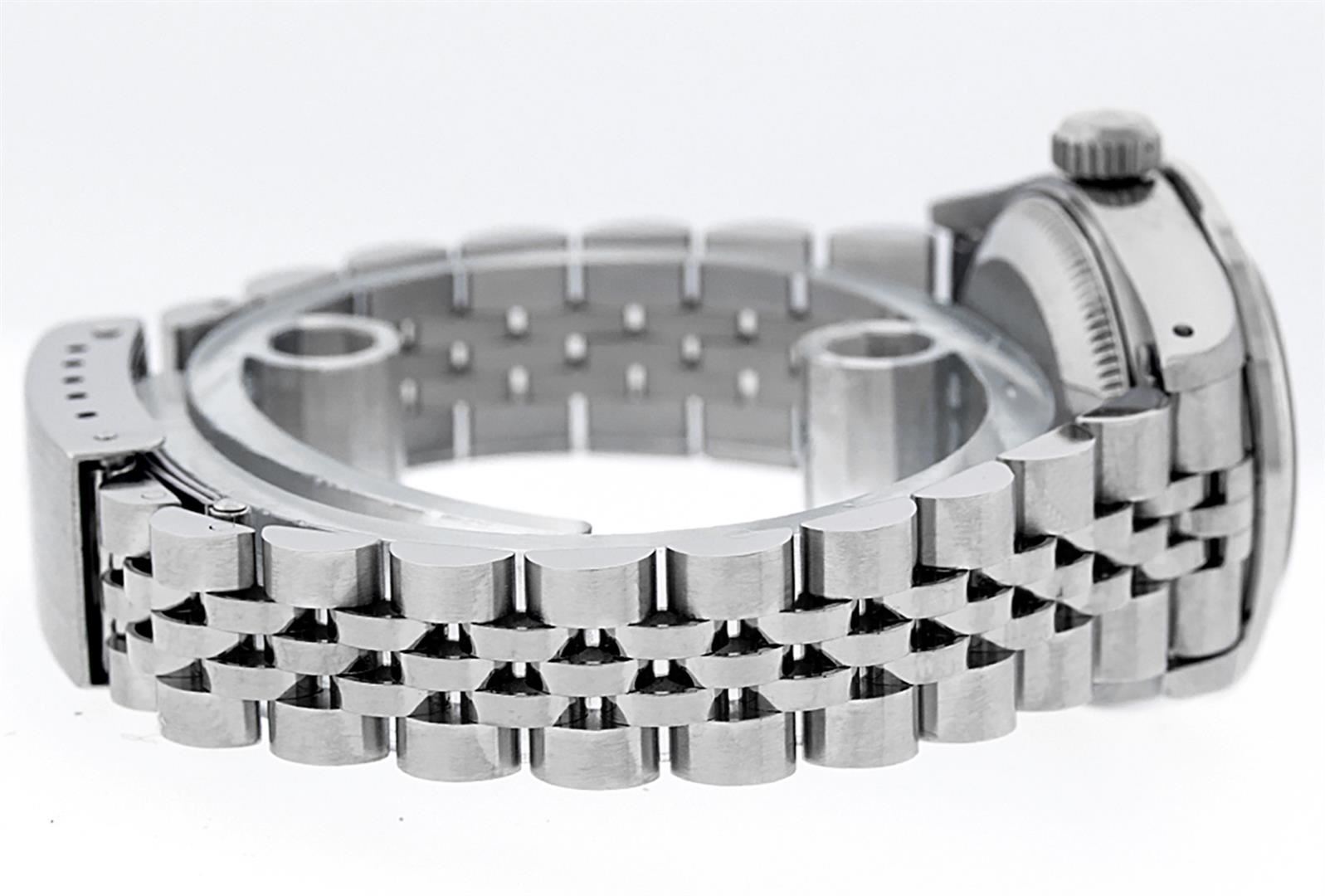 One Ladies Stainless Steel Rolex Oyster Perpetual Datejust Polished Bright with Satin Finish, Serviced & Electronically Tested, Stainless Steel Case: 26mm, Stainless Steel Crown. Custom Bezel: New 18K White Gold Beadset Diamond Bezel, Diamond Count: 32 Diamonds. Total Weight .70 Carat, Clarity: SI-VS, Color: G to H. Custom Crystal: New Scratch Resistant Synthetic Sapphire Cyclops Lens. Custom Hands: New Luminescent Hands. Movement: Automatic Winding Movement. Custom Dial: Refinished Slate Grey String Diamond Dial, Stone Count: 43 Diamonds In Dial, G To H In Color, Clarity: SI-VS. Date Window: 3 O'Clock Position Date Display, Model: Datejust. Condition: G-6 Extra Fine. Bracelet: Stainless Steel Jubilee Band. Bright Polish & Satin Finish. 6.0 Inch Length, Adjustable. Standard Clasp, With Rolex Logo. This Watch Has Been Serviced Time Tested And Is In Excellent Condition It Is Free Of All Scratches And Dents.