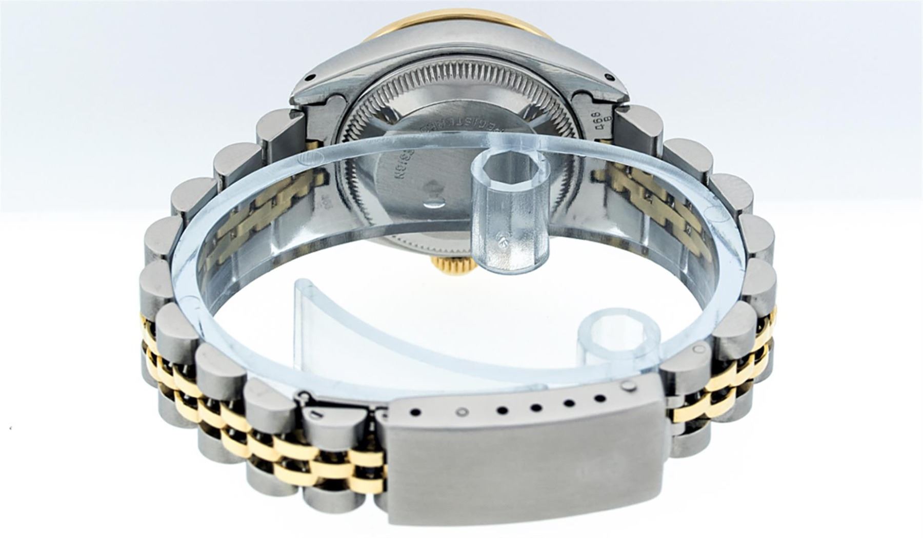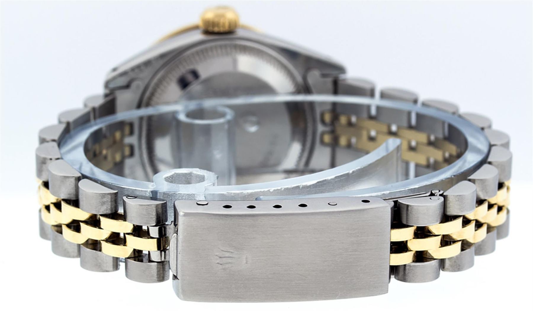 One Ladies Two Tone Rolex Datejust Polished, Serviced & Electronically Tested, Yellow Gold & Stainless Steel Case: 26mm, Yellow Gold Crown, Diamond Lugs: 24 Diamonds On Lugs, Clarity: SI-VS, Color: G to H, Clarity SI-VS. Custom Bezel: New 18K Yellow Gold Beadset Diamond Bezel, Diamond Count: 32 Diamonds In Bezel, Total Bezel Weight .70 Carat, Clarity: SI-VS, Color: G to H. Custom Crystal: New Scratch Resistant Synthetic Sapphire Cyclops Lens. Custom Hands: New Luminescent Hands. Movement: Automatic Winding Movement. Custom Dial: Pink Mother Of Pearl With Diamond Hour Markers, Diamond Count: 10 Diamonds In Dial, Clarity: SI-VS, Color: G to H. Date Window: 3 O'Clock Position Date Display, Model: Datejust. Condition: G-6 Extra Fine. Bracelet: Two Tone Yellow Gold & Stainless Steel Jubilee Band. Bright Polish. 6.0 Inch Length, Adjustable. Standard Clasp, With Rolex Logo. This Watch Has Been Serviced Time Tested And Is In Excellent Condition It Is Free Of All Scratches And Dents.