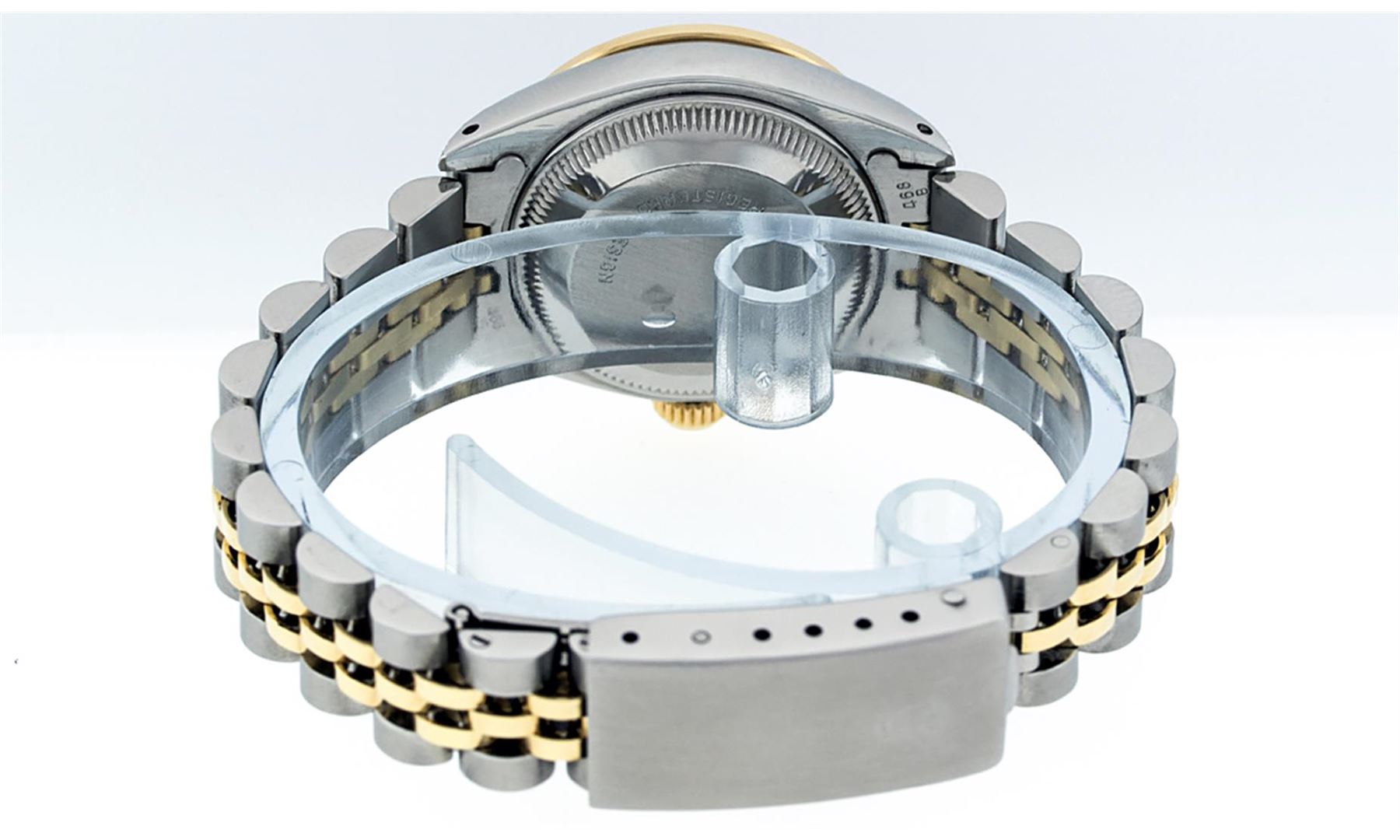 One Ladies Two Tone Rolex Datejust Polished, Serviced & Electronically Tested, Yellow Gold & Stainless Steel Case: 26mm, Yellow Gold Crown, Diamond Lugs: 24 Diamonds On Lugs, Clarity: SI-VS, Color: G to H, Clarity SI-VS. Custom Bezel: New 18K Yellow Gold Beadset Diamond Bezel, Diamond Count: 32 Diamonds In Bezel, Total Bezel Weight .70 Carat, Clarity: SI-VS, Color: G to H. Custom Crystal: New Scratch Resistant Synthetic Sapphire Cyclops Lens. Custom Hands: New Luminescent Hands. Movement: Automatic Winding Movement. Custom Dial: Pink Mother Of Pearl With Diamond Hour Markers, Diamond Count: 10 Diamonds In Dial, Clarity: SI-VS, Color: G to H. Date Window: 3 O'Clock Position Date Display, Model: Datejust. Condition: G-6 Extra Fine. Bracelet: Two Tone Yellow Gold & Stainless Steel Jubilee Band. Bright Polish. 6.0 Inch Length, Adjustable. Standard Clasp, With Rolex Logo. This Watch Has Been Serviced Time Tested And Is In Excellent Condition It Is Free Of All Scratches And Dents.