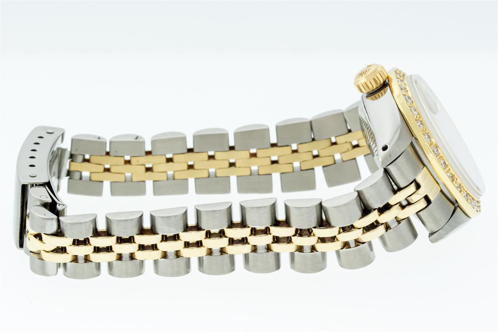 One Ladies Pre Owned Quickset 18K Yellow Gold and Stainless Steel Two Tone Rolex Wristwatch Polished Bright with Satin Finish, Serviced & Electronically Tested, Rolex Stainless Steel Case: 26mm, Rolex Yellow Gold Crown, Custom Bezel: New 18K Yellow Gold Beadset Diamond Bezel, Diamond Count: 32 Diamonds On Bezel. Custom Crystal: New Sapphire With Magnified Date Window. Custom Hands: New Hands. Rolex Movement: Automatic Winding Movement. Rolex Dial: Champagne Dial With Roman Hour Markers And Square Track, Date Window: 3 O'Clock Position Date Display, Model: Datejust, Condition: G-6 Extra Fine. Rolex Bracelet: Stainless Steel and 18K Yellow Gold Jubilee Band. Bright Polish & Satin Finish. 6.0 Inch Length, Adjustable. Standard Clasp, With Rolex Logo. This Watch Has Been Serviced Time Tested And Is In Excellent Condition It Is Free Of All Scratches And Dents.