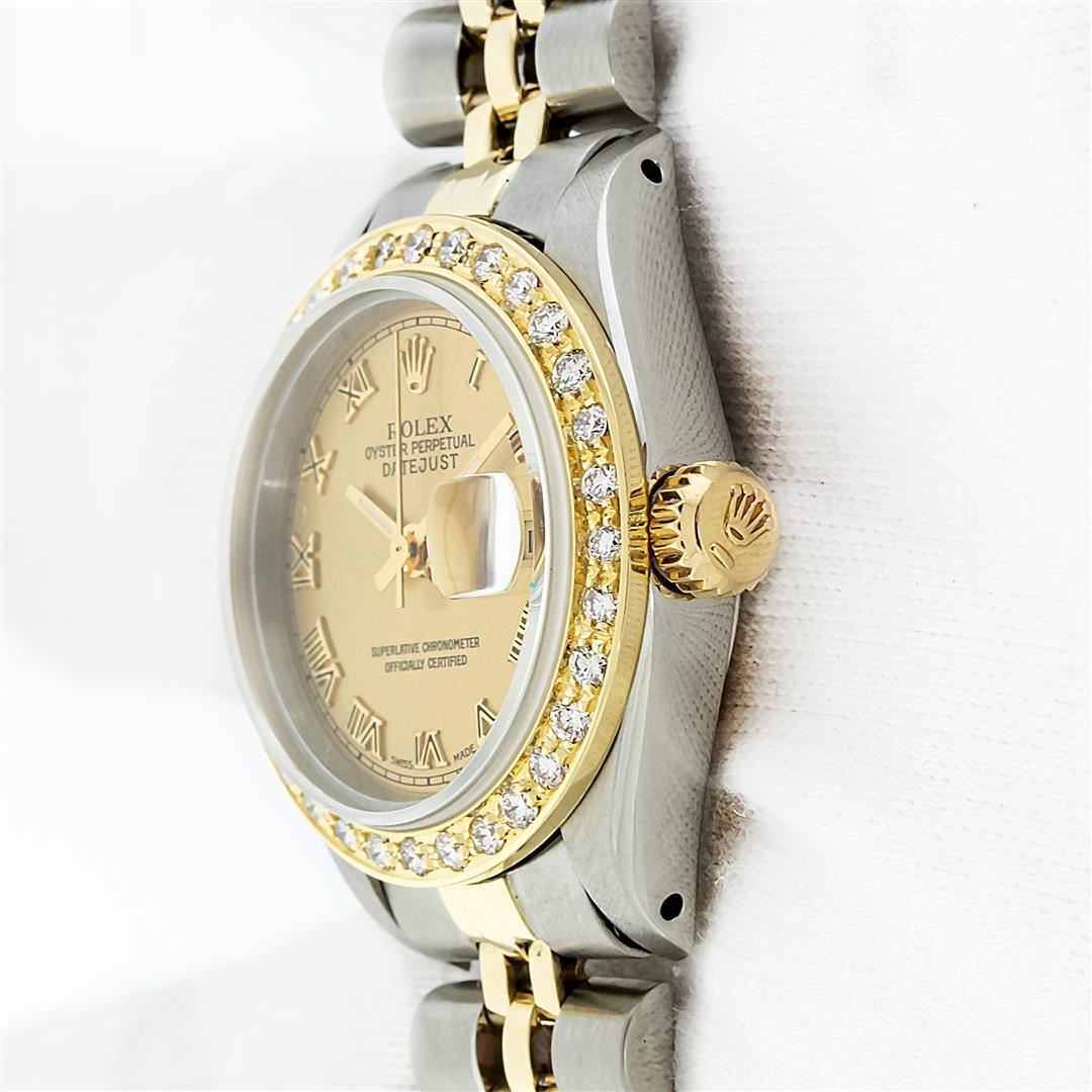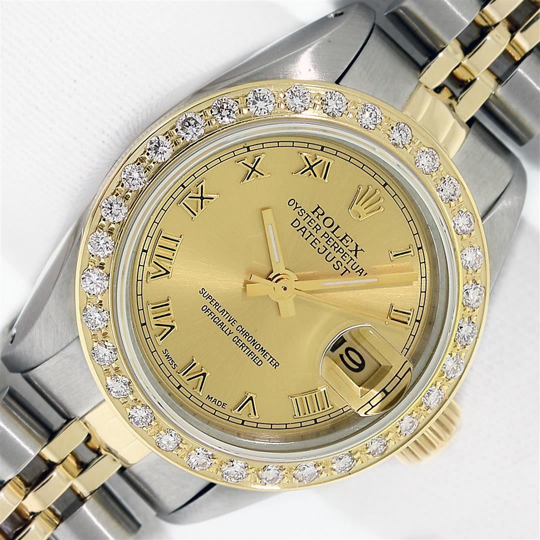 One Ladies Pre Owned Quickset 18K Yellow Gold and Stainless Steel Two Tone Rolex Wristwatch Polished Bright with Satin Finish, Serviced & Electronically Tested, Rolex Stainless Steel Case: 26mm, Rolex Yellow Gold Crown, Custom Bezel: New 18K Yellow Gold Beadset Diamond Bezel, Diamond Count: 32 Diamonds On Bezel. Custom Crystal: New Sapphire With Magnified Date Window. Custom Hands: New Hands. Rolex Movement: Automatic Winding Movement. Rolex Dial: Champagne Dial With Roman Hour Markers And Square Track, Date Window: 3 O'Clock Position Date Display, Model: Datejust, Condition: G-6 Extra Fine. Rolex Bracelet: Stainless Steel and 18K Yellow Gold Jubilee Band. Bright Polish & Satin Finish. 6.0 Inch Length, Adjustable. Standard Clasp, With Rolex Logo. This Watch Has Been Serviced Time Tested And Is In Excellent Condition It Is Free Of All Scratches And Dents.