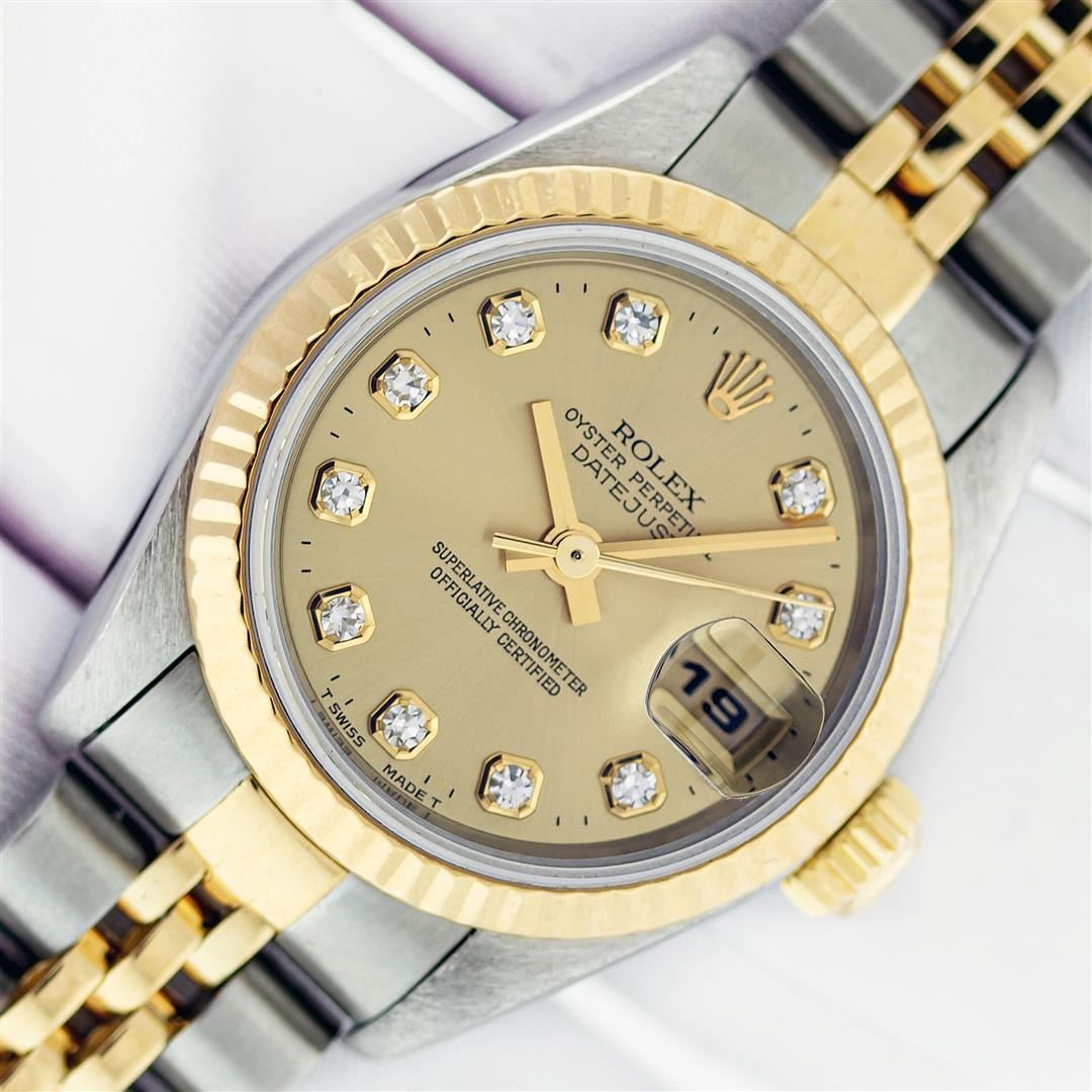 One Ladies Quickset Pre Owned Two Tone 18K Yellow Gold & Stainless Steel Rolex Datejust Polished, Serviced & Electronically Tested, Rolex Yellow Gold & Stainless Steel Case: 26mm, Rolex Yellow Gold Crown, Rolex Bezel: Rolex Yellow Gold Fluted Bezel. Crystal: Sapphire Crystal With Date Window. Hands: Solid Hands. Rolex Movement: Quickset Automatic Winding Movement. Rolex Factory Dial: Champagne With Diamond Hour Markers And Dash Track, Diamond Count: 10 Diamonds In Dial. Date Window: 3 O'Clock Position Date Display, Model: Quickset Datejust. Condition: G-6 Extra Fine. Rolex Bracelet: Two Tone 18K Yellow Gold & Stainless Steel Jubilee Band. Bright Polish. 6.0 Inch Length, Adjustable. Standard Clasp, With Rolex Logo. This Pre Owned Watch Has Been Serviced Time Tested And Is In Excellent Condition It Is Free Of All Scratches And Dents. This Watch Comes With A Rolex Box, Booklets, And Wallet.