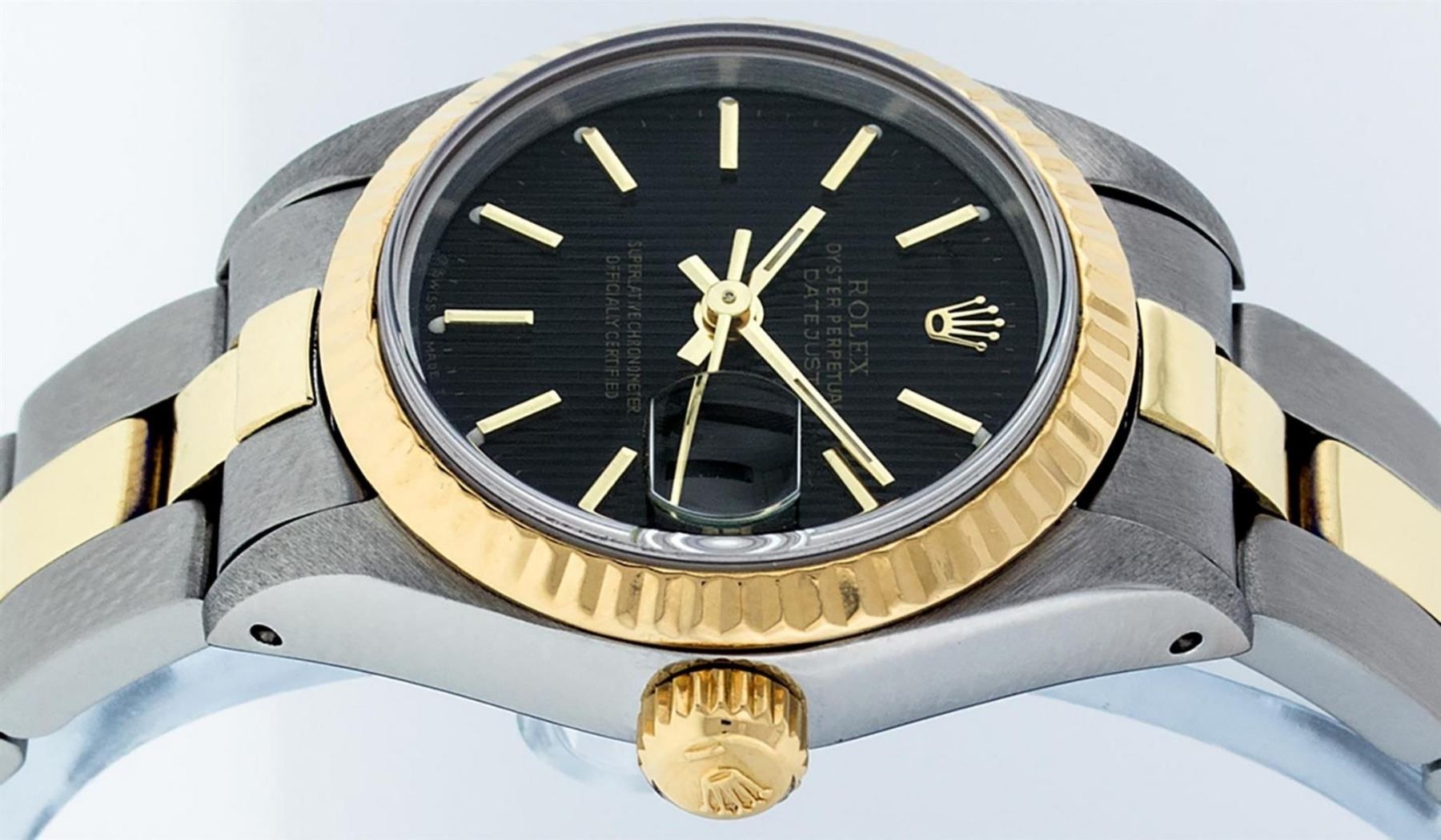 One Ladies Two Tone Yellow Gold And Stainless Steel Rolex Datejust Polished, Serviced & Electronically Tested, Yellow Gold & Stainless Steel Case: 26mm, Yellow Gold Crown, Bezel: Yellow Gold Fluted Bezel. Custom Crystal: New Acrylic Cyclops Lens. Custom Hands: New Luminescent Hands. Movement: Automatic Winding Movement. Dial: Black Tapestry With Index Hour Markers. Date Window: 3 O'Clock Position Date Display, Model: Datejust. Condition: G-6 Extra Fine. Bracelet: Two Tone Yellow Gold & Stainless Steel Oyster Band. Bright Polish. 6.0 Inch Length, Adjustable. Standard Clasp, With Rolex Logo. This Watch Has Been Serviced Time Tested And Is In Excellent Condition It Is Free Of All Scratches And Dents.