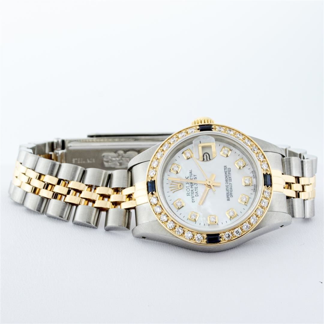 One Ladies Pre Owned Two Tone Yellow Gold And Stainless Steel Rolex Datejust Polished, Serviced & Electronically Tested, Yellow Gold & Stainless Steel Case: 26mm, Yellow Gold Crown, Custom Bezel: New 18K Yellow Gold Sapphire Beadset Diamond Bezel, Diamond