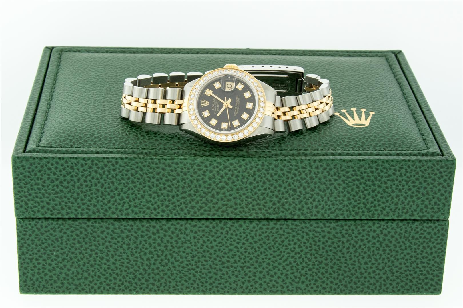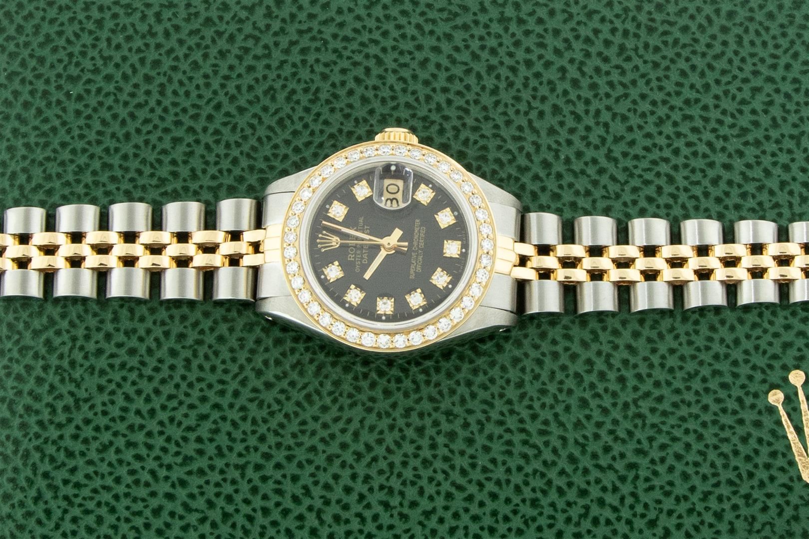 One Ladies Two Tone Rolex Datejust Polished, Serviced & Electronically Tested, Yellow Gold & Stainless Steel Case: 26mm, Yellow Gold Crown, Custom Bezel: New 18K 1ctw Yellow Gold Beadset Diamond Bezel, Diamond Count: 44 Diamonds, Total Weight 1.00 Carat, Clarity: Si-VS, Color: G to H. Custom Crystal: New Synthetic Sapphire Cyclops Lens. Custom Hands: New Luminescent Hands. Movement: Automatic Winding Movement. Custom Dial: Mother Of Pearl String Diamond Dial, Diamond Count: 43 Single Cut Diamonds in Dial, G To H In Color, VS Clarity. Date Window: 3 O'Clock Position Date Display, Model: Datejust, Condition: G-6 Extra Fine. Bracelet: Two Tone Yellow Gold & Stainless Steel Jubilee. Bright Polish. 6.0 Inch Length, Adjustable. Standard Clasp, With Rolex Logo. This Watch Has Been Serviced Time Tested And Is In Excellent Condition It Is Free Of All Scratches And Dents.