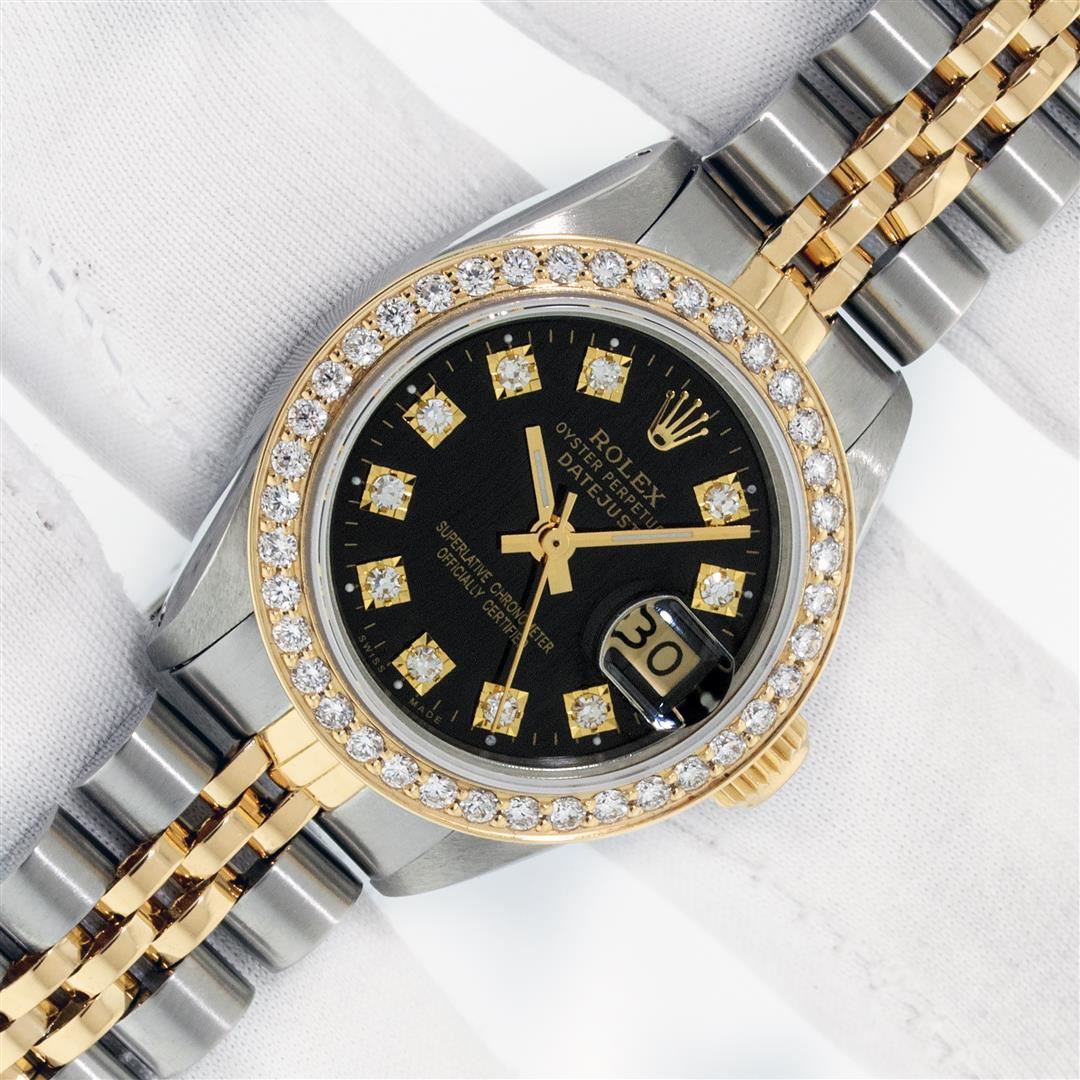 One Ladies Two Tone Rolex Datejust Polished, Serviced & Electronically Tested, Yellow Gold & Stainless Steel Case: 26mm, Yellow Gold Crown, Custom Bezel: New 18K 1ctw Yellow Gold Beadset Diamond Bezel, Diamond Count: 44 Diamonds, Total Weight 1.00 Carat, Clarity: Si-VS, Color: G to H. Custom Crystal: New Synthetic Sapphire Cyclops Lens. Custom Hands: New Luminescent Hands. Movement: Automatic Winding Movement. Custom Dial: Mother Of Pearl String Diamond Dial, Diamond Count: 43 Single Cut Diamonds in Dial, G To H In Color, VS Clarity. Date Window: 3 O'Clock Position Date Display, Model: Datejust, Condition: G-6 Extra Fine. Bracelet: Two Tone Yellow Gold & Stainless Steel Jubilee. Bright Polish. 6.0 Inch Length, Adjustable. Standard Clasp, With Rolex Logo. This Watch Has Been Serviced Time Tested And Is In Excellent Condition It Is Free Of All Scratches And Dents.