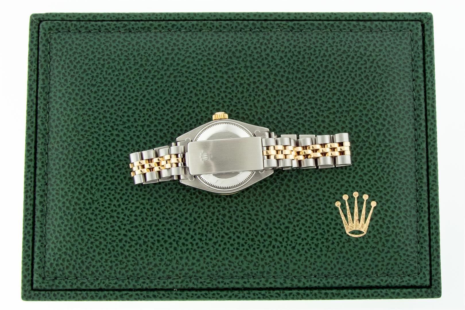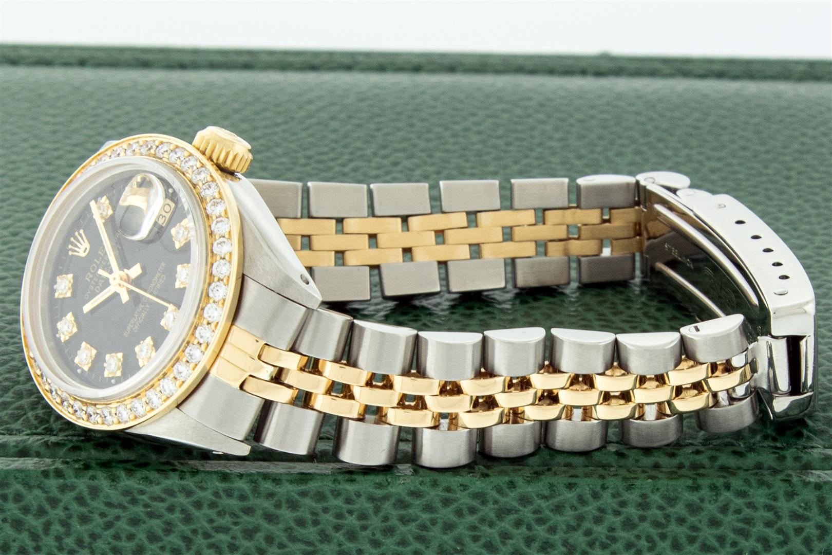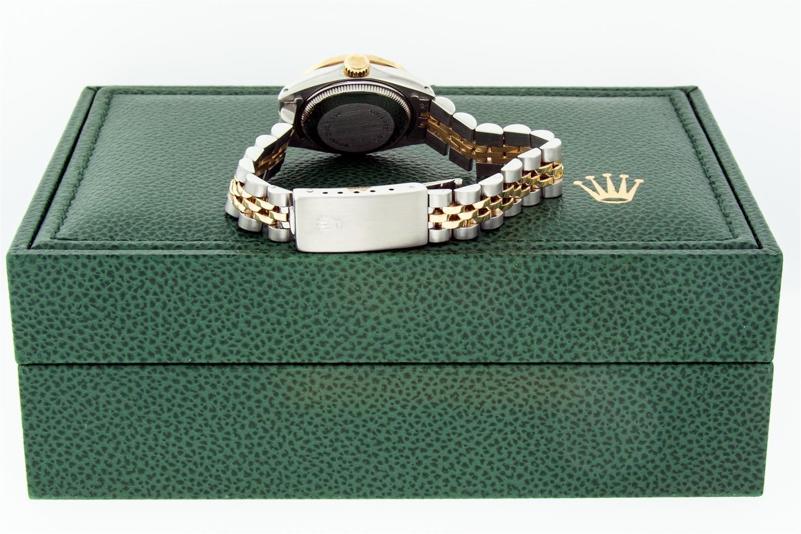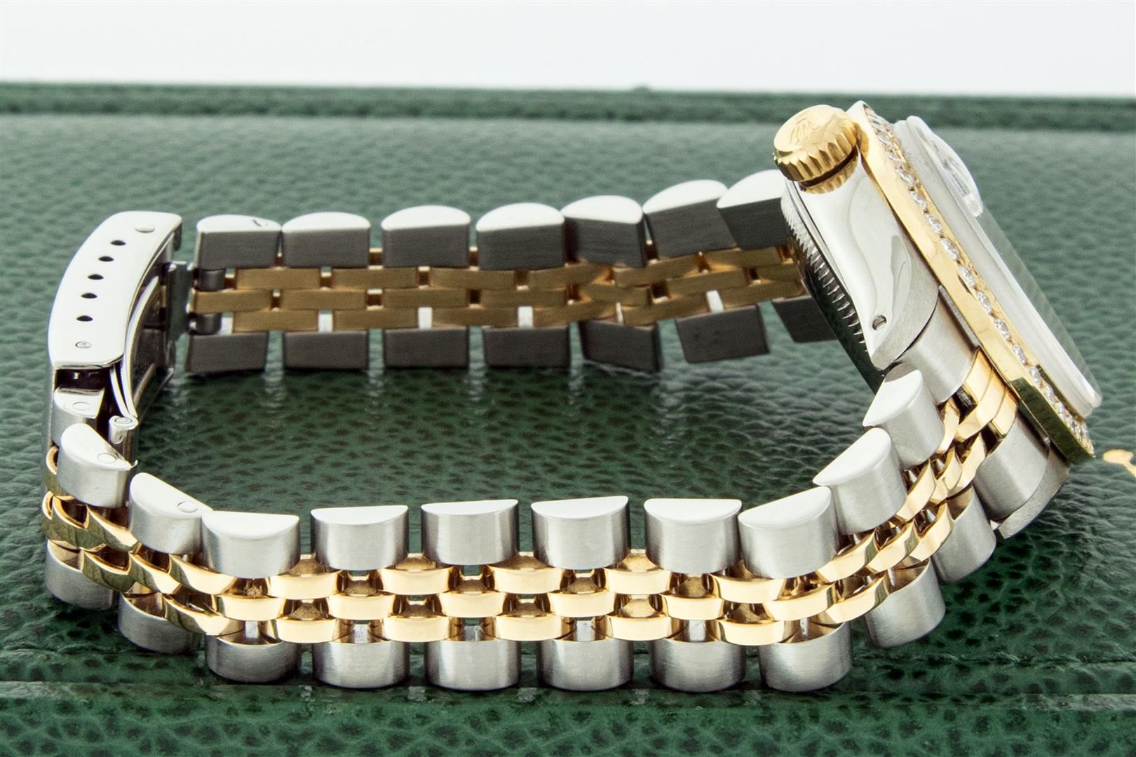 One Ladies Two Tone Rolex Datejust Polished, Serviced & Electronically Tested, Yellow Gold & Stainless Steel Case: 26mm, Yellow Gold Crown, Custom Bezel: New 18K 1ctw Yellow Gold Beadset Diamond Bezel, Diamond Count: 44 Diamonds, Total Weight 1.00 Carat, Clarity: Si-VS, Color: G to H. Custom Crystal: New Synthetic Sapphire Cyclops Lens. Custom Hands: New Luminescent Hands. Movement: Automatic Winding Movement. Custom Dial: Mother Of Pearl String Diamond Dial, Diamond Count: 43 Single Cut Diamonds in Dial, G To H In Color, VS Clarity. Date Window: 3 O'Clock Position Date Display, Model: Datejust, Condition: G-6 Extra Fine. Bracelet: Two Tone Yellow Gold & Stainless Steel Jubilee. Bright Polish. 6.0 Inch Length, Adjustable. Standard Clasp, With Rolex Logo. This Watch Has Been Serviced Time Tested And Is In Excellent Condition It Is Free Of All Scratches And Dents.