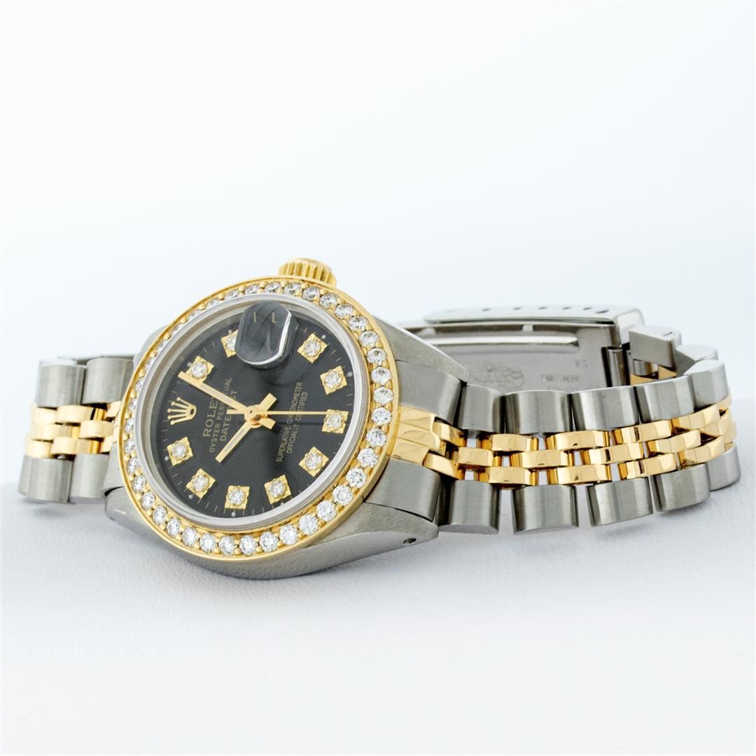 One Ladies Two Tone Rolex Datejust Polished, Serviced & Electronically Tested, Yellow Gold & Stainless Steel Case: 26mm, Yellow Gold Crown, Custom Bezel: New 18K 1ctw Yellow Gold Beadset Diamond Bezel, Diamond Count: 44 Diamonds, Total Weight 1.00 Carat, Clarity: Si-VS, Color: G to H. Custom Crystal: New Synthetic Sapphire Cyclops Lens. Custom Hands: New Luminescent Hands. Movement: Automatic Winding Movement. Custom Dial: Mother Of Pearl String Diamond Dial, Diamond Count: 43 Single Cut Diamonds in Dial, G To H In Color, VS Clarity. Date Window: 3 O'Clock Position Date Display, Model: Datejust, Condition: G-6 Extra Fine. Bracelet: Two Tone Yellow Gold & Stainless Steel Jubilee. Bright Polish. 6.0 Inch Length, Adjustable. Standard Clasp, With Rolex Logo. This Watch Has Been Serviced Time Tested And Is In Excellent Condition It Is Free Of All Scratches And Dents.