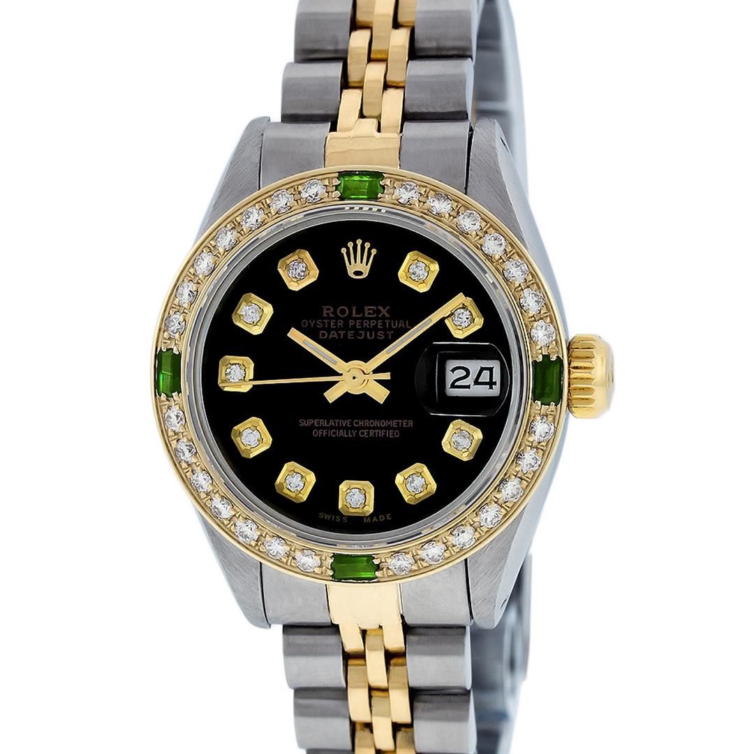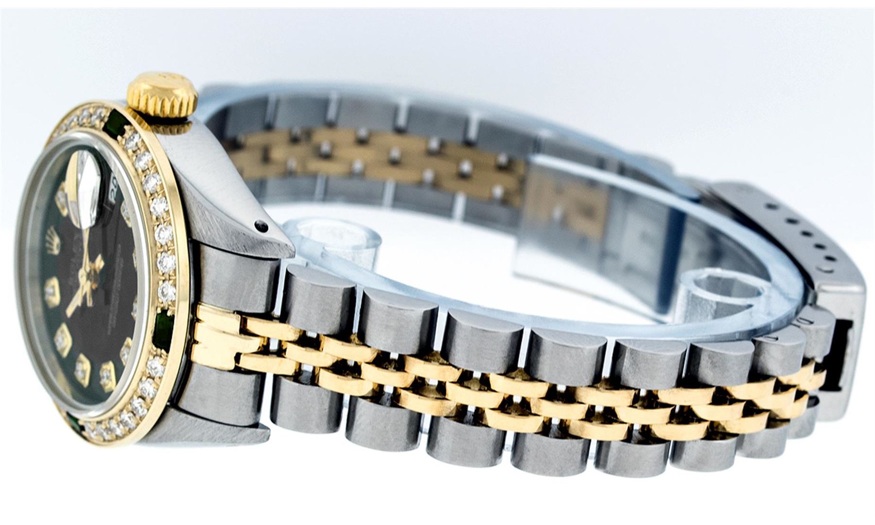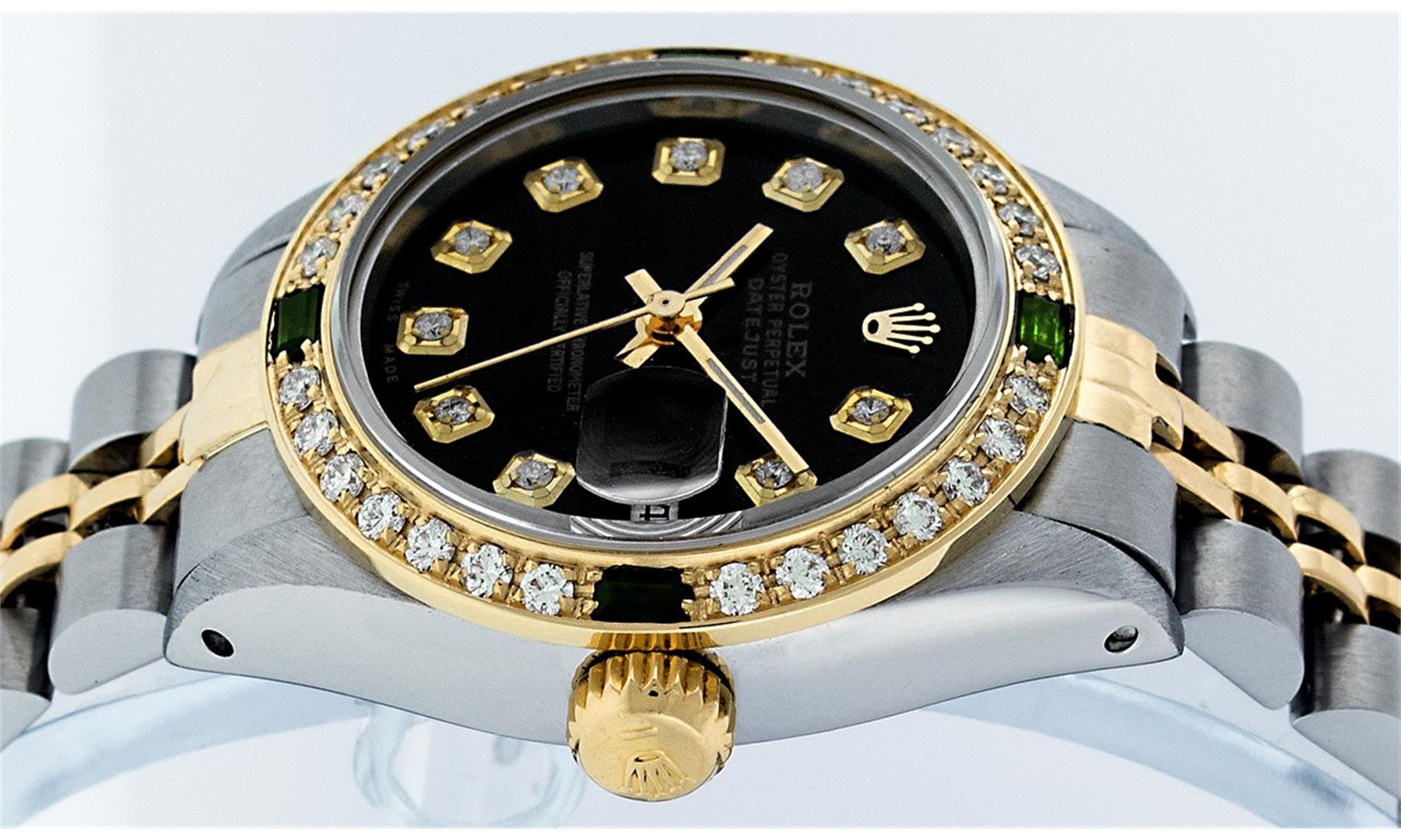 One Ladies Two Tone Rolex Datejust Polished, Serviced & Electronically Tested, 14K Yellow Gold & Stainless Steel Case:26mm, 14K Yellow Gold Crown, Custom Bezel: 18K Yellow Gold Emerald Beadset Diamond Bezel, Diamond Count: 28 Diamonds + 4 Emeralds Total Weight .70 Carat, Clarity: Si-VS, Color: G to H. Custom Crystal: Synthetic Sapphire Cyclops Lens. Movement: Automatic Winding Movement Caliber 2030. Custom Dial: Black With Diamond Hour Markers, Diamond Count: 10 Diamonds In Dial. Diamond Color: G To H, Clarity: SI-VS. Date Window: 3 O'Clock Position Date Display, Model: Datejust. Condition: G-6 Extra Fine. Bracelet: Two Tone 14K Yellow Gold & Stainless Steel Jubilee Band. Bright Polish. 5.5 Inch Length, Adjustable. Standard Clasp, With Rolex Logo.