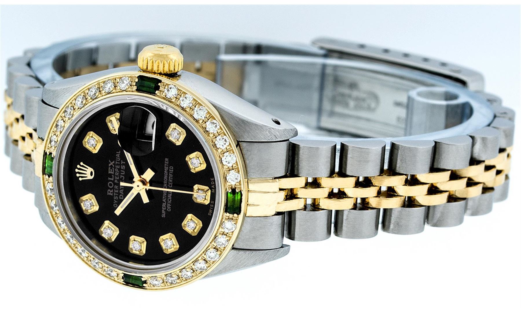 One Ladies Two Tone Rolex Datejust Polished, Serviced & Electronically Tested, 14K Yellow Gold & Stainless Steel Case:26mm, 14K Yellow Gold Crown, Custom Bezel: 18K Yellow Gold Emerald Beadset Diamond Bezel, Diamond Count: 28 Diamonds + 4 Emeralds Total Weight .70 Carat, Clarity: Si-VS, Color: G to H. Custom Crystal: Synthetic Sapphire Cyclops Lens. Movement: Automatic Winding Movement Caliber 2030. Custom Dial: Black With Diamond Hour Markers, Diamond Count: 10 Diamonds In Dial. Diamond Color: G To H, Clarity: SI-VS. Date Window: 3 O'Clock Position Date Display, Model: Datejust. Condition: G-6 Extra Fine. Bracelet: Two Tone 14K Yellow Gold & Stainless Steel Jubilee Band. Bright Polish. 5.5 Inch Length, Adjustable. Standard Clasp, With Rolex Logo.