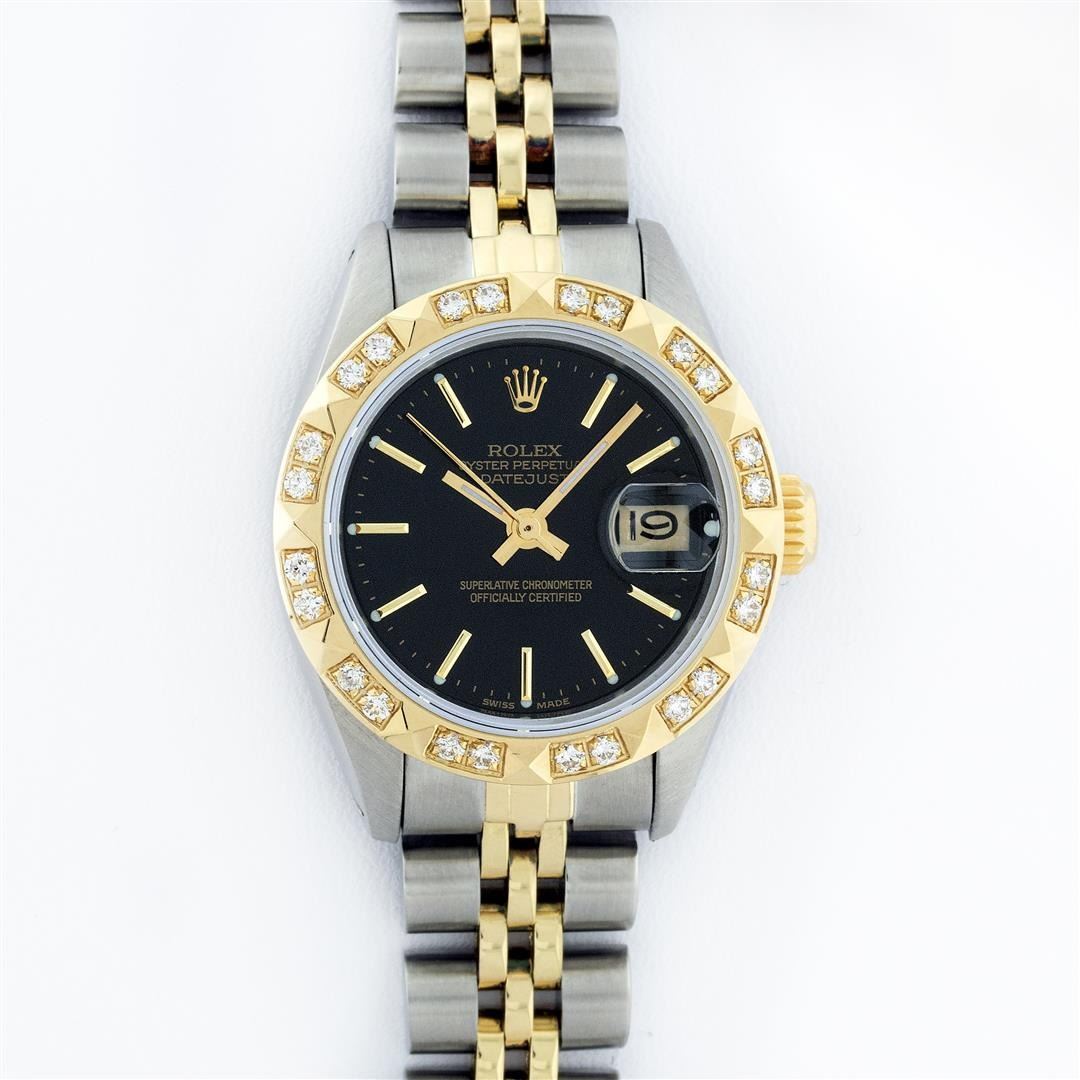 One Ladies Pre Owned Rolex Two Tone 14K Yellow Gold & Stainless Steel Rolex Polished, Serviced & Electronically Tested, Rolex 14K Yellow Gold & Stainless Steel Case: 26mm, Rolex Yellow Gold Crown, Custom Bezel: New 18K Yellow Gold Pyramid Diamond Bezel, Diamond Count: 24 Diamonds In Bezel. Total Weight.50 Carat, Clarity: SI-VS, Color: G to H. Custom Crystal: New Sapphire With Magnified Date Window. Custom Hands: New Luminescent Hands. Rolex Movement: Automatic Winding Movement 2030. Rolex Dial: Black With Index Hour Markers With Dash Track & Lumi Dots. Date Window: 3 O'Clock Position Date Display, Model: Date. Condition: G-6 Extra Fine. Rolex Bracelet: Two Tone 14K Yellow Gold & Stainless Steel Jubilee Band. Bright Polish. 6.0 Inch Length, Adjustable. Standard Clasp, With Rolex Logo. This Watch Has Been Serviced Time Tested And Is In Excellent Condition It Is Free Of All Scratches And Dents.