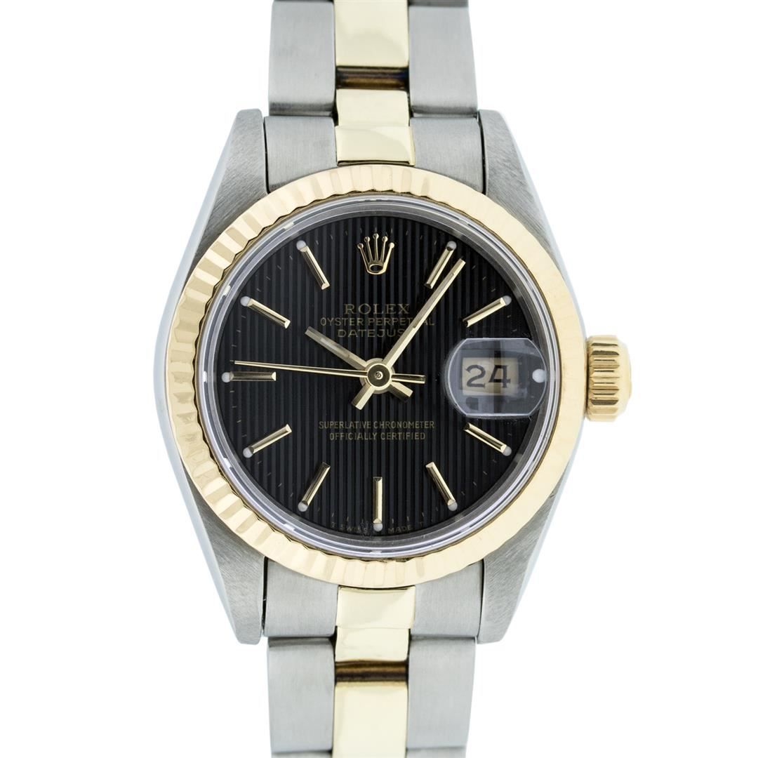 One Ladies Pre Owned Two Tone 14K Yellow Gold And Stainless Steel Rolex Polished, Serviced & Electronically Tested, Rolex Yellow Gold & Stainless Steel Case: 26mm, Yellow Gold Crown, Rolex Bezel: 14K Yellow Gold Fluted Bezel. Crystal: Plexiglass With Magnified Date Window. Hands: Luminescent Hands. Rolex Movement: Automatic Winding Movement 2030. Rolex Dial: Black Tapestry With Index Hour Markers. Date Window: 3 O'Clock Position Date Display, Model: Date. Condition: G-6 Extra Fine. Rolex Bracelet: Two Tone 14K Yellow Gold & Stainless Steel Oyster Band. Bright Polish. 6.0 Inch Length, Adjustable. Standard Clasp, With Rolex Logo. This Watch Has Been Serviced Time Tested And Is In Excellent Condition It Is Free Of All Scratches And Dents.