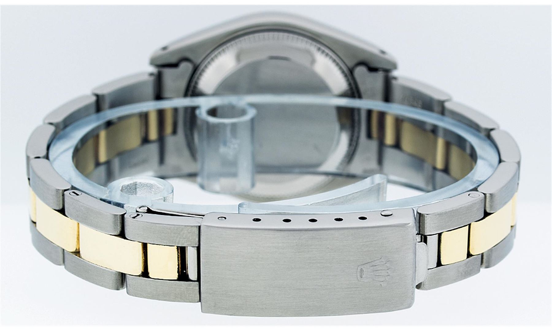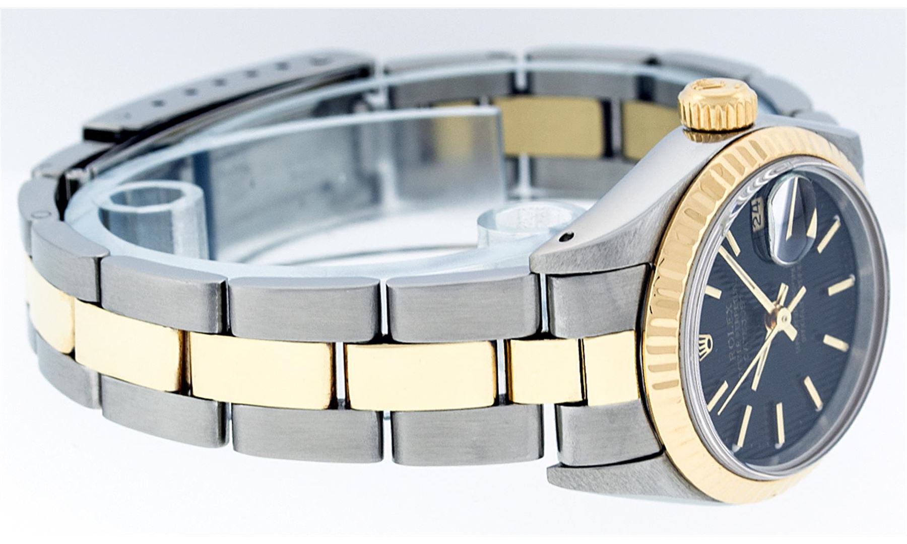One Ladies Pre Owned Two Tone 14K Yellow Gold And Stainless Steel Rolex Polished, Serviced & Electronically Tested, Rolex Yellow Gold & Stainless Steel Case: 26mm, Yellow Gold Crown, Rolex Bezel: 14K Yellow Gold Fluted Bezel. Crystal: Plexiglass With Magnified Date Window. Hands: Luminescent Hands. Rolex Movement: Automatic Winding Movement 2030. Rolex Dial: Black Tapestry With Index Hour Markers. Date Window: 3 O'Clock Position Date Display, Model: Date. Condition: G-6 Extra Fine. Rolex Bracelet: Two Tone 14K Yellow Gold & Stainless Steel Oyster Band. Bright Polish. 6.0 Inch Length, Adjustable. Standard Clasp, With Rolex Logo. This Watch Has Been Serviced Time Tested And Is In Excellent Condition It Is Free Of All Scratches And Dents.