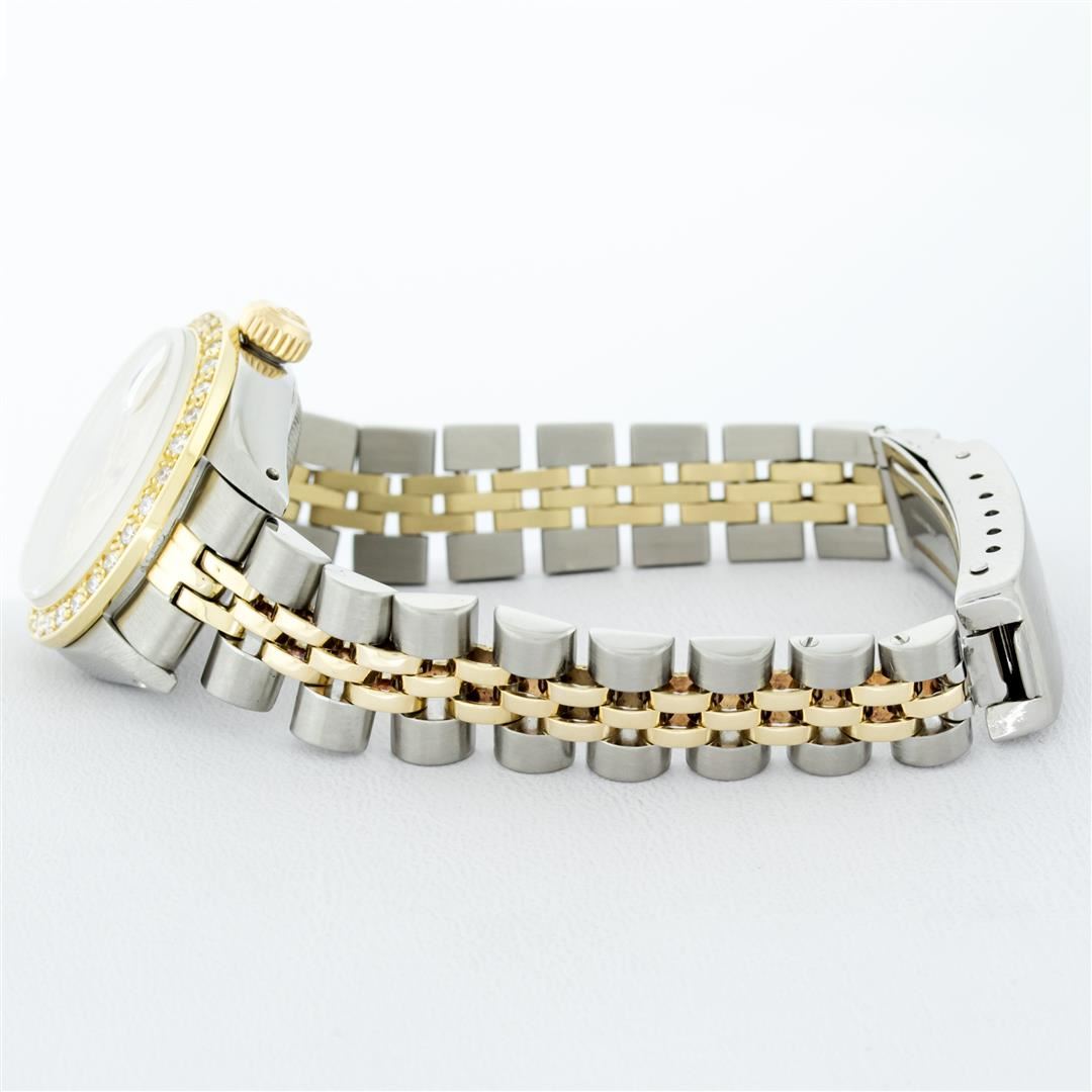 One Pre Owned Ladies Two Tone Rolex Datejust Polished, Serviced & Electronically Tested, Rolex Yellow Gold & Stainless Steel Case: 26mm, Rolex Yellow Gold Crown, Custom Bezel: New 18K Yellow Gold Diamond Bezel, Diamond Count: 32 Diamonds, Clarity: SI-VS, Color: G to H. Custom Crystal: New Scratch Resistant Synthetic Sapphire Cyclops Lens. Custom Hands: New Gold Hands. Rolex Movement: Automatic Winding Movement. Rolex Dial: Champagne Roman With Square Track. Date Window: 3 O'Clock Position Date Display, Model: Datejust, Condition: G-6 Extra Fine. Rolex Bracelet: Two Tone Yellow Gold & Stainless Steel Jubilee Band. Bright Polish. 6.0 Inch Length, Adjustable. Standard Clasp, With Rolex Logo. This Watch Has Been Serviced Time Tested And Is In Excellent Condition It Is Free Of All Scratches And Dents.
