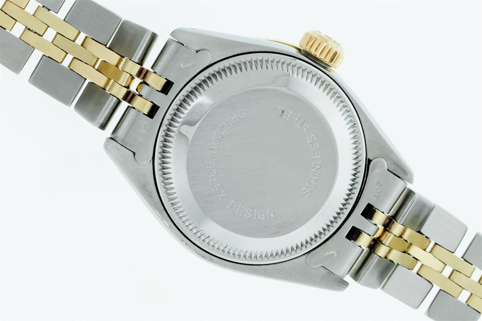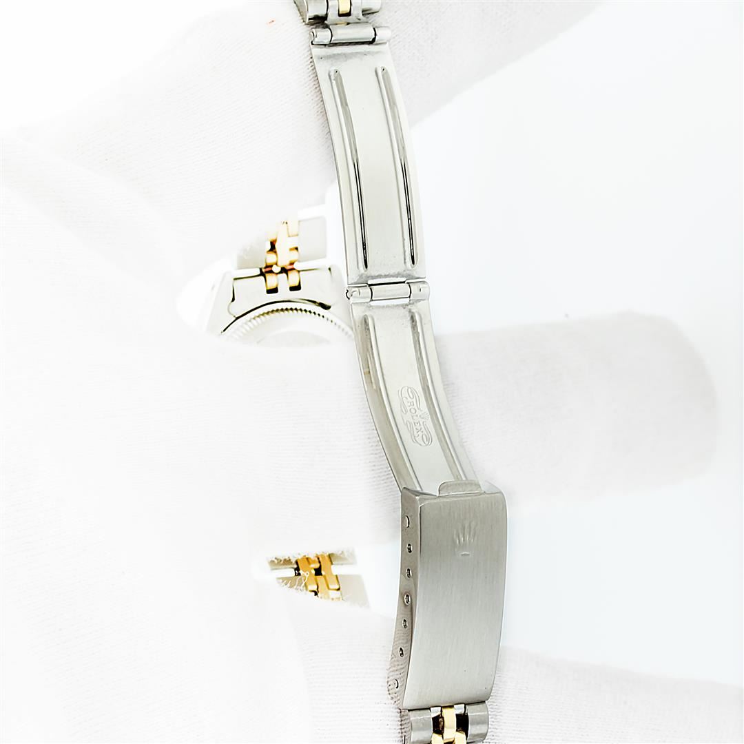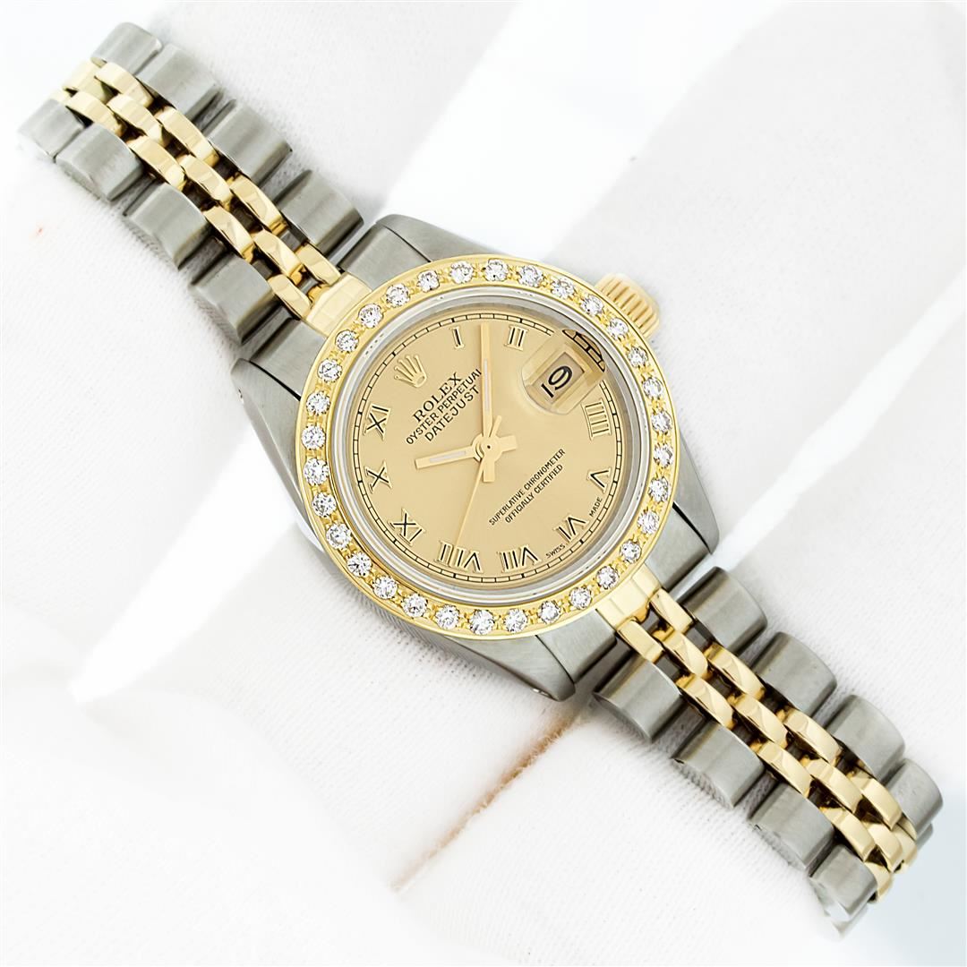 One Pre Owned Ladies Two Tone Rolex Datejust Polished, Serviced & Electronically Tested, Rolex Yellow Gold & Stainless Steel Case: 26mm, Rolex Yellow Gold Crown, Custom Bezel: New 18K Yellow Gold Diamond Bezel, Diamond Count: 32 Diamonds, Clarity: SI-VS, Color: G to H. Custom Crystal: New Scratch Resistant Synthetic Sapphire Cyclops Lens. Custom Hands: New Gold Hands. Rolex Movement: Automatic Winding Movement. Rolex Dial: Champagne Roman With Square Track. Date Window: 3 O'Clock Position Date Display, Model: Datejust, Condition: G-6 Extra Fine. Rolex Bracelet: Two Tone Yellow Gold & Stainless Steel Jubilee Band. Bright Polish. 6.0 Inch Length, Adjustable. Standard Clasp, With Rolex Logo. This Watch Has Been Serviced Time Tested And Is In Excellent Condition It Is Free Of All Scratches And Dents.