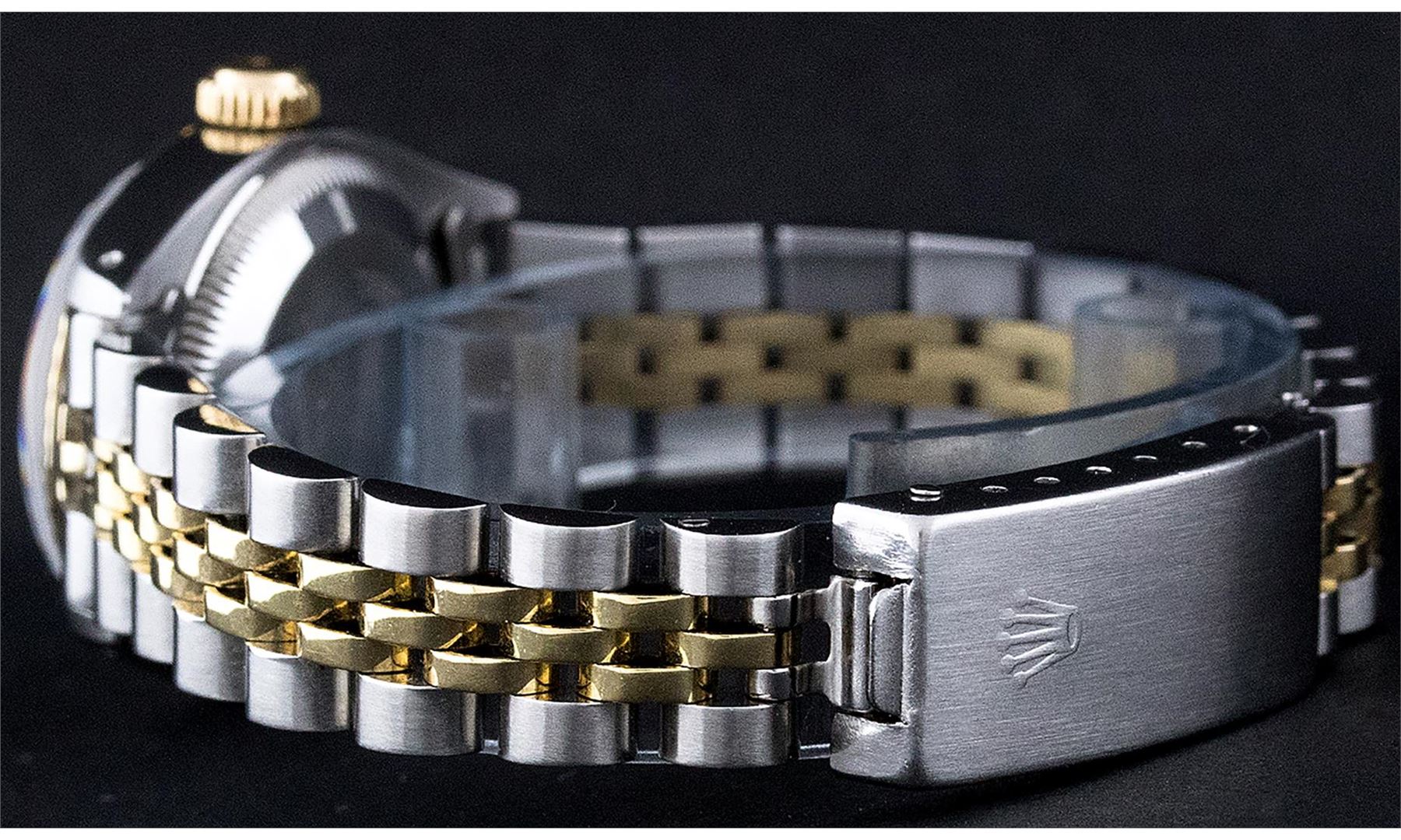 One Ladies Pre Owned Two Tone 14K Yellow Gold & Stainless Steel Rolex Polished, Serviced & Electronically Tested, Rolex Yellow Gold & Stainless Steel Case: 26mm, Rolex Yellow Gold Crown, Rolex Bezel: 14K Yellow Gold Fluted Bezel. Custom Crystal: New Plexiglass With Date Window. Hands: Luminescent Hands. Rolex Movement: Automatic Winding Movement 2030. Rolex Dial: Champagne Roman With Square Track. Date Window: 3 O'Clock Position Date Display, Model: Datejust. Condition: G-6 Extra Fine. Rolex Bracelet: Two Tone 14K Yellow Gold & Stainless Steel Jubilee Band. Bright Polish. 6.0 Inch Length, Adjustable. Standard Clasp, With Rolex Logo. This Watch Has Been Serviced Time Tested And Is In Excellent Condition It Is Free Of All Scratches And Dents.