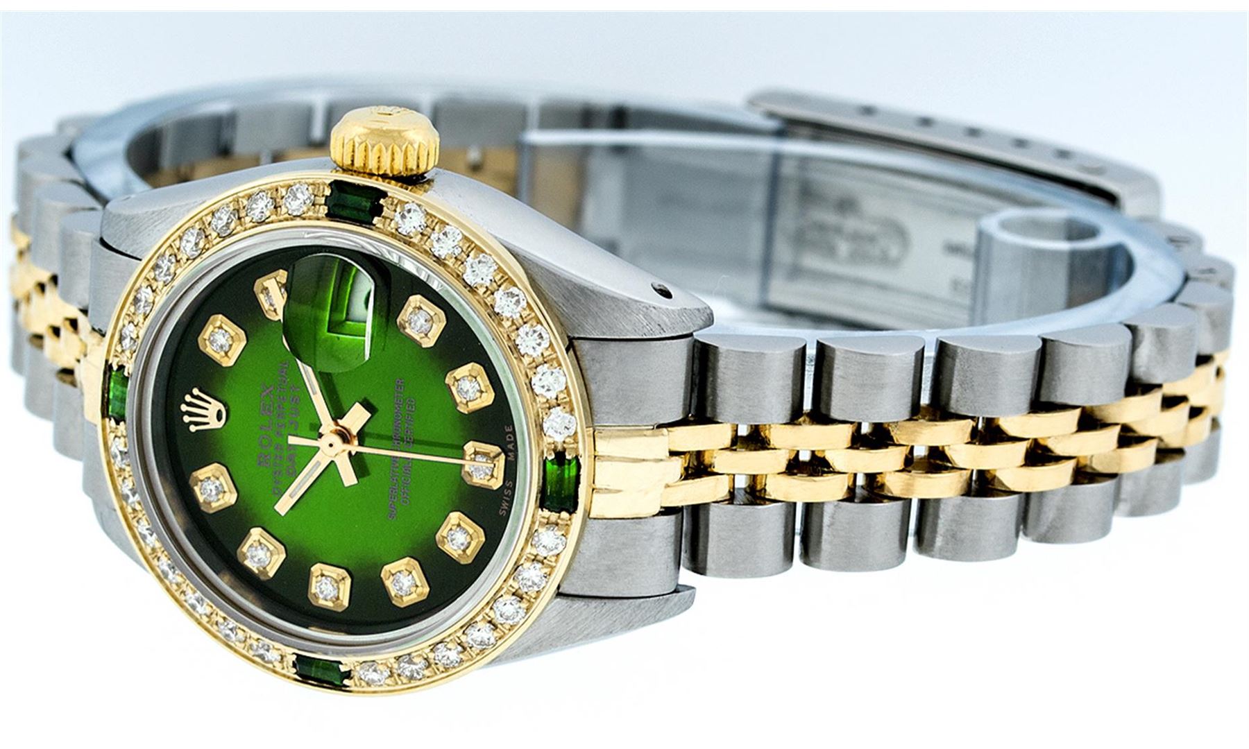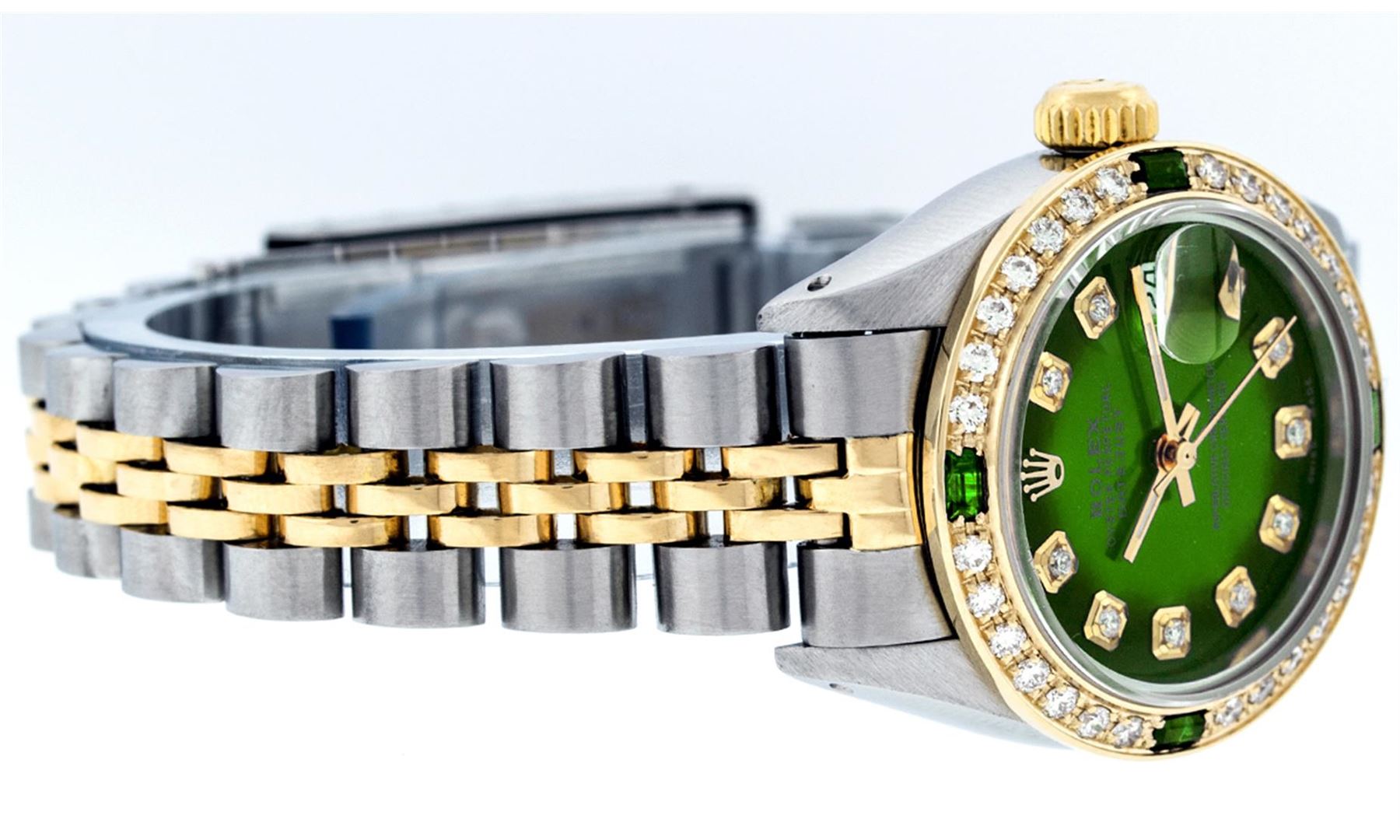 One Ladies Two Tone Rolex Datejust Polished, Serviced & Electronically Tested, 14K Yellow Gold & Stainless Steel Case:26mm, 14K Yellow Gold Crown, Custom Bezel: 18K Yellow Gold Emerald Beadset Diamond Bezel, Diamond Count: 28 Diamonds + 4 Emeralds Total Weight .70 Carat, Clarity: SI-VS, Color: G to H. Custom Crystal: Synthetic Sapphire Cyclops Lens. Movement: Automatic Winding Movement Caliber 2030. Custom Dial: Green Vignette With Diamond Hour Markers, Diamond Count: 10 Diamonds In Dial, Color: G to H, Clarity: SI-VS. Date Window: 3 O'Clock Position Date Display, Model: Datejust. Condition: G-6 Extra Fine. Bracelet: Two Tone 14K Yellow Gold & Stainless Steel Jubilee Band. Bright Polish. 5.5 Inch Length, Adjustable. Standard Clasp, With Rolex Logo.