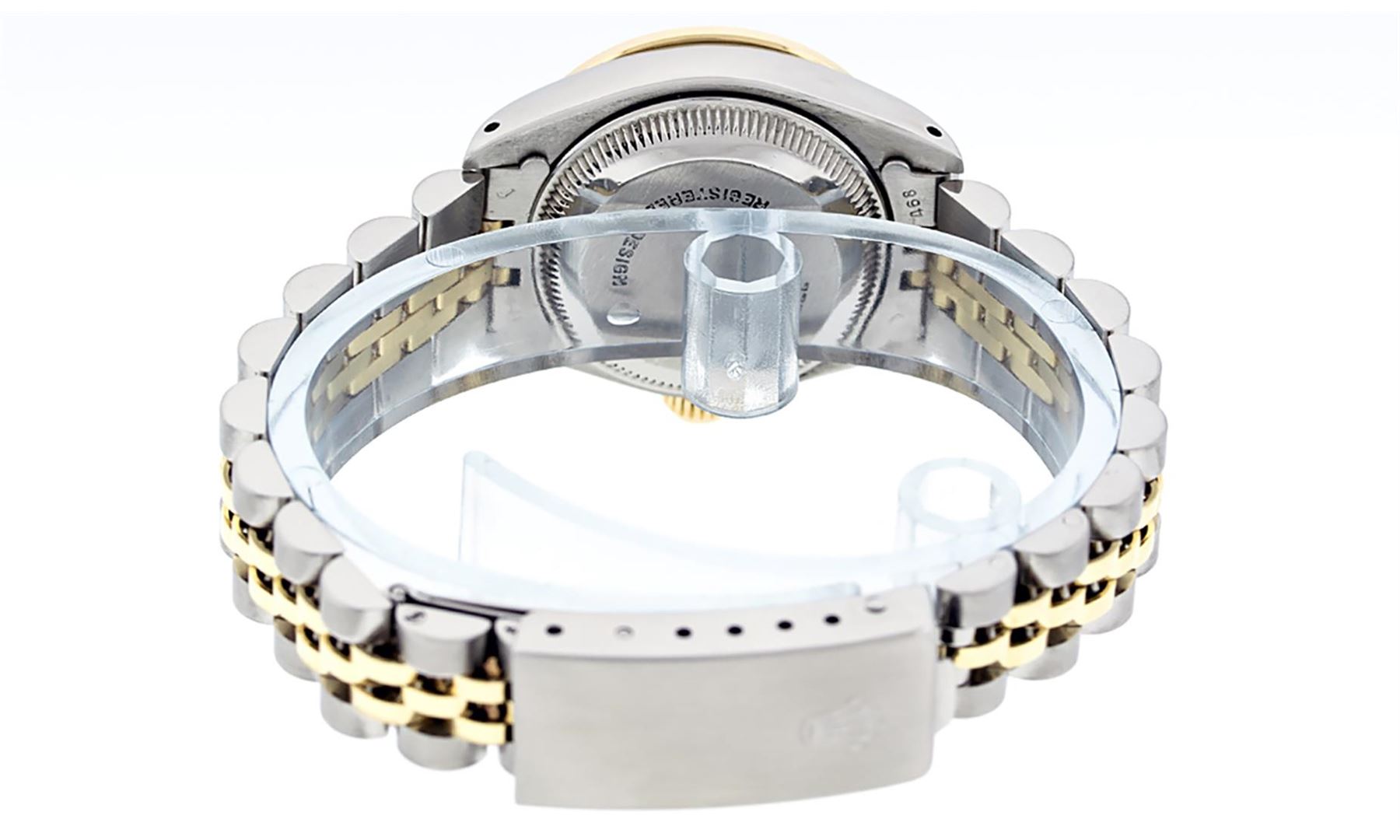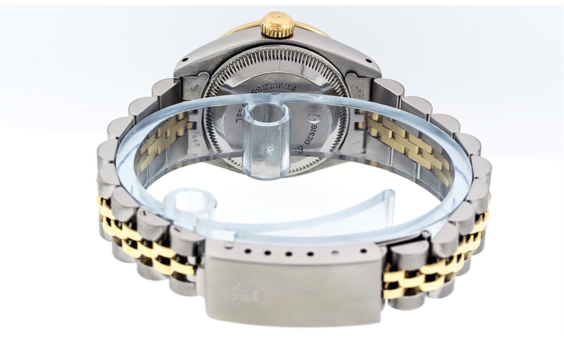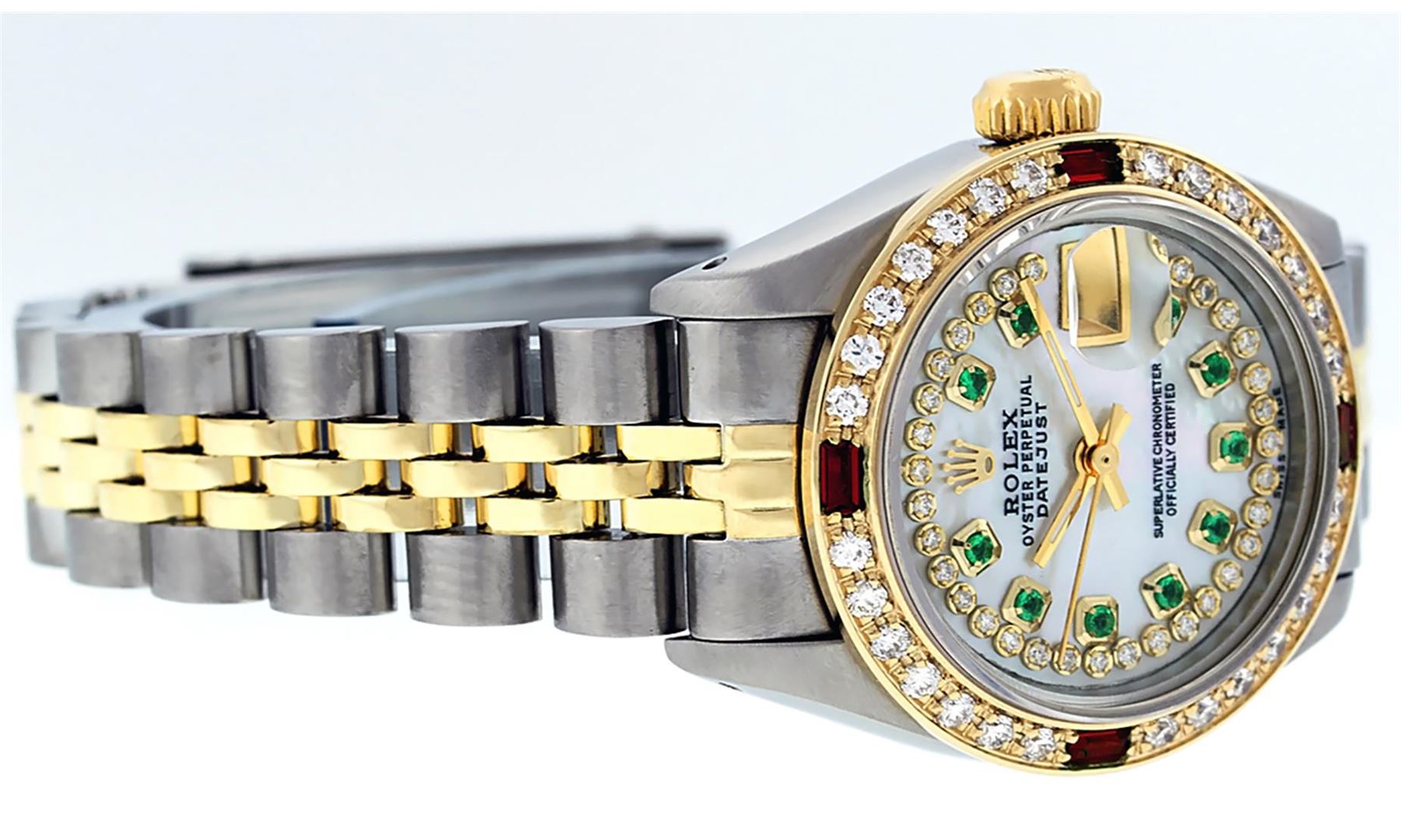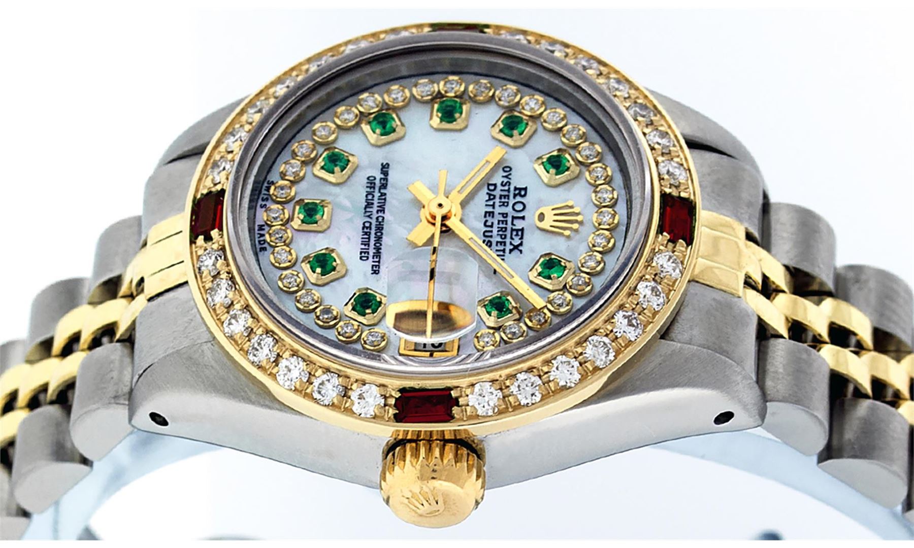 One Ladies Two Tone Rolex Datejust Polished, Serviced & Electronically Tested, Yellow Gold & Stainless Steel Case: 26mm, Yellow Gold Crown, Custom Bezel: New 18K New Yellow Gold Ruby Beadset Diamond Bezel, Diamond Count: 28 Diamonds + 4 Rubies In Dial, Total Weight .70 Carat, Clarity: SI-VS, Color: G to H. Custom Crystal: New Scratch Resistant Synthetic Sapphire Cyclops Lens. Custom Hands: New Luminescent Hands. Movement: Automatic Winding Movement. Custom Dial: Mother Of Pearl Emerald String Diamond Dial, Stone Count: 10 Emeralds + 33 Diamonds In Dial, Clarity: SI-VS, Color: G to H. Date Window: 3 O'Clock Position Date Display, Model: Datejust. Condition: G-6 Extra Fine. Bracelet: Two Tone Yellow Gold & Stainless Steel Jubilee Band. Bright Polish. 6.0 Inch Length, Adjustable. Standard Clasp, With Rolex Logo. This Watch Has Been Serviced Time Tested And Is In Excellent Condition It Is Free Of All Scratches And Dents.