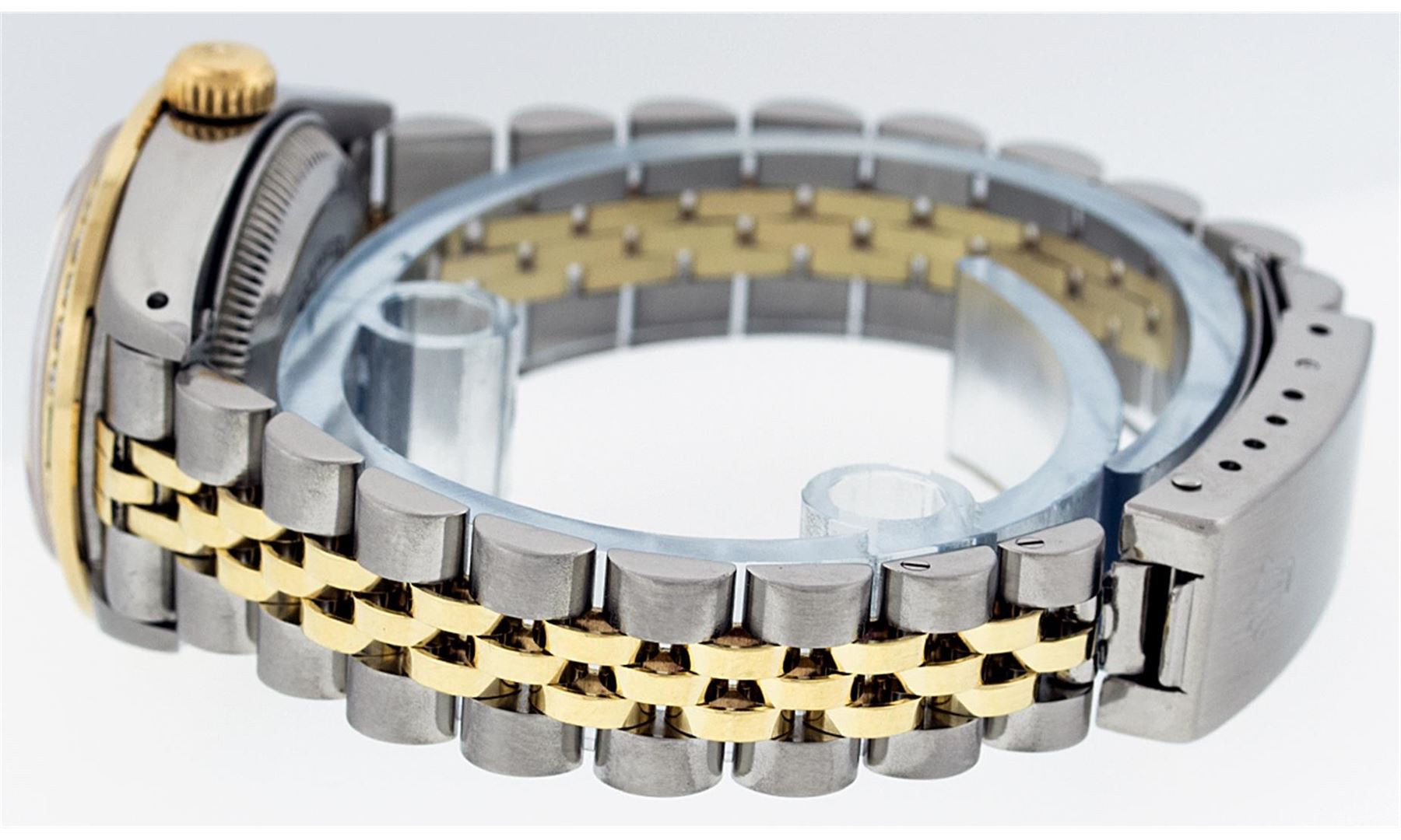 One Ladies Two Tone Rolex Datejust Polished, Serviced & Electronically Tested, 14K Yellow Gold & Stainless Steel Case:26mm, 14K Yellow Gold Crown, Custom Bezel: 18K Yellow Gold Emerald Beadset Diamond Bezel, Diamond Count: 28 Diamonds + 4 Emeralds Total Weight .70 Carat, Clarity: Si-VS, Color: G to H. Custom Crystal: Synthetic Sapphire Cyclops Lens. Movement: Automatic Winding Movement Caliber 2030. Custom Dial: Mother Of Pearl With Sapphire String Diamond Hour Markers. Stone Count: 10 Sapphires + 33 Diamonds In Dial, Clarity: SI-VS, Color: G to H. Date Window: 3 O'Clock Position Date Display, Model: Datejust. Condition: G-6 Extra Fine. Bracelet: Two Tone 14K Yellow Gold & Stainless Steel Jubilee Band. Bright Polish. 5.5 Inch Length, Adjustable. Standard Clasp, With Rolex Logo.