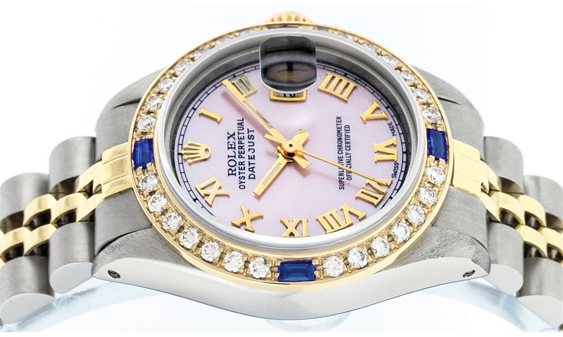One Ladies Two Tone Rolex Datejust Polished, Serviced & Electronically Tested, 14K Yellow Gold & Stainless Steel Case:26mm, 14K Yellow Gold Crown, Custom Bezel: 18K Yellow Gold Sapphire Beadset Diamond Bezel, Diamond Count: 28 Diamonds + 4 Sapphires Total Weight .70 Carat, Clarity: Si-VS, Color: G to H. Custom Crystal: Synthetic Sapphire Cyclops Lens. Movement: Automatic Winding Movement Caliber 2030. Custom Dial: Light Pink Mother Of Pearl Roman Dial With Square Track. Date Window: 3 O'Clock Position Date Display, Model: Datejust. Condition: G-6 Extra Fine. Bracelet: Two Tone 14K Yellow Gold & Stainless Steel Jubilee Band. Bright Polish. 5.5 Inch Length, Adjustable. Standard Clasp, With Rolex Logo.