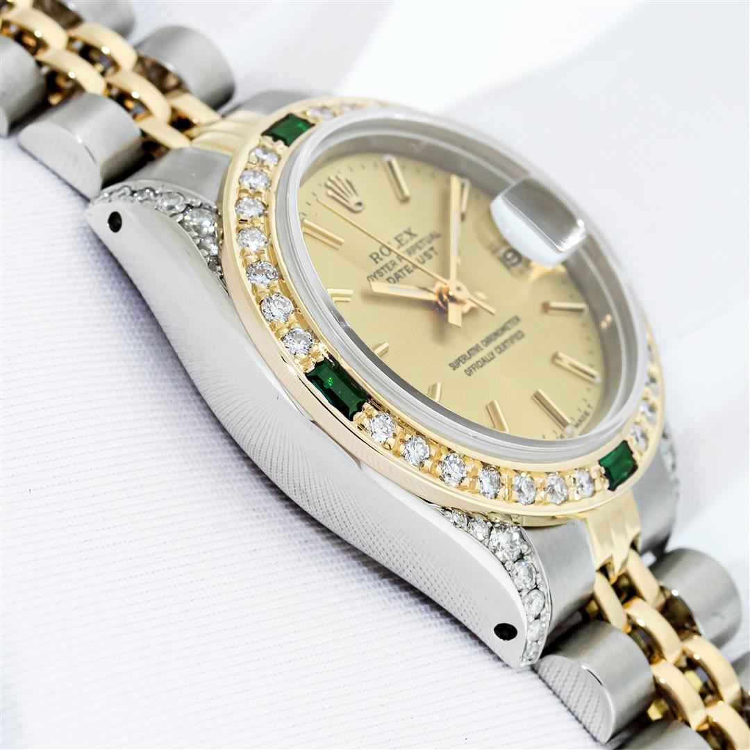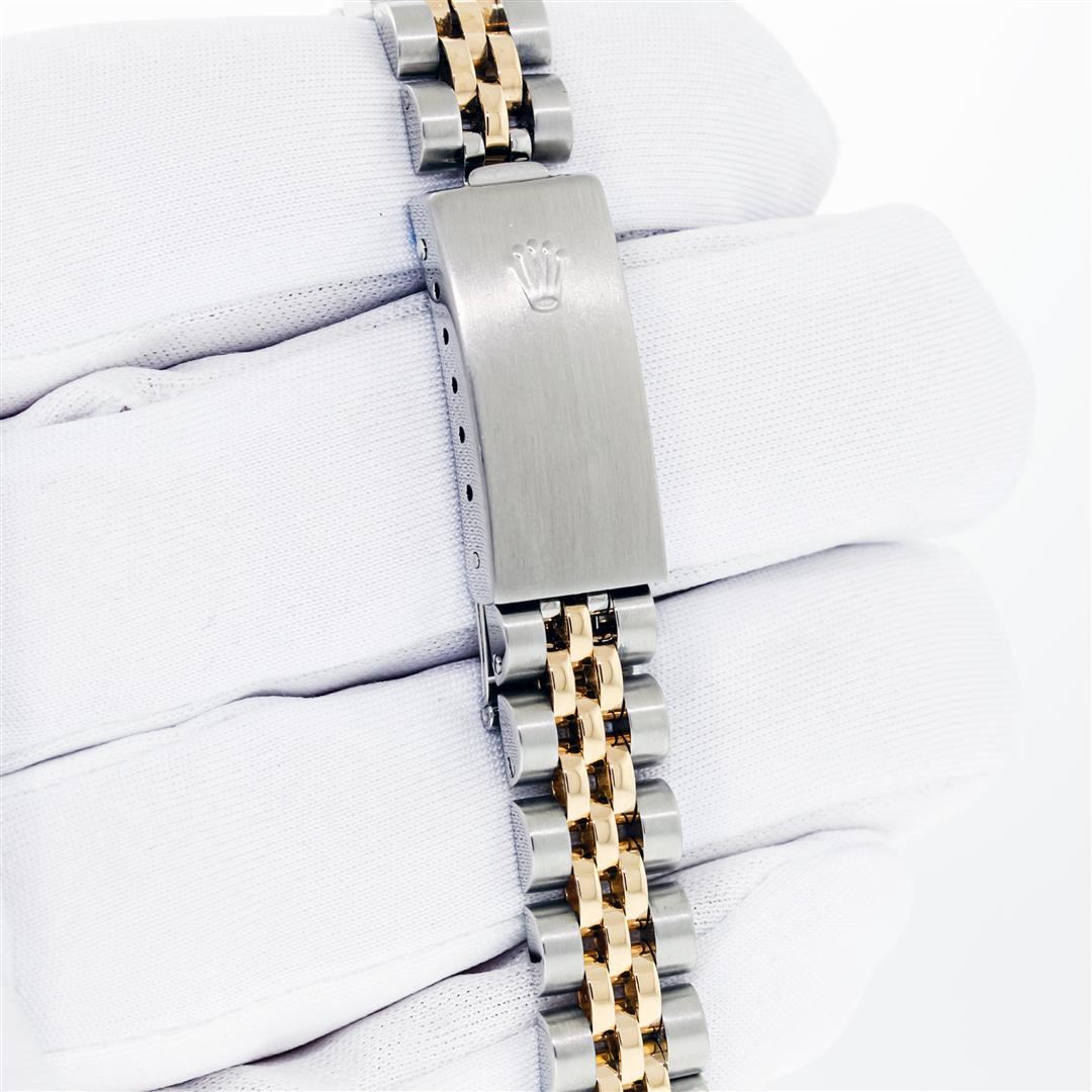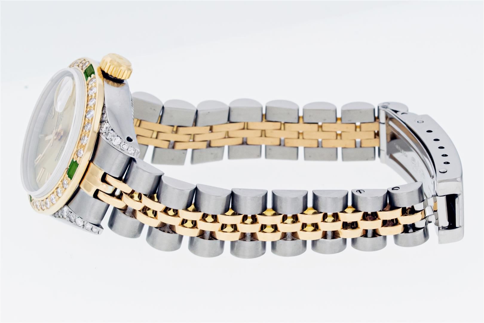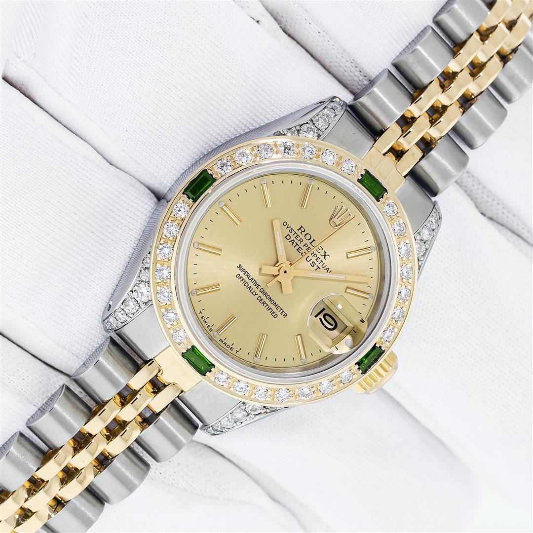 Rolex Ladies Pre Owned Quickset 18K Yellow Gold and Stainless Steel Two Tone Wristwatch Polished Bright with Satin Finish, Serviced & Electronically Tested, Rolex Stainless Steel Case: 26mm, Custom Diamond Lugs: Added Diamonds On Lugs, Diamond Count: 24 D