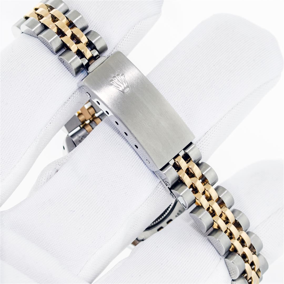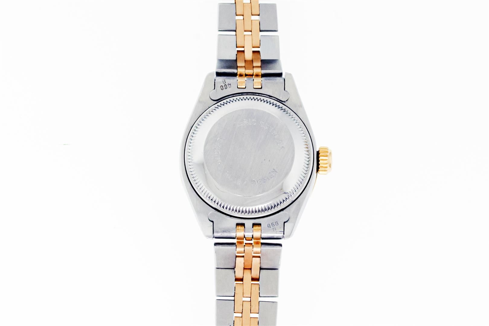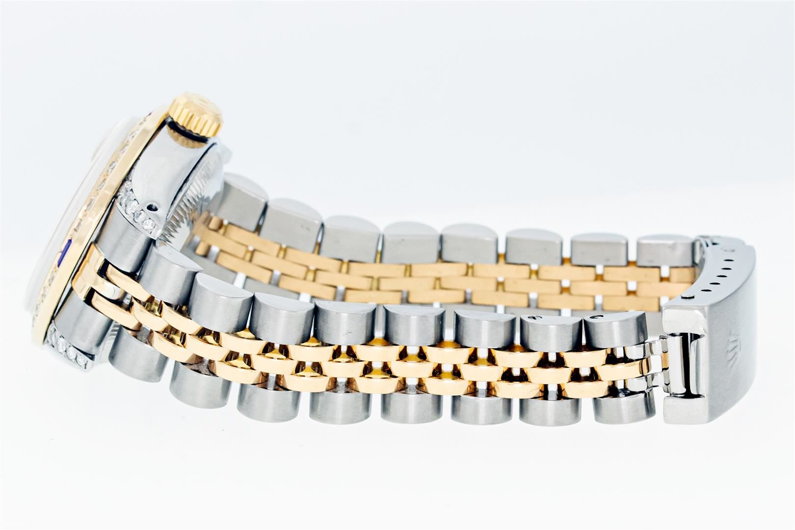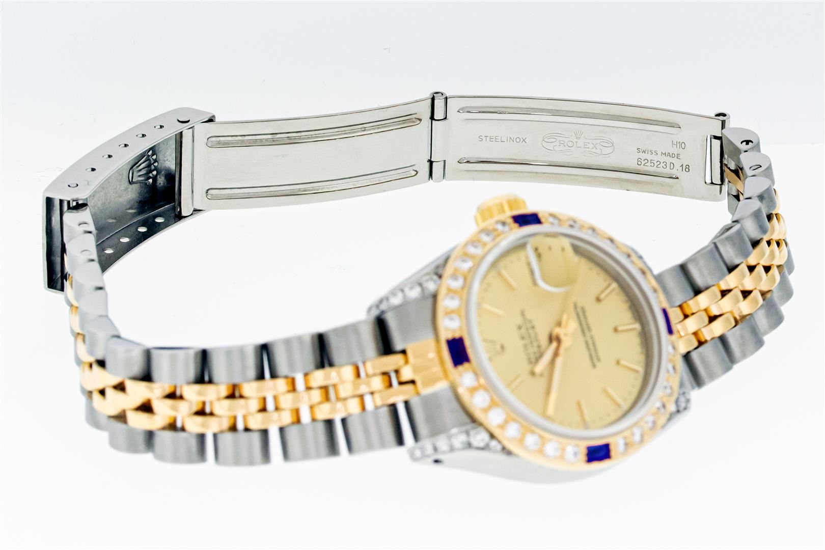 Rolex Ladies Pre Owned Quickset 18K Yellow Gold and Stainless Steel Two Tone Wristwatch Polished Bright with Satin Finish, Serviced & Electronically Tested, Rolex Stainless Steel Case: 26mm, Custom Diamond Lugs: Added Diamonds On Lugs, Diamond Count: 24 Diamonds On Lugs, Color: G To H, Clarity: SI-VS. Rolex Yellow Gold Crown, Custom Bezel: New 18K Yellow Gold Beadset And Sapphire Diamond Bezel, Stone Count: 28 Diamonds + 4 Sapphires On Bezel. Custom Crystal: New Sapphire With Magnified Date Window. Custom Hands: New Hands. Rolex Movement: Automatic Winding Movement. Rolex Dial: Champagne Dial With Dash Track & Lumi Dots, Date Window: 3 O'Clock Position Date Display, Model: Quickset Datejust, Condition: G-6 Extra Fine. Rolex Bracelet: Stainless Steel and 18K Yellow Gold Jubilee Band. Bright Polish & Satin Finish. 6.0 Inch Length, Adjustable. Standard Clasp, With Rolex Logo. This Watch Has Been Serviced Time Tested And Is In Excellent Condition It Is Free Of All Scratches And Dents.
