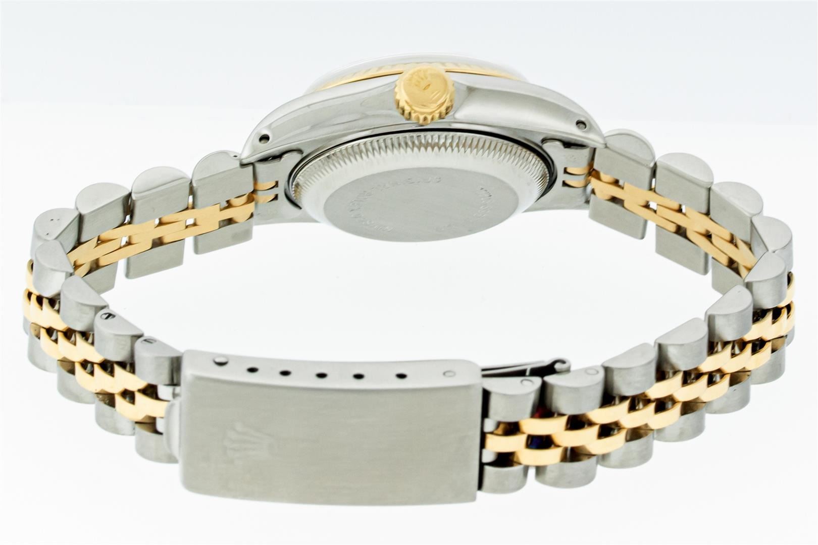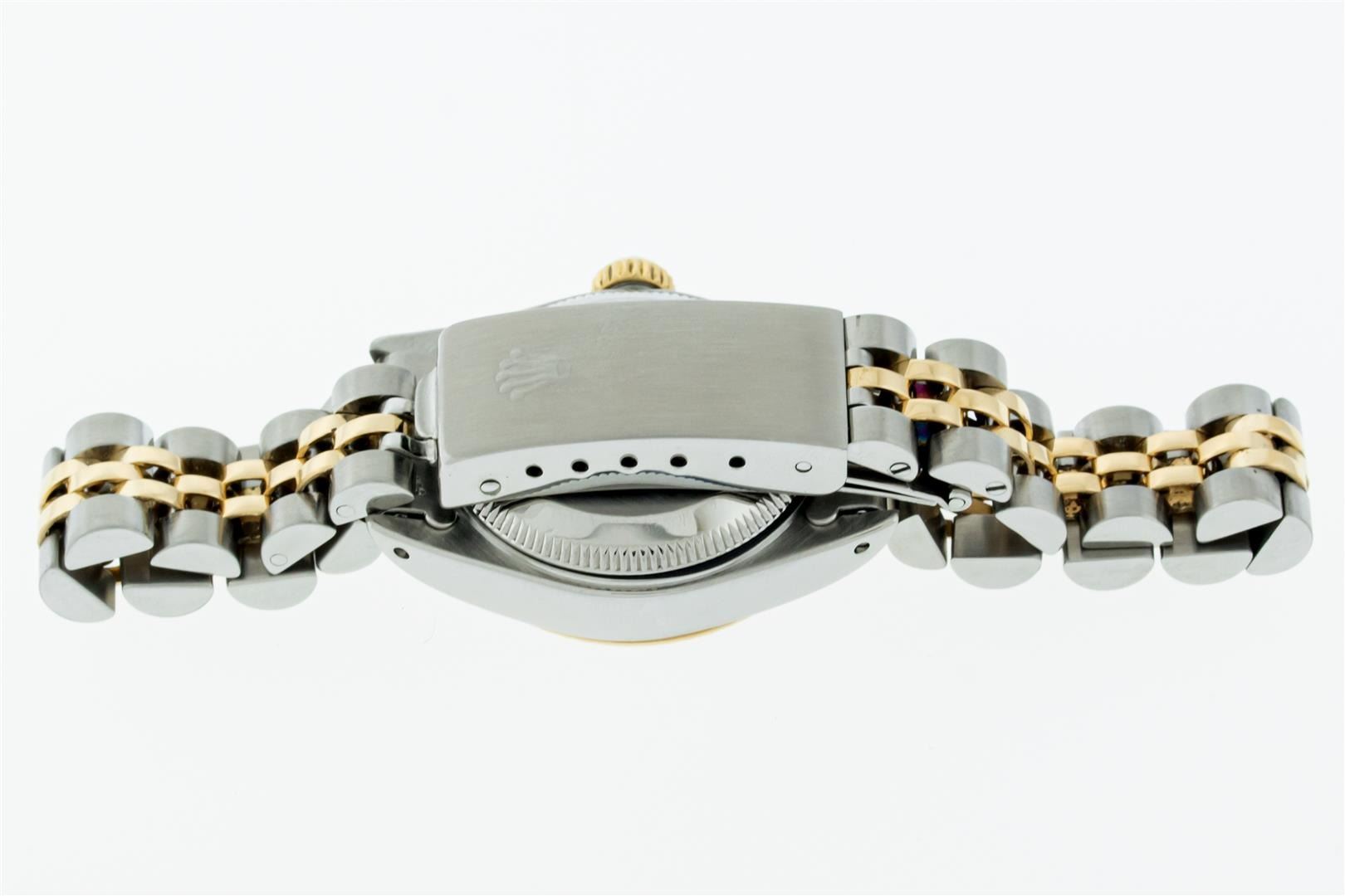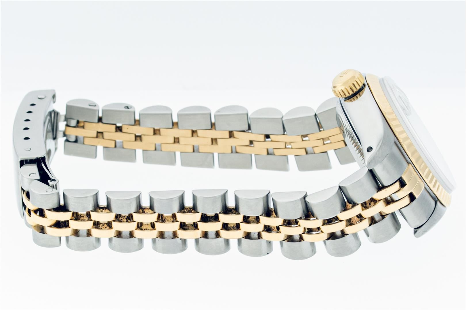 One Ladies Pre Owned 18K Two Tone Rolex Datejust Polished, Serviced & Electronically Tested, Rolex 18K Yellow Gold & Stainless Steel Case: 26mm, Rolex Yellow Gold Crown, Rolex Bezel: 18K Yellow Gold Fluted Bezel. Crystal: Sapphire With Magnified Date Window. Hands: Luminescent Hands. Rolex Movement: Quickset Automatic Winding Movement. Rolex Dial: Silver Index Tapestry With Square Track. Date Window: 3 O'Clock Position Date Display, Model: Quickset Datejust. Condition: G-6 Extra Fine. Rolex Bracelet: Two Tone 18K Yellow Gold & Stainless Steel Jubilee Band. Bright Polish. 6.0 Inch Length, Adjustable. Standard Clasp, With Rolex Logo. This Watch Has Been Serviced Time Tested And Is In Excellent Condition It Is Free Of All Scratches And Dents.