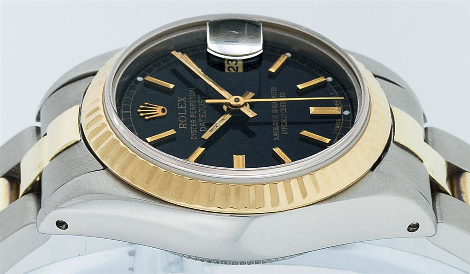 One Ladies Pre Two Tone 14K Yellow Gold & Stainless Steel Rolex Polished, Serviced & Electronically Tested, 14K Yellow Gold & Stainless Steel Case: 26mm, Yellow Gold Crown, Bezel: 14K Yellow Gold Fluted Bezel. Custom Crystal: New Plexiglass With Date Window. Hands: Luminescent Hands. Rolex Movement: Automatic Winding Movement 2030. Custom Dial: Black Index With Dash Track & Lumi Dots. Date Window: 3 O'Clock Position Date Display, Model: Datejust. Condition: G-6 Extra Fine. Bracelet: Two Tone 14K Yellow Gold & Stainless Steel Oyster Band. Bright Polish. 6.0 Inch Length, Adjustable. Standard Clasp, With Rolex Logo. This Watch Has Been Serviced Time Tested And Is In Excellent Condition It Is Free Of All Scratches And Dents.