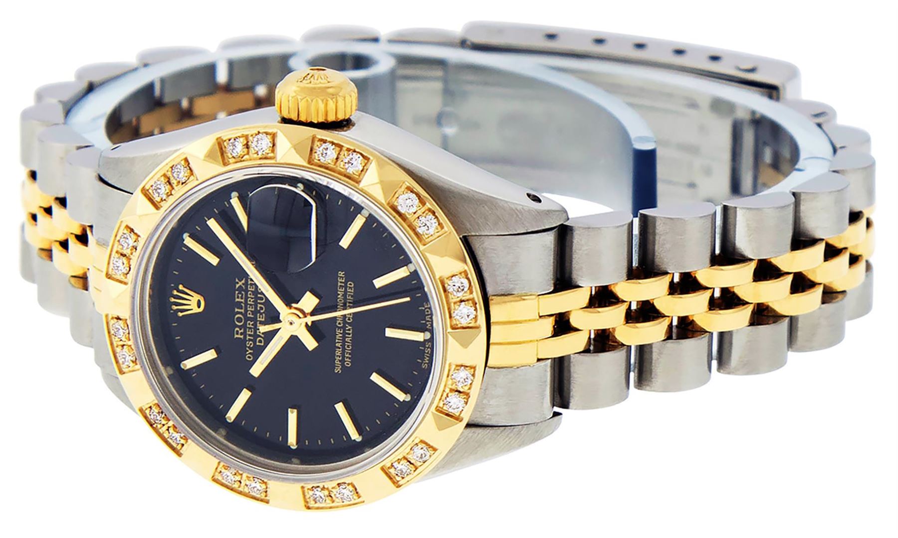 One Ladies Pre Owned Rolex Two Tone 14K Yellow Gold & Stainless Steel Rolex Polished, Serviced & Electronically Tested, Rolex 14K Yellow Gold & Stainless Steel Case: 26mm, Rolex Yellow Gold Crown, Custom Bezel: New 18K Yellow Gold Pyramid Diamond Bezel, Diamond Count: 24 Diamonds In Bezel. Total Weight .50 Carat, Clarity: SI-VS, Color: G to H. Custom Crystal: New Sapphire With Magnified Date Window. Custom Hands: New Luminescent Hands. Rolex Movement: Automatic Winding Movement 2030. Rolex Dial: Black With Index Hour Markers With Dash Track & Lumi Dots. Date Window: 3 O'Clock Position Date Display, Model: Date. Condition: G-6 Extra Fine. Rolex Bracelet: Two Tone 14K Yellow Gold & Stainless Steel Jubilee Band. Bright Polish. 6.0 Inch Length, Adjustable. Standard Clasp, With Rolex Logo. This Watch Has Been Serviced Time Tested And Is In Excellent Condition It Is Free Of All Scratches And Dents.