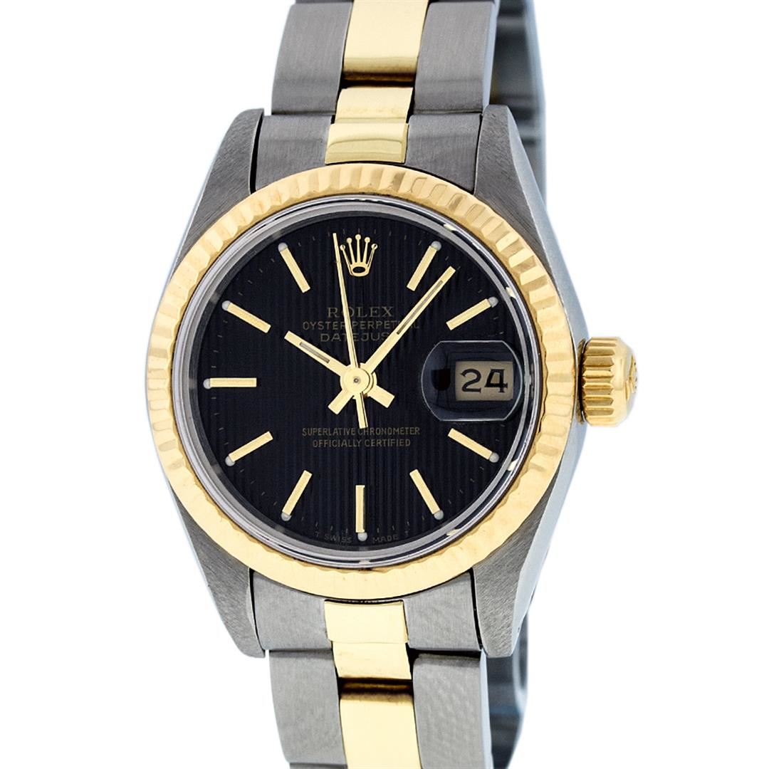 One Ladies Pre Owned Two Tone 14K Yellow Gold And Stainless Steel Rolex Polished, Serviced & Electronically Tested, Rolex Yellow Gold & Stainless Steel Case: 26mm, Yellow Gold Crown, Rolex Bezel: 14K Yellow Gold Fluted Bezel. Crystal: Plexiglass With Magnified Date Window. Hands: Luminescent Hands. Rolex Movement: Automatic Winding Movement 2030. Rolex Dial: Black Tapestry With Index Hour Markers. Date Window: 3 O'Clock Position Date Display, Model: Date. Condition: G-6 Extra Fine. Rolex Bracelet: Two Tone 14K Yellow Gold & Stainless Steel Oyster Band. Bright Polish. 6.0 Inch Length, Adjustable. Standard Clasp, With Rolex Logo. This Watch Has Been Serviced Time Tested And Is In Excellent Condition It Is Free Of All Scratches And Dents.