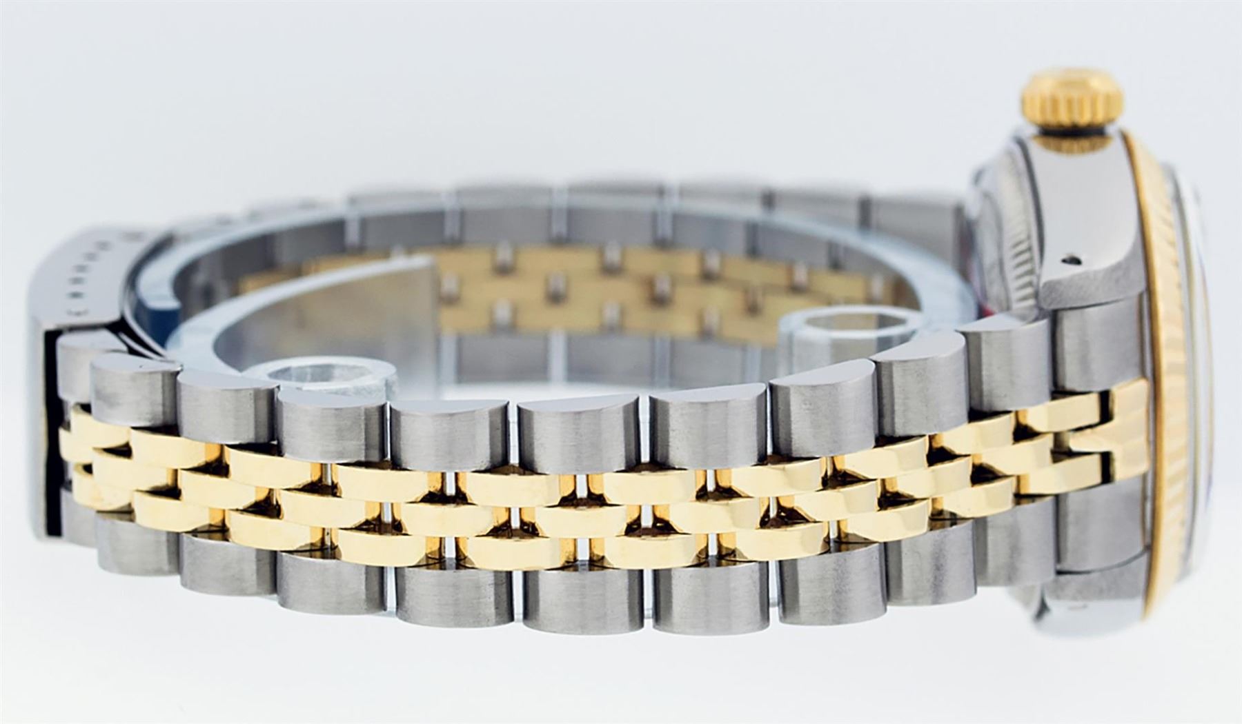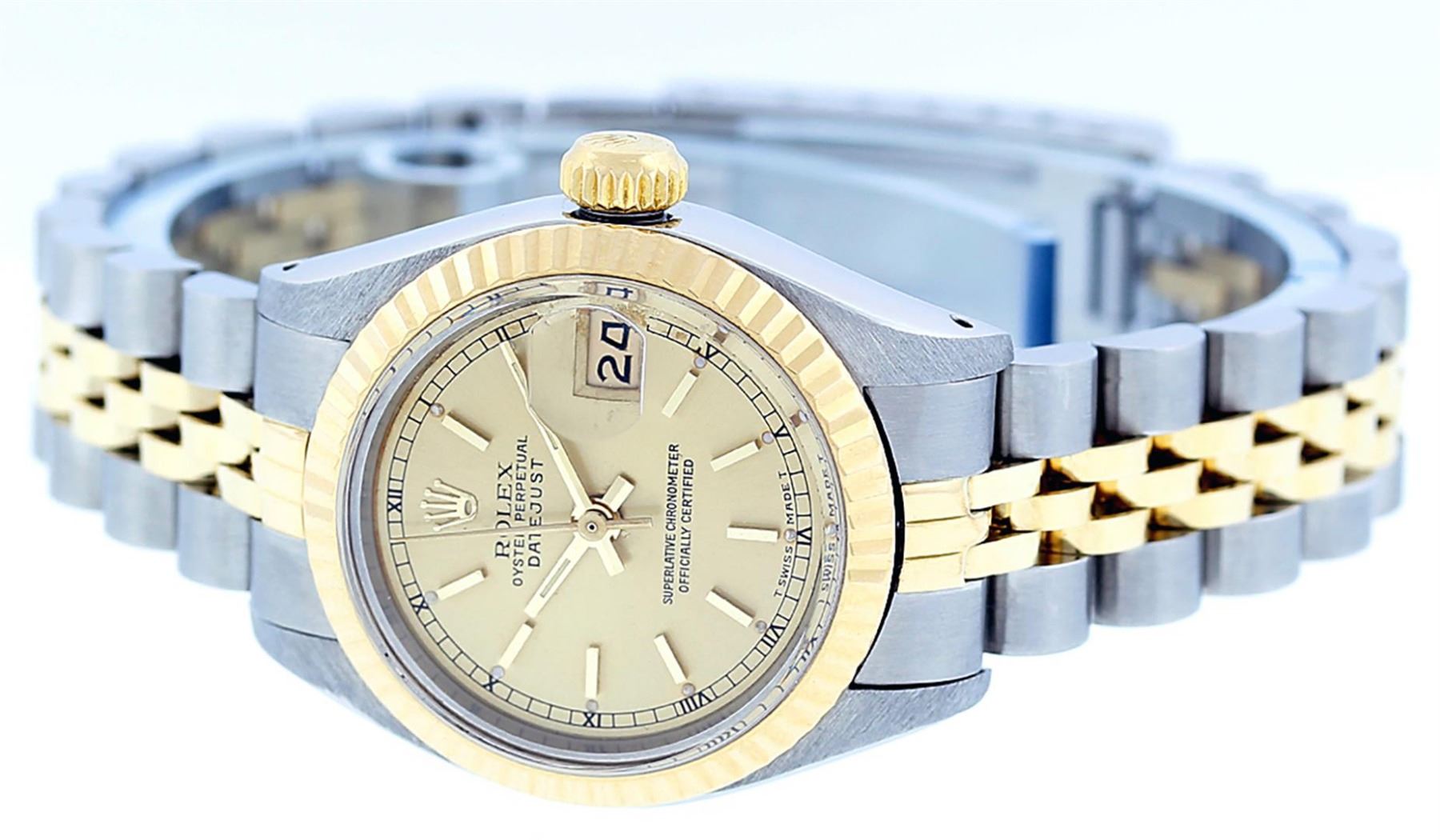 One Ladies Pre Owned Two Tone 14K Yellow Gold And Stainless Steel Rolex Polished, Serviced & Electronically Tested, Rolex Yellow Gold & Stainless Steel Case: 26mm, Rolex Yellow Gold Crown, Rolex Bezel: Yellow Gold Fluted Bezel. Custom Crystal: New Plexiglass With Date Window. Hands: Luminescent Hands. Rolex Movement: Automatic Winding Movement 2030. Rolex Dial: Champagne Index With Roman Track & Lumi Dots. Date Window: 3 O'Clock Position Date Display, Model: Date. Condition: G-6 Extra Fine. Rolex Bracelet: Two Tone 14K Yellow Gold & Stainless Steel Jubilee Band. Bright Polish. 6.0 Inch Length, Adjustable. Standard Clasp, With Rolex Logo. This Watch Has Been Serviced Time Tested And Is In Excellent Condition It Is Free Of All Scratches And Dents.