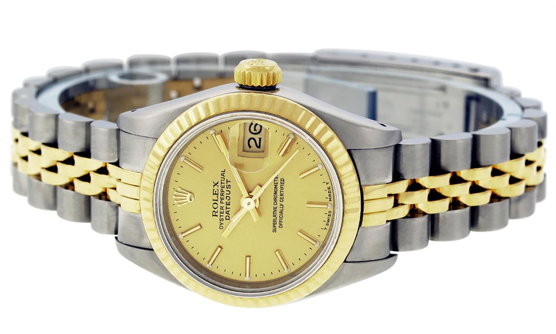 One Ladies Pre Owned Two Tone 14K Yellow Gold & Stainless Steel Rolex Polished, Serviced & Electronically Tested, Yellow Gold & Stainless Steel Case: 26mm, Yellow Gold Crown, Rolex Bezel: 14K Yellow Gold Fluted Bezel. Crystal: Plexiglass With Magnified Date Window. Hands: Luminescent Hands. Rolex Movement: Automatic Winding Movement 2030. Rolex Dial: Champagne Index With Luminescent Dots. Date Window: 3 O'Clock Position Date Display, Model: Date. Condition: G-6 Extra Fine. Rolex Bracelet: Two Tone 14K Yellow Gold & Stainless Steel Jubilee Band. Bright Polish. 6.0 Inch Length, Adjustable. Standard Clasp, With Rolex Logo. This Watch Has Been Serviced Time Tested And Is In Excellent Condition It Is Free Of All Scratches And Dents.