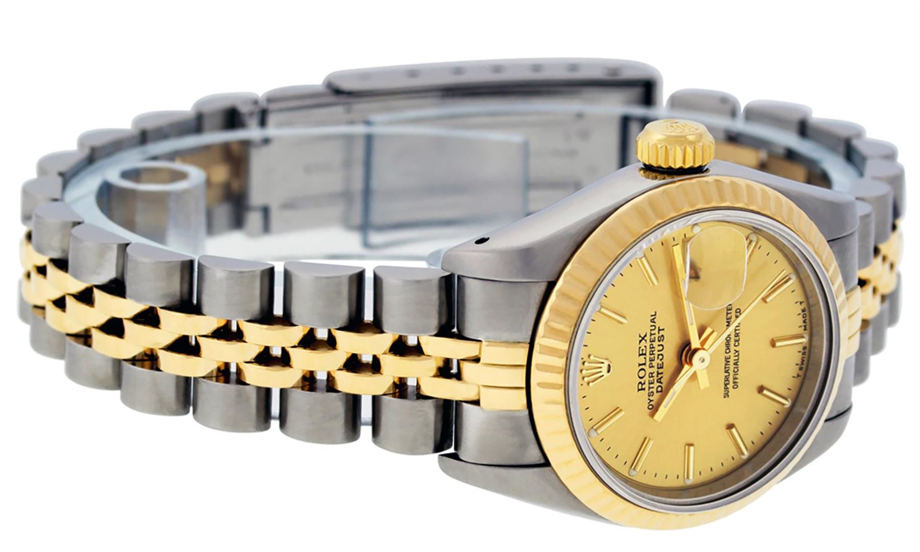 One Ladies Pre Owned Two Tone 14K Yellow Gold & Stainless Steel Rolex Polished, Serviced & Electronically Tested, Yellow Gold & Stainless Steel Case: 26mm, Yellow Gold Crown, Rolex Bezel: 14K Yellow Gold Fluted Bezel. Crystal: Plexiglass With Magnified Date Window. Hands: Luminescent Hands. Rolex Movement: Automatic Winding Movement 2030. Rolex Dial: Champagne Index With Luminescent Dots. Date Window: 3 O'Clock Position Date Display, Model: Date. Condition: G-6 Extra Fine. Rolex Bracelet: Two Tone 14K Yellow Gold & Stainless Steel Jubilee Band. Bright Polish. 6.0 Inch Length, Adjustable. Standard Clasp, With Rolex Logo. This Watch Has Been Serviced Time Tested And Is In Excellent Condition It Is Free Of All Scratches And Dents.