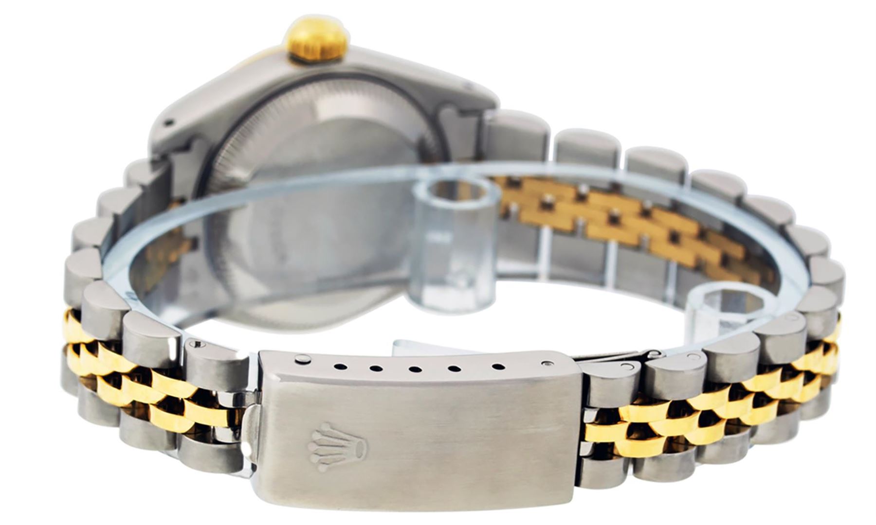 One Ladies Pre Owned Two Tone 14K Yellow Gold & Stainless Steel Rolex Polished, Serviced & Electronically Tested, Yellow Gold & Stainless Steel Case: 26mm, Yellow Gold Crown, Rolex Bezel: 14K Yellow Gold Fluted Bezel. Crystal: Plexiglass With Magnified Date Window. Hands: Luminescent Hands. Rolex Movement: Automatic Winding Movement 2030. Rolex Dial: Champagne Index With Luminescent Dots. Date Window: 3 O'Clock Position Date Display, Model: Date. Condition: G-6 Extra Fine. Rolex Bracelet: Two Tone 14K Yellow Gold & Stainless Steel Jubilee Band. Bright Polish. 6.0 Inch Length, Adjustable. Standard Clasp, With Rolex Logo. This Watch Has Been Serviced Time Tested And Is In Excellent Condition It Is Free Of All Scratches And Dents.