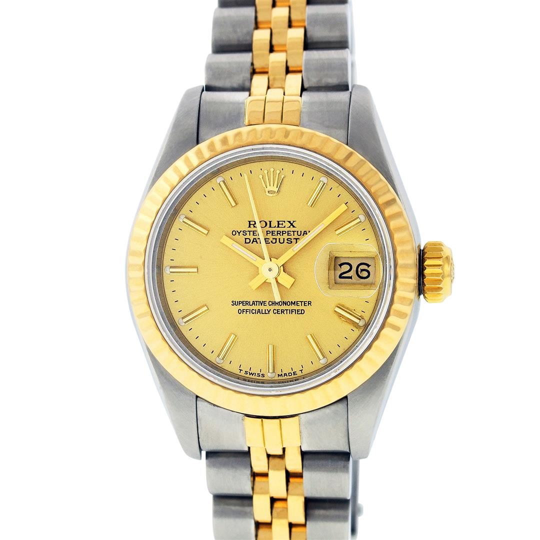 One Ladies Pre Owned Two Tone 14K Yellow Gold & Stainless Steel Rolex Polished, Serviced & Electronically Tested, Yellow Gold & Stainless Steel Case: 26mm, Yellow Gold Crown, Rolex Bezel: 14K Yellow Gold Fluted Bezel. Crystal: Plexiglass With Magnified Date Window. Hands: Luminescent Hands. Rolex Movement: Automatic Winding Movement 2030. Rolex Dial: Champagne Index With Luminescent Dots. Date Window: 3 O'Clock Position Date Display, Model: Date. Condition: G-6 Extra Fine. Rolex Bracelet: Two Tone 14K Yellow Gold & Stainless Steel Jubilee Band. Bright Polish. 6.0 Inch Length, Adjustable. Standard Clasp, With Rolex Logo. This Watch Has Been Serviced Time Tested And Is In Excellent Condition It Is Free Of All Scratches And Dents.
