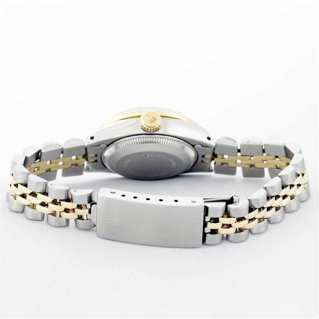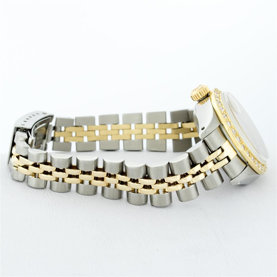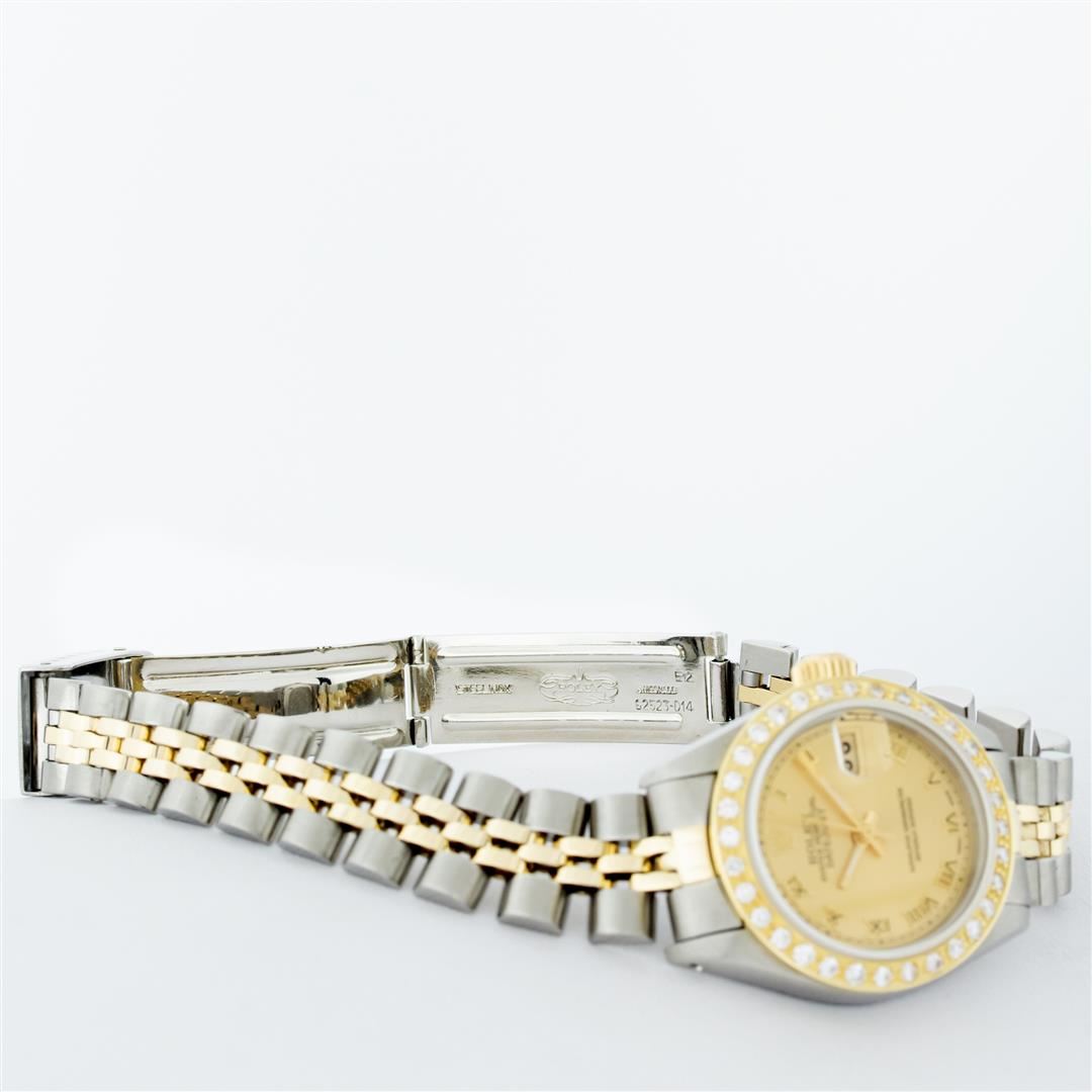 One Pre Owned Ladies Two Tone 14K Yellow Gold & Stainless Rolex Polished, Serviced & Electronically Tested, Rolex 14K Yellow Gold & Stainless Steel Case: 26mm, Rolex Yellow Gold Crown, Custom Bezel: New 18K Yellow Gold Diamond Bezel, Diamond Count: 32 Diamonds, Clarity: SI-VS, Color: G to H. Custom Crystal: New Sapphire With Magnified Date Window. Custom Hands: New Gold Hands. Rolex Movement: Automatic Winding Movement 2030. Rolex Dial: Champagne Roman With Square Track. Date Window: 3 O'Clock Position Date Display, Model: Date, Condition: G-6 Extra Fine. Rolex Bracelet: Two Tone 14K Yellow Gold & Stainless Steel Jubilee Band. Bright Polish. 6.0 Inch Length, Adjustable. Standard Clasp, With Rolex Logo. This Watch Has Been Serviced Time Tested And Is In Excellent Condition It Is Free Of All Scratches And Dents.