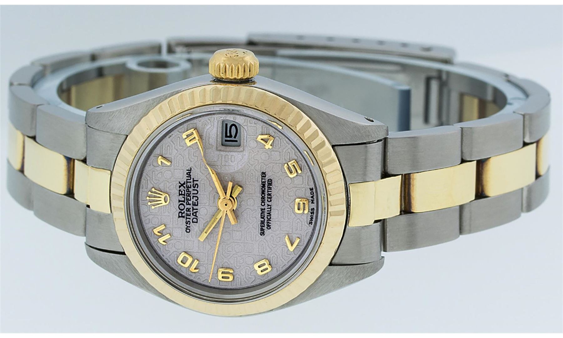 One Ladies Pre Owned 14K Yellow Gold & Stainless Steel Two Tone Rolex Polished, Serviced & Electronically Tested, 14K Yellow Gold & Stainless Steel Case: 26mm, Yellow Gold Crown, Rolex Bezel: 14K Yellow Gold Fluted Bezel. Custom Crystal: New With Cyclops Lens. Hands: Luminescent Hands. Rolex Movement: Automatic Winding Movement 2030. Rolex Dial: Cream Jubilee With Arabic Hour Markers. Date Window: 3 O'Clock Position Date Display, Model: Datejust. Condition: G-6 Extra Fine. Rolex Bracelet: Two Tone 14K Yellow Gold & Stainless Steel Oyster Band. Bright Polish. 6.0 Inch Length, Adjustable. Standard Clasp, With Rolex Logo. This Watch Has Been Serviced Time Tested And Is In Excellent Condition It Is Free Of All Scratches And Dents.
