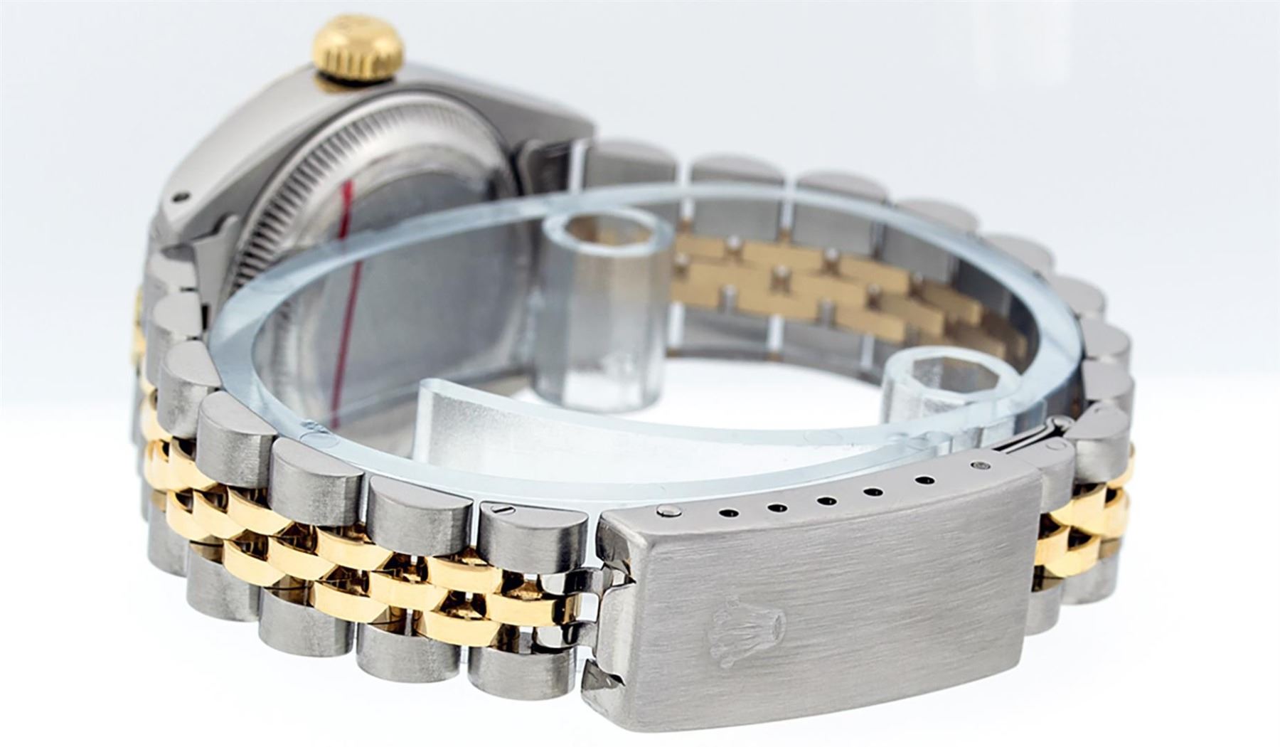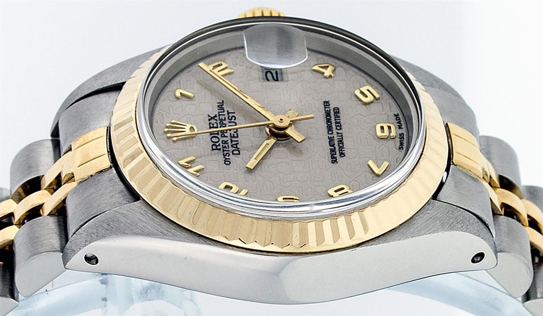 One Ladies Pre Owned 14K Yellow Gold & Stainless Steel Two Tone Rolex Polished, Serviced & Electronically Tested, 14K Yellow Gold & Stainless Steel Case: 26mm, Yellow Gold Crown, Bezel: 14K Yellow Gold Fluted Bezel. Crystal: Plexiglass With Date Window. Hands: Luminescent Hands. Rolex Movement: Automatic Winding Movement 2030. Rolex Dial: Cream Jubilee With Arabic Hour Markers. Date Window: 3 O'Clock Position Date Display, Model: Date. Condition: G-6 Extra Fine. Rolex Bracelet: Two Tone 14K Yellow Gold & Stainless Steel Jubilee Band. Bright Polish. 6.0 Inch Length, Adjustable. Standard Clasp, With Rolex Logo. This Watch Has Been Serviced Time Tested And Is In Excellent Condition It Is Free Of All Scratches And Dents.