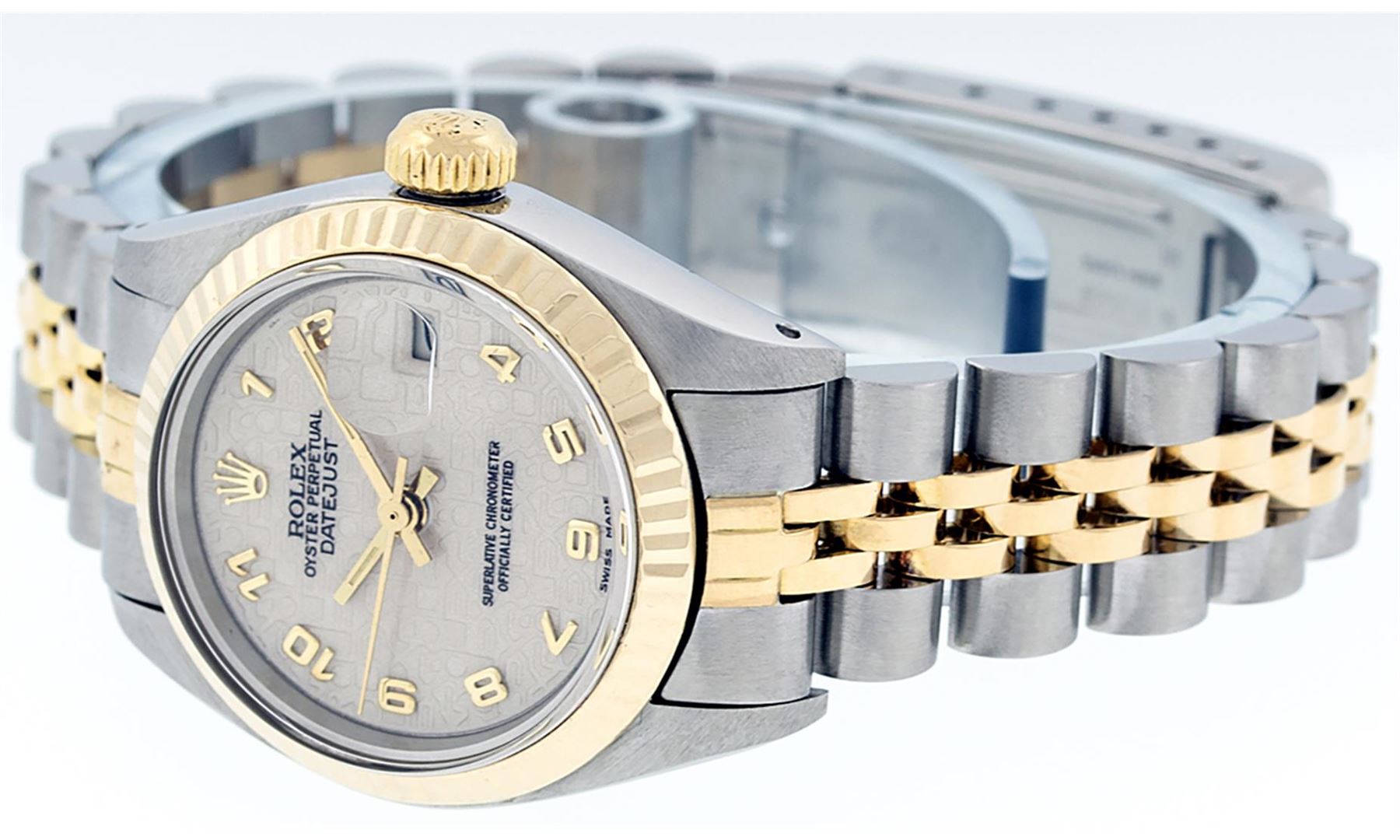 One Ladies Pre Owned 14K Yellow Gold & Stainless Steel Two Tone Rolex Polished, Serviced & Electronically Tested, 14K Yellow Gold & Stainless Steel Case: 26mm, Yellow Gold Crown, Bezel: 14K Yellow Gold Fluted Bezel. Crystal: Plexiglass With Date Window. Hands: Luminescent Hands. Rolex Movement: Automatic Winding Movement 2030. Rolex Dial: Cream Jubilee With Arabic Hour Markers. Date Window: 3 O'Clock Position Date Display, Model: Date. Condition: G-6 Extra Fine. Rolex Bracelet: Two Tone 14K Yellow Gold & Stainless Steel Jubilee Band. Bright Polish. 6.0 Inch Length, Adjustable. Standard Clasp, With Rolex Logo. This Watch Has Been Serviced Time Tested And Is In Excellent Condition It Is Free Of All Scratches And Dents.