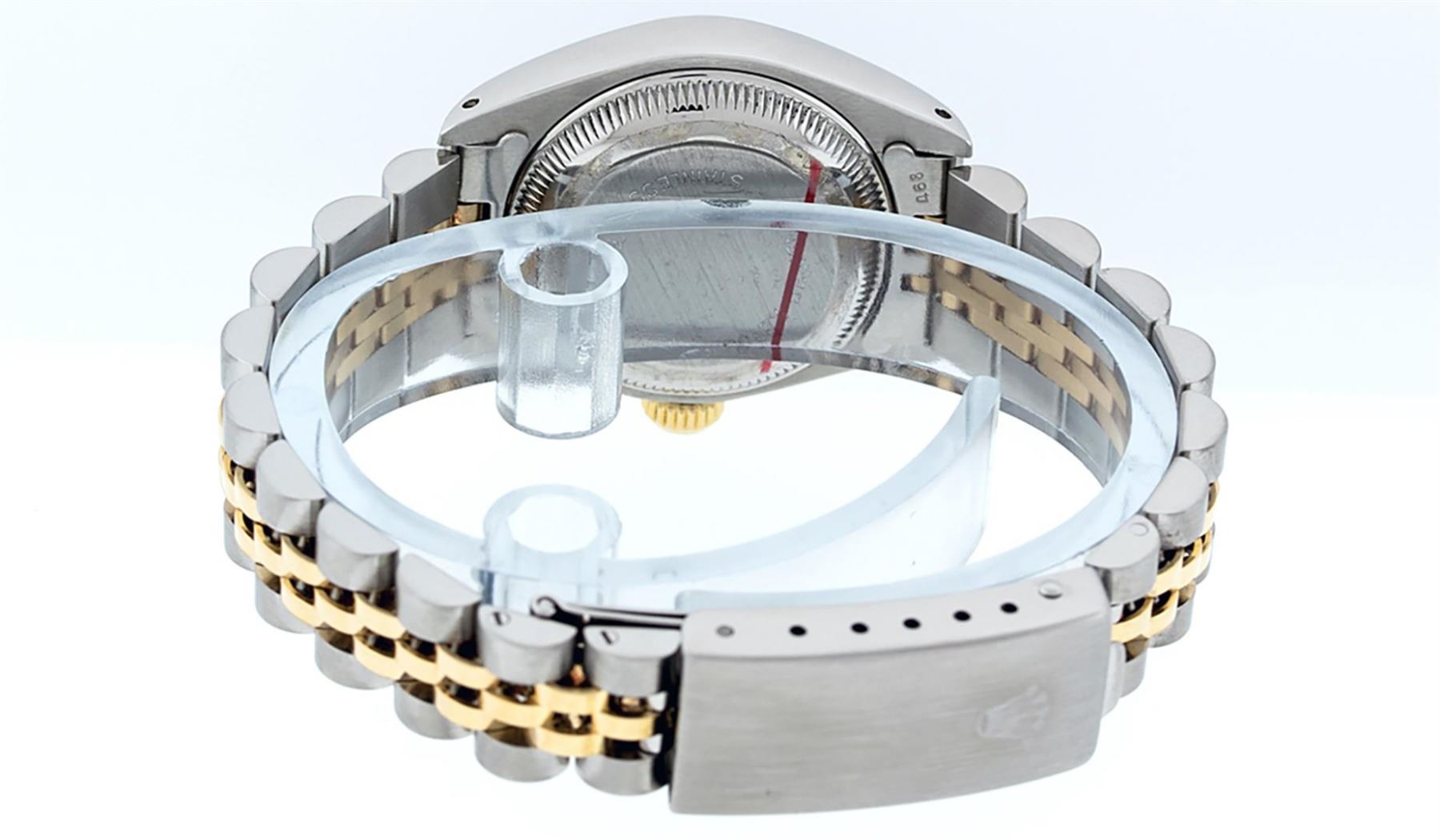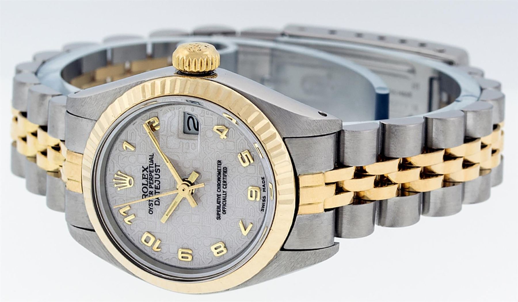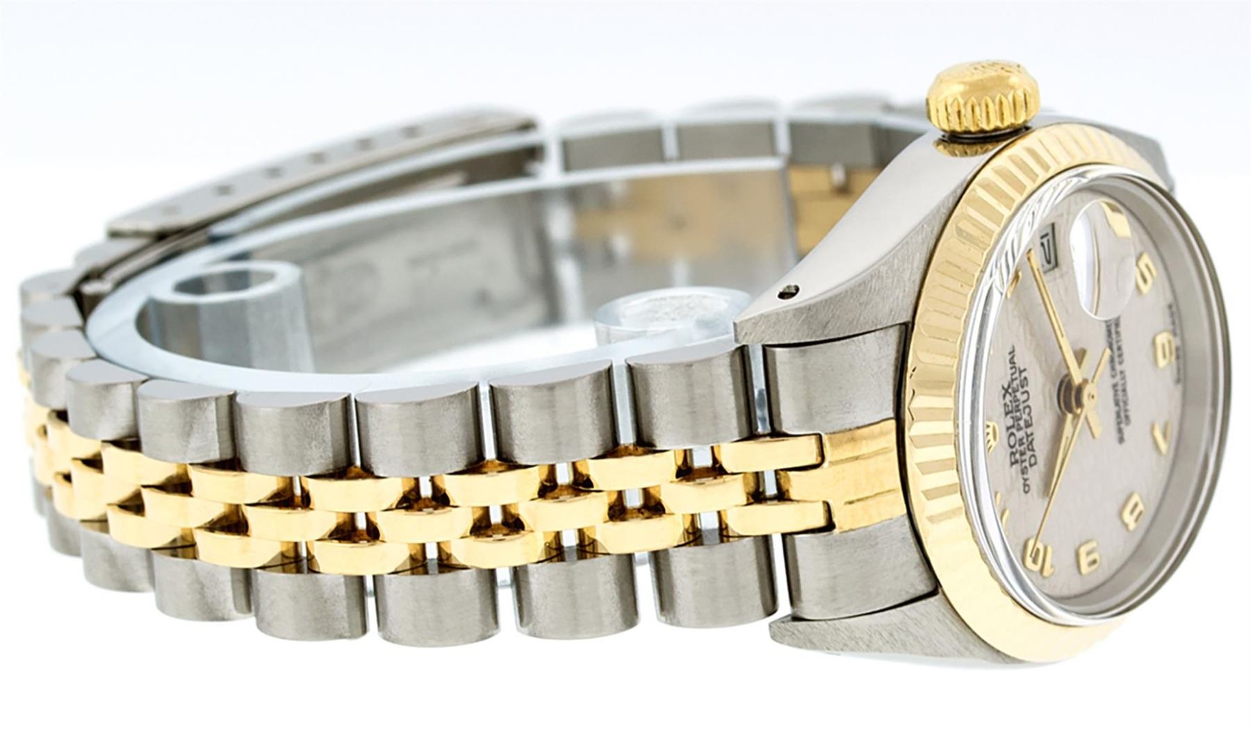 One Ladies Pre Owned 14K Yellow Gold & Stainless Steel Two Tone Rolex Polished, Serviced & Electronically Tested, 14K Yellow Gold & Stainless Steel Case: 26mm, Yellow Gold Crown, Bezel: 14K Yellow Gold Fluted Bezel. Crystal: Plexiglass With Date Window. Hands: Luminescent Hands. Rolex Movement: Automatic Winding Movement 2030. Rolex Dial: Cream Jubilee With Arabic Hour Markers. Date Window: 3 O'Clock Position Date Display, Model: Date. Condition: G-6 Extra Fine. Rolex Bracelet: Two Tone 14K Yellow Gold & Stainless Steel Jubilee Band. Bright Polish. 6.0 Inch Length, Adjustable. Standard Clasp, With Rolex Logo. This Watch Has Been Serviced Time Tested And Is In Excellent Condition It Is Free Of All Scratches And Dents.
