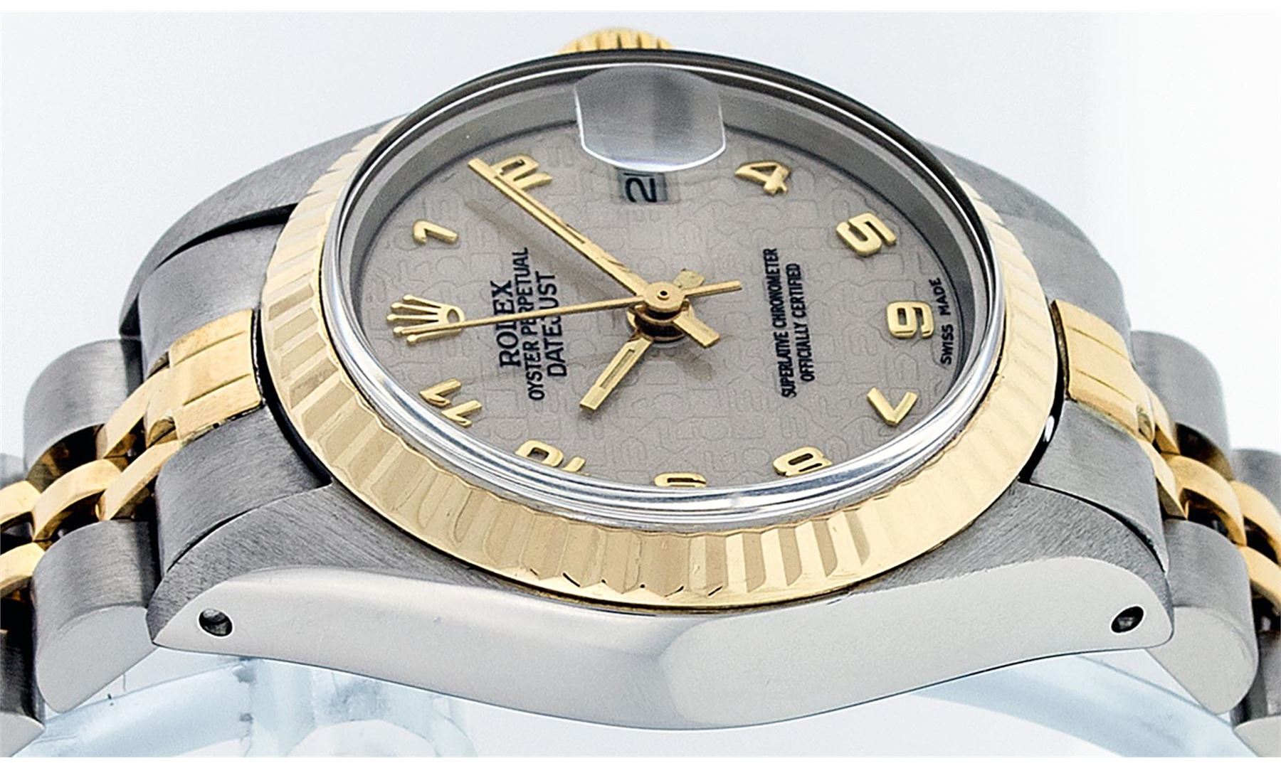 One Ladies Pre Owned 14K Yellow Gold & Stainless Steel Two Tone Rolex Polished, Serviced & Electronically Tested, 14K Yellow Gold & Stainless Steel Case: 26mm, Yellow Gold Crown, Bezel: 14K Yellow Gold Fluted Bezel. Crystal: Plexiglass With Date Window. Hands: Luminescent Hands. Rolex Movement: Automatic Winding Movement 2030. Rolex Dial: Cream Jubilee With Arabic Hour Markers. Date Window: 3 O'Clock Position Date Display, Model: Date. Condition: G-6 Extra Fine. Rolex Bracelet: Two Tone 14K Yellow Gold & Stainless Steel Jubilee Band. Bright Polish. 6.0 Inch Length, Adjustable. Standard Clasp, With Rolex Logo. This Watch Has Been Serviced Time Tested And Is In Excellent Condition It Is Free Of All Scratches And Dents.