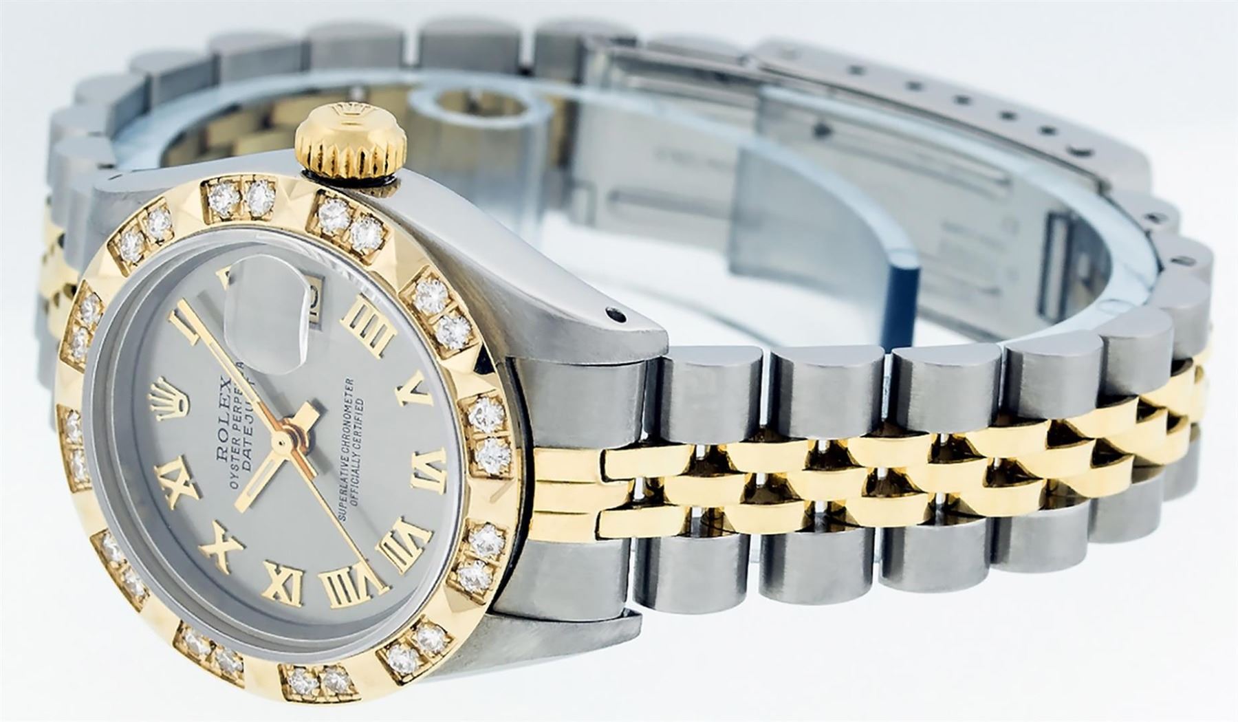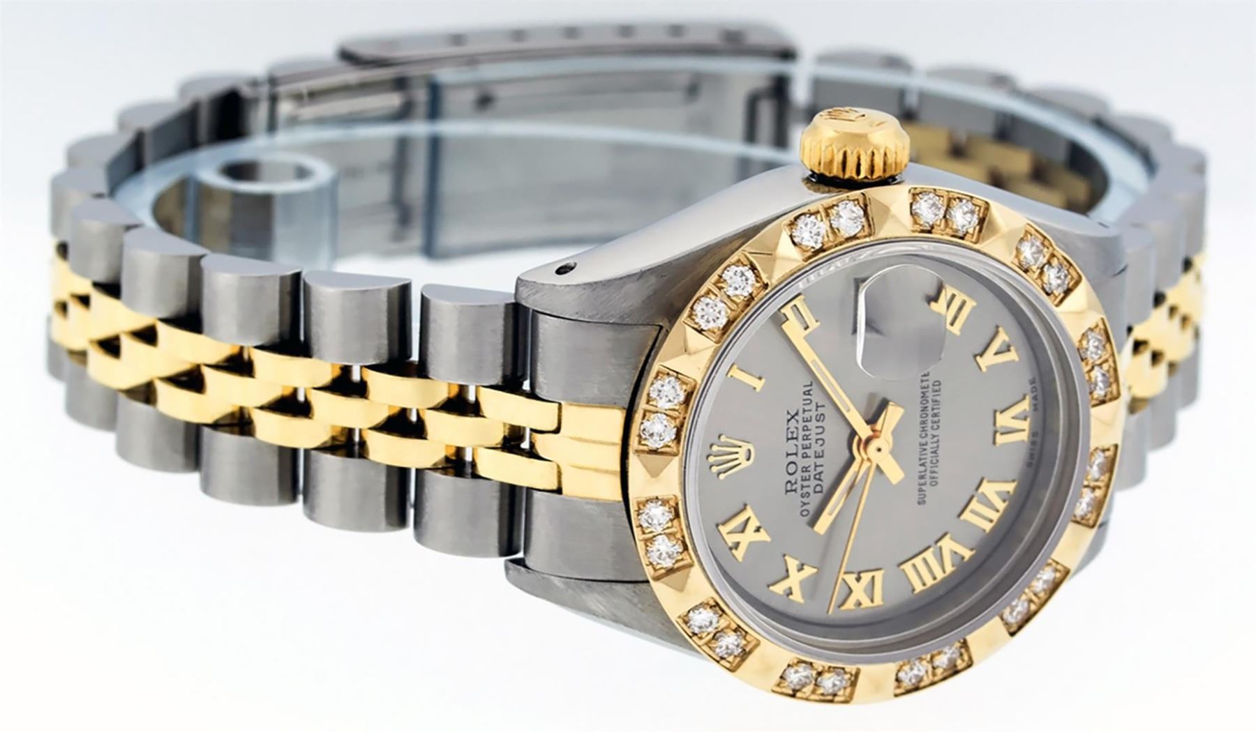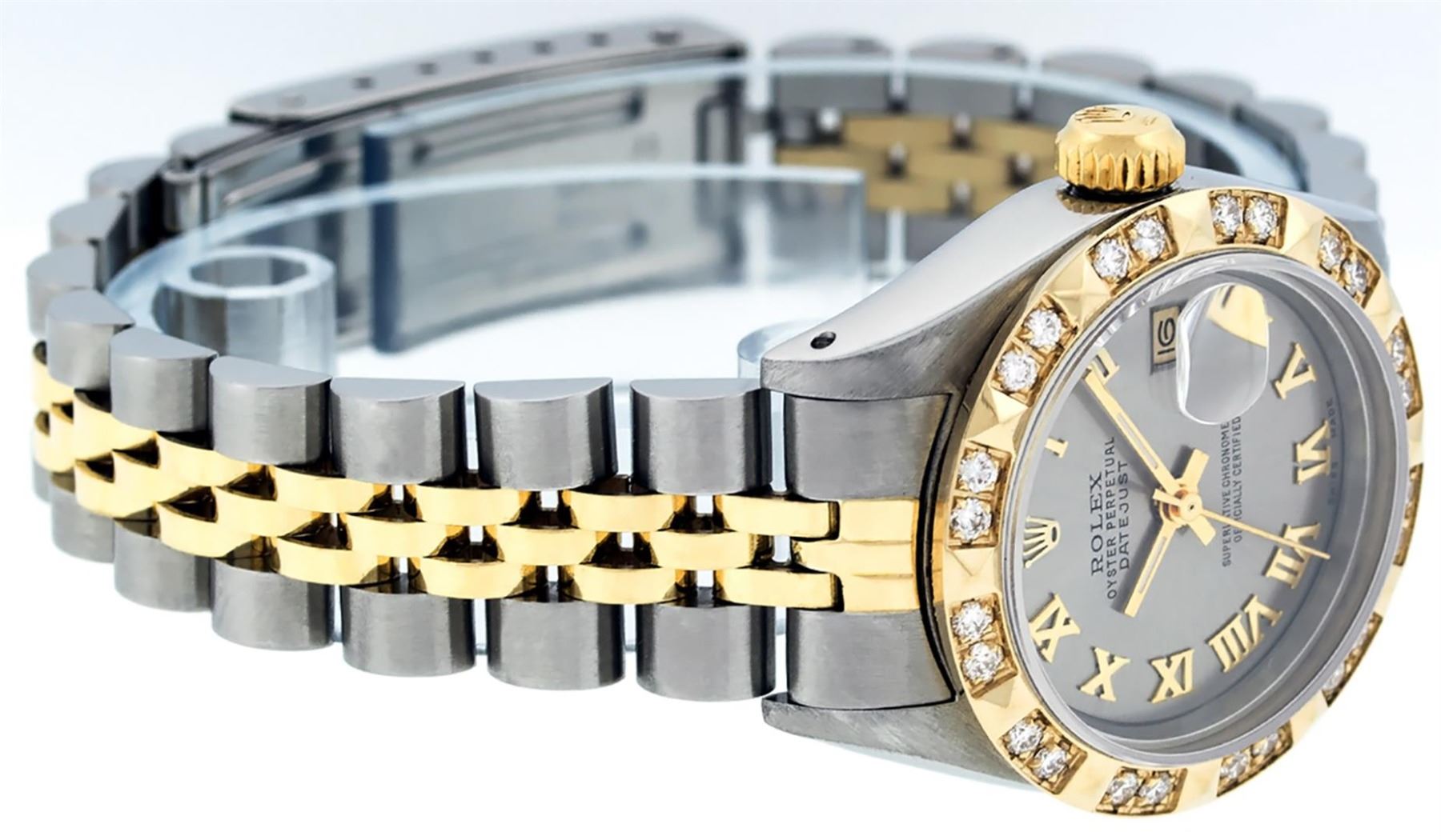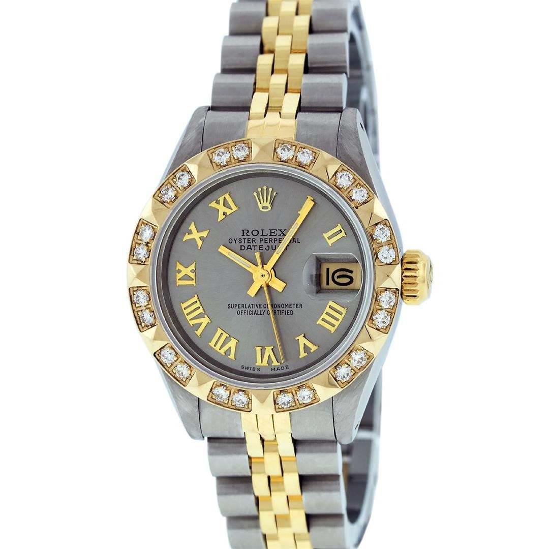 One Ladies Pre Owned 14K Two Tone Yellow Gold & Stainless Steel Rolex Polished, Serviced & Electronically Tested, 14K Yellow Gold & Stainless Steel Case: 26mm, Yellow Gold Crown, Custom Bezel: New 18K Yellow Gold Pyramid Diamond Bezel, Diamond Count: 24 Diamonds In Bezel. Total Weight .50 Carat, Clarity: SI-VS, Color: G to H. Custom Crystal: New Sapphire With Magnified Date Window. Custom Hands: New Luminescent Hands. Rolex Movement: Automatic Winding Movement 2030. Custom Dial: Slate Grey With Roman Hour Markers. Date Window: 3 O'Clock Position Date Display, Model: Datejust. Condition: G-6 Extra Fine The Watch Is In Very Good Condition Free Of All Scratches And Dents. Bracelet: Two Tone 14K Yellow Gold & Stainless Steel Jubilee. Bright Polish. 6.0 Inch Length, Adjustable. Standard Clasp, With Rolex Logo. This Watch Has Been Serviced Time Tested And Is In Excellent Condition It Is Free Of All Scratches And Dents.