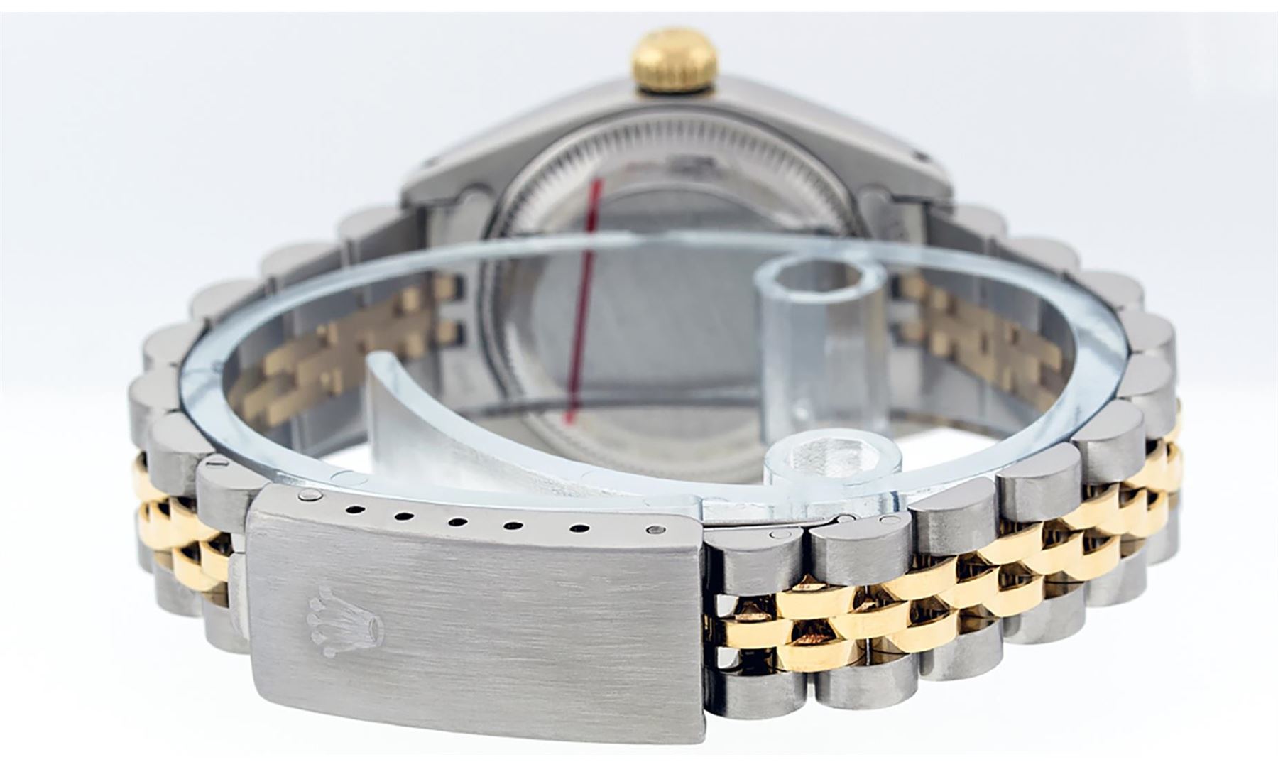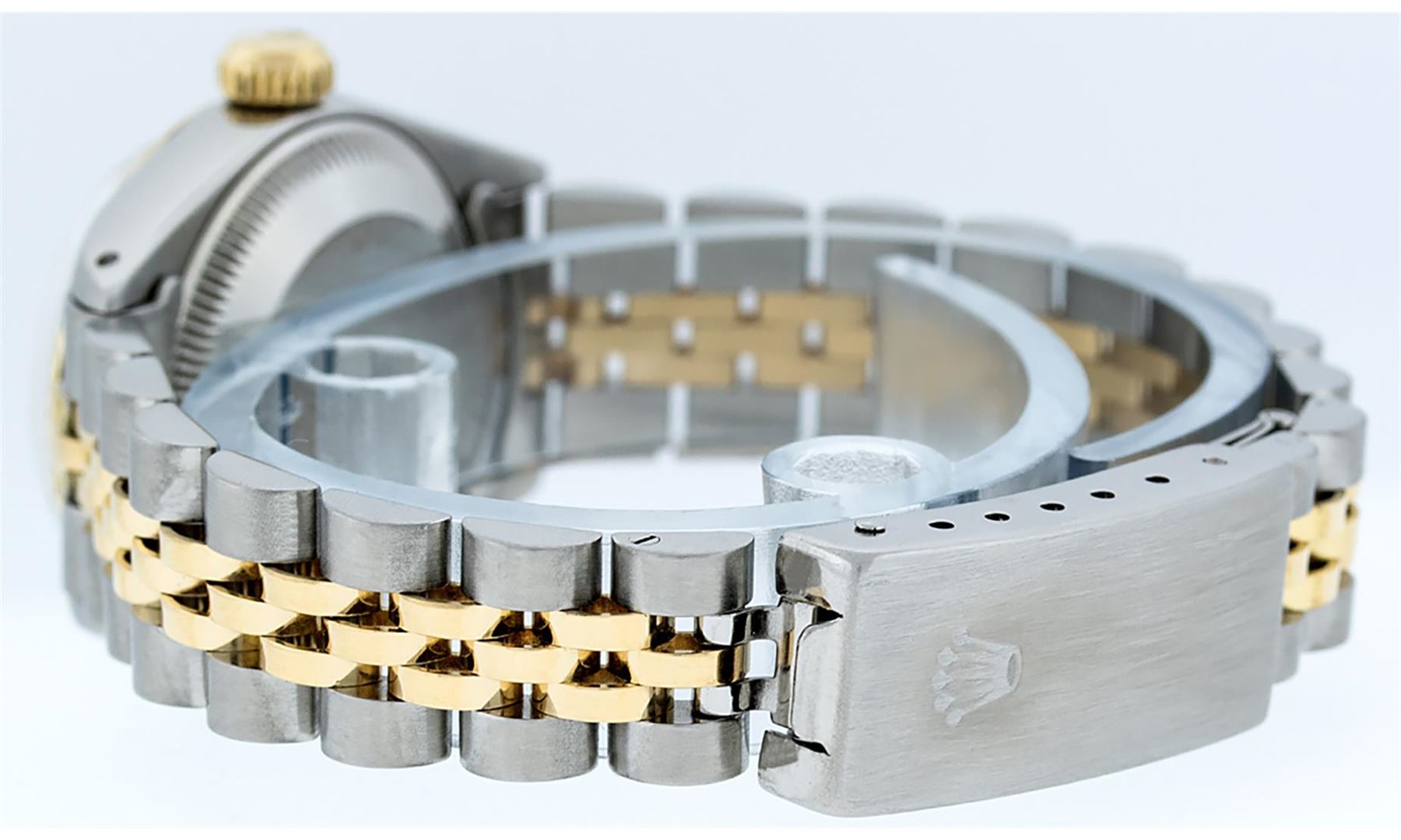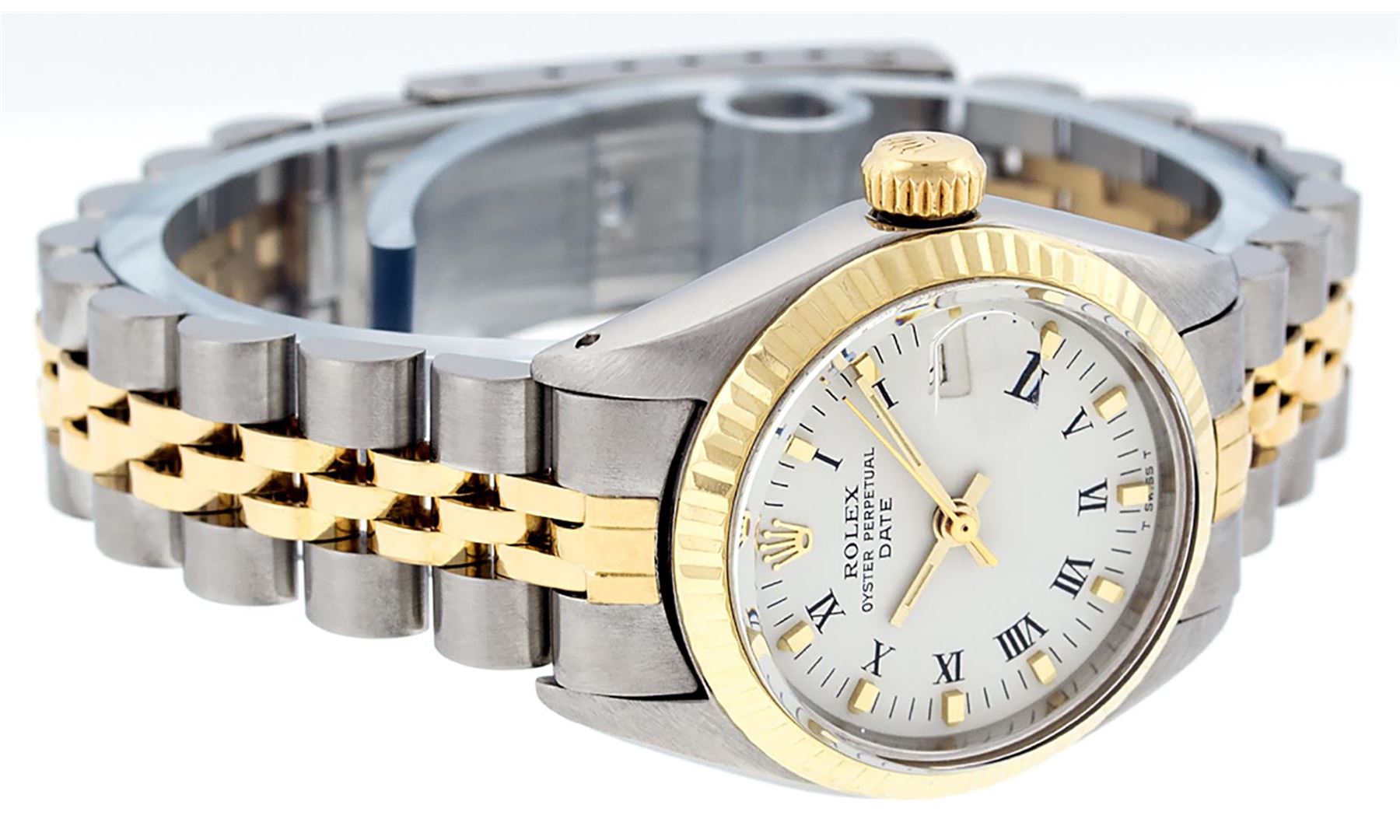 One Ladies Pre Owned Two Tone 14K Yellow Gold And Stainless Steel Rolex Polished, Serviced & Electronically Tested, Rolex 14K Yellow Gold & Stainless Steel Case: 26mm, Rolex Yellow Gold Crown, Rolex Bezel: 14K Yellow Gold Fluted Bezel. Custom Crystal: Plexiglass With Date Window. Hands: Luminescent Hands. Rolex Movement: Automatic Winding Movement 2030. Rolex Dial: White Index With Dash Track & Lumi Dots. Date Window: 3 O'Clock Position Date Display, Model: Datejust. Condition: G-6 Extra Fine. Rolex Bracelet: Two Tone 14K Yellow Gold & Stainless Steel Jubilee Band. Bright Polish. 6.0 Inch Length, Adjustable. Standard Clasp, With Rolex Logo. This Watch Has Been Serviced Time Tested And Is In Excellent Condition It Is Free Of All Scratches And Dents.