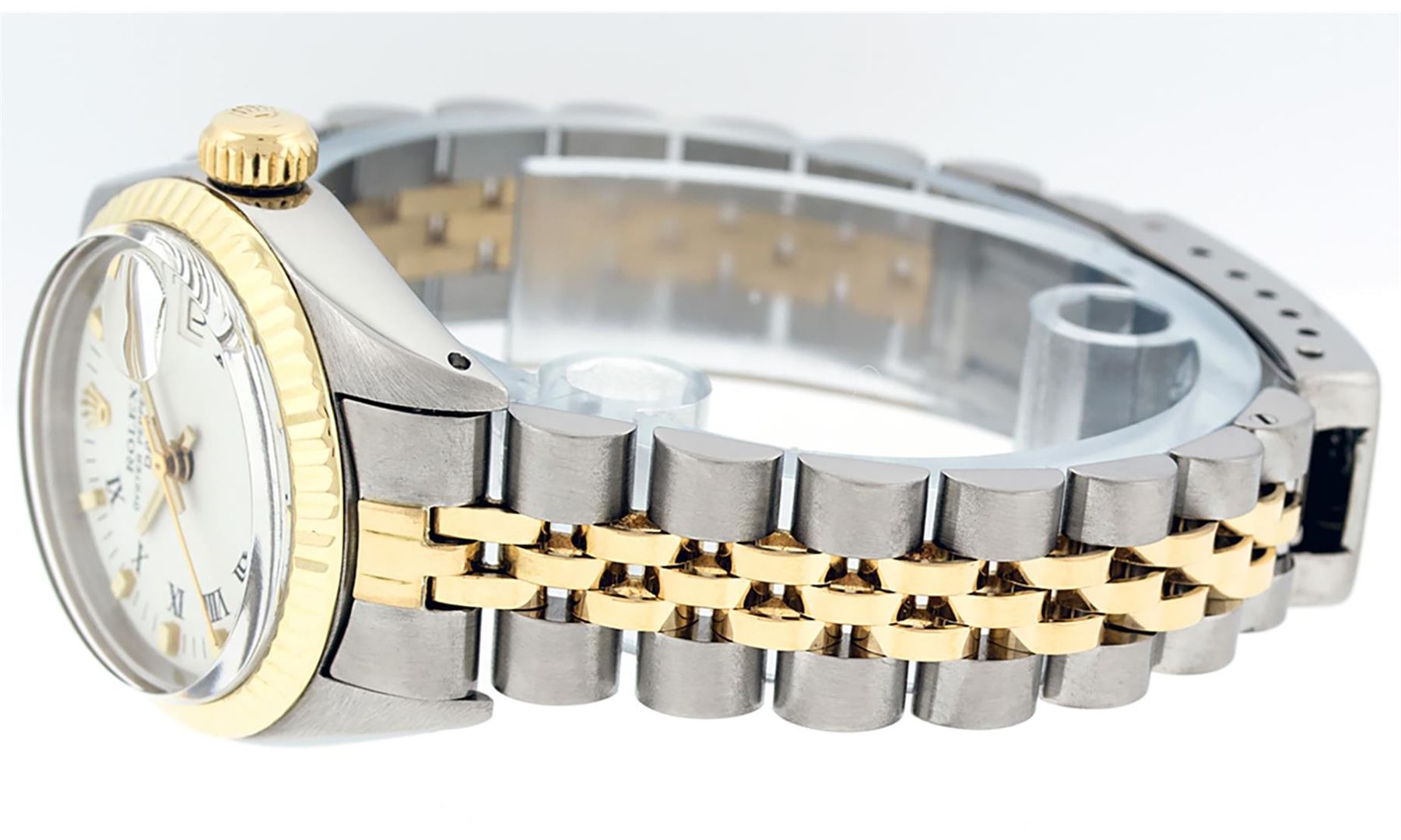 One Ladies Pre Owned Two Tone 14K Yellow Gold And Stainless Steel Rolex Polished, Serviced & Electronically Tested, Rolex 14K Yellow Gold & Stainless Steel Case: 26mm, Rolex Yellow Gold Crown, Rolex Bezel: 14K Yellow Gold Fluted Bezel. Custom Crystal: Plexiglass With Date Window. Hands: Luminescent Hands. Rolex Movement: Automatic Winding Movement 2030. Rolex Dial: White Index With Dash Track & Lumi Dots. Date Window: 3 O'Clock Position Date Display, Model: Datejust. Condition: G-6 Extra Fine. Rolex Bracelet: Two Tone 14K Yellow Gold & Stainless Steel Jubilee Band. Bright Polish. 6.0 Inch Length, Adjustable. Standard Clasp, With Rolex Logo. This Watch Has Been Serviced Time Tested And Is In Excellent Condition It Is Free Of All Scratches And Dents.